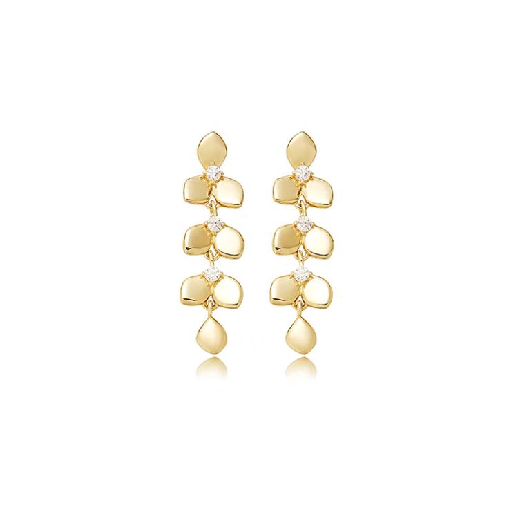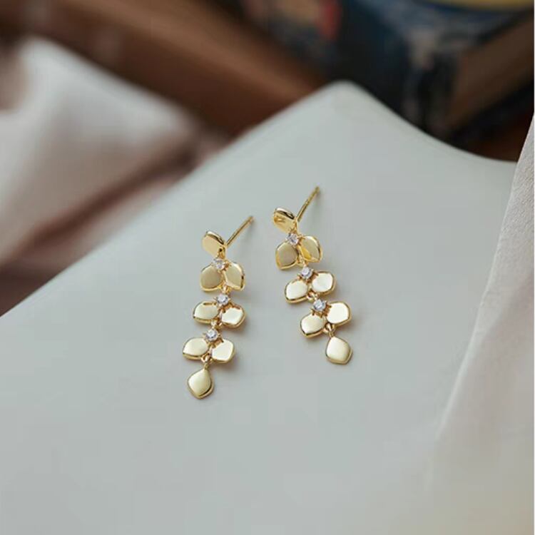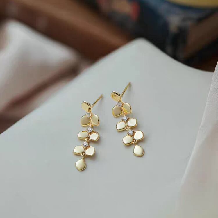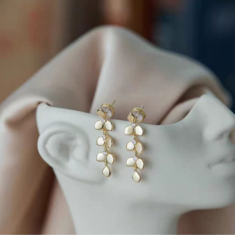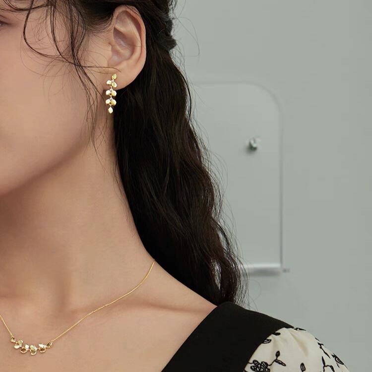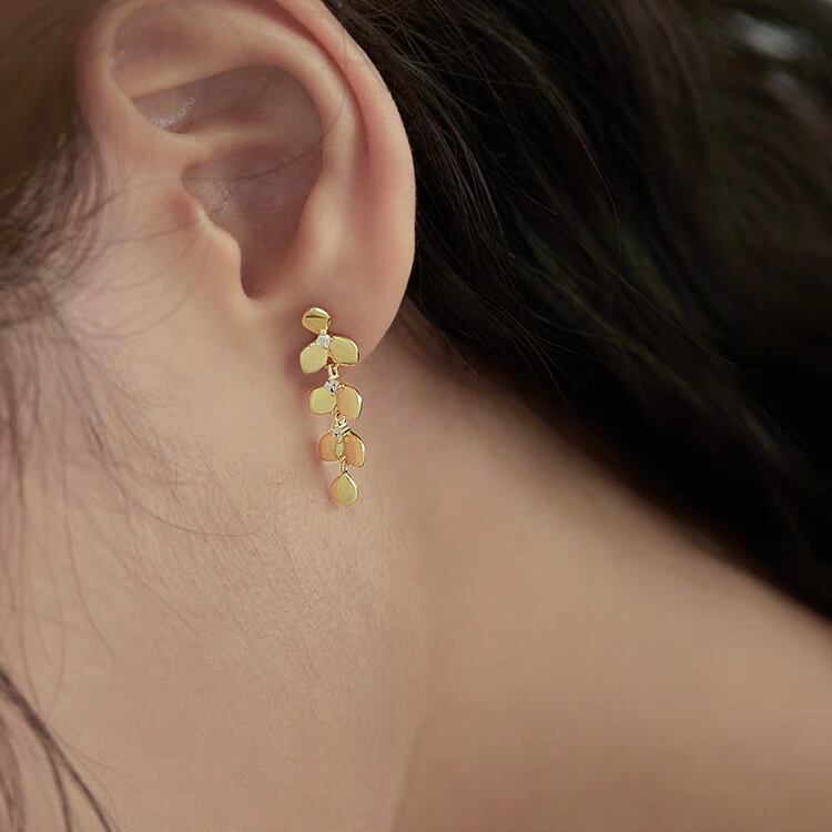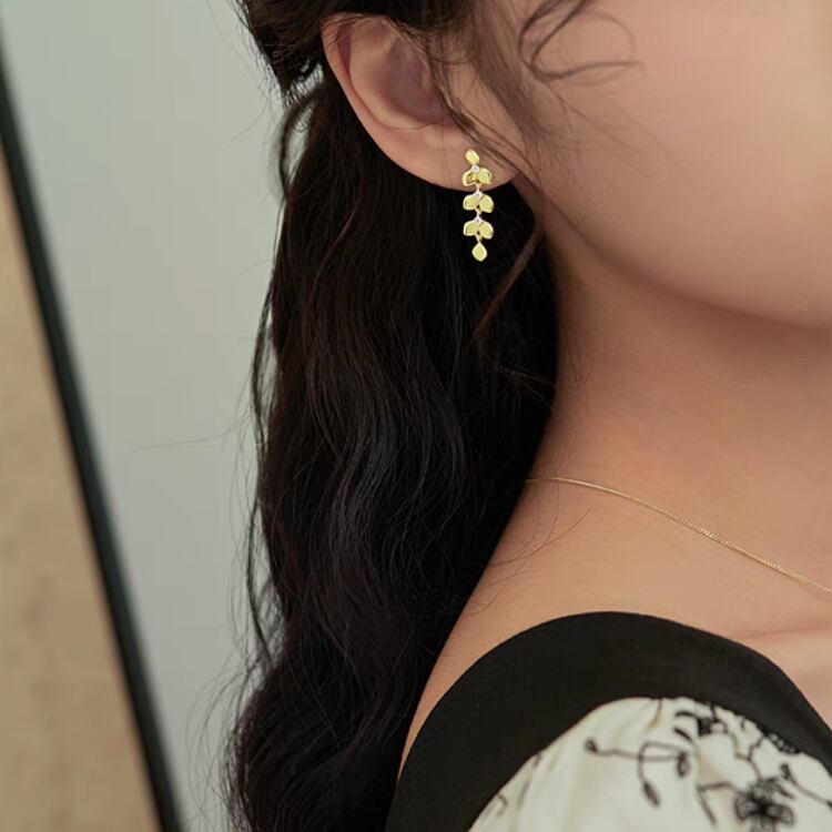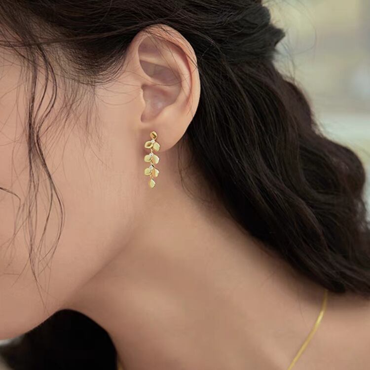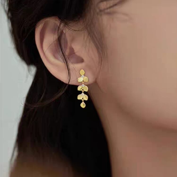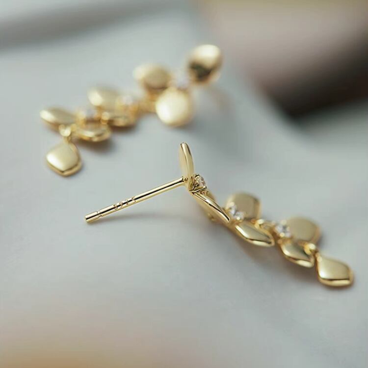 美しいリーフ型モチーフが耳元で優雅に揺れ、小さくても華やかさを感じさせる一品です。