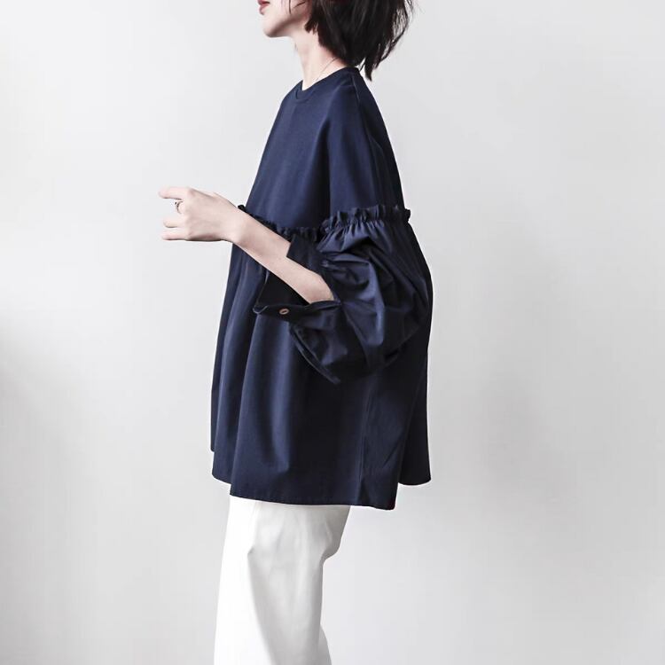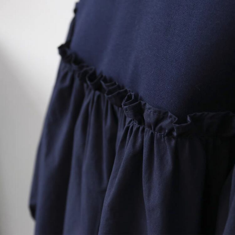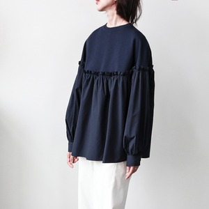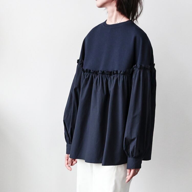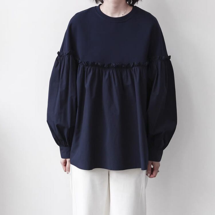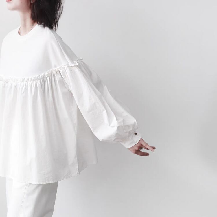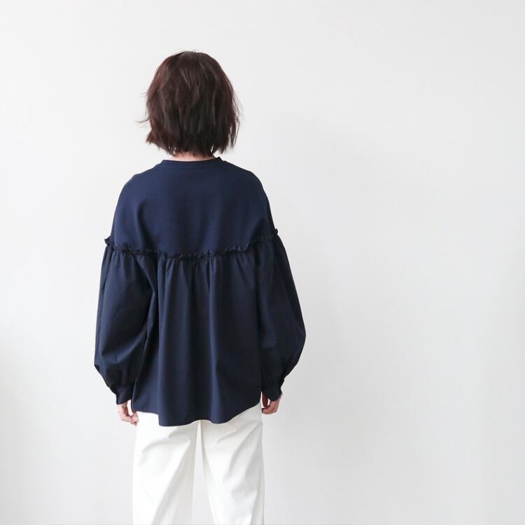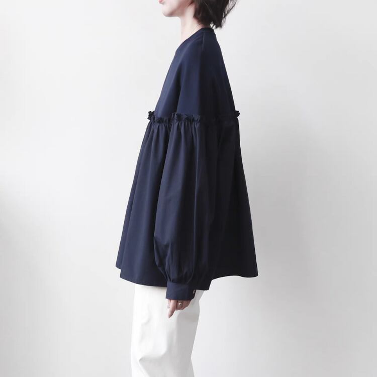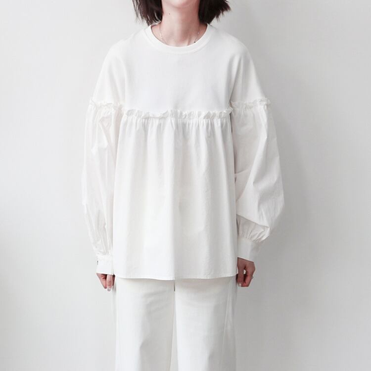 バスト位置での布帛切り替えが施されており、まるでカットソーとブラウスの良いとこ取りのようなデザインです。