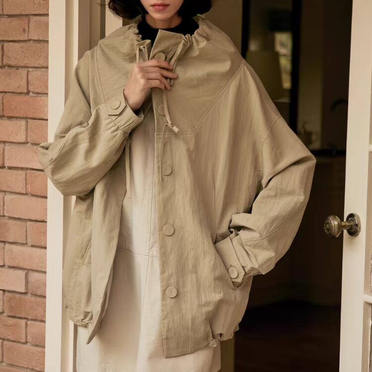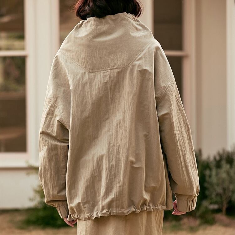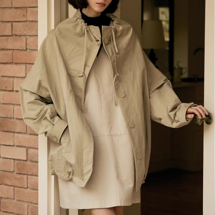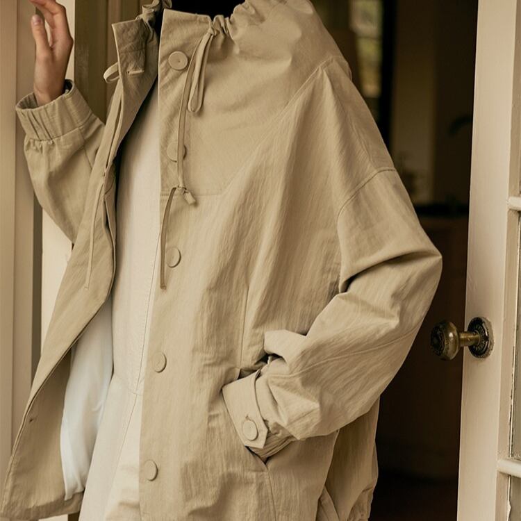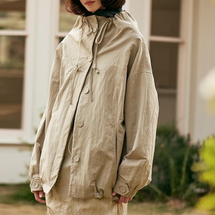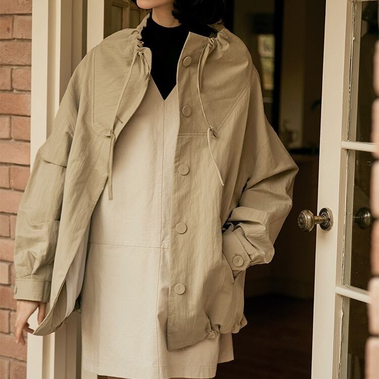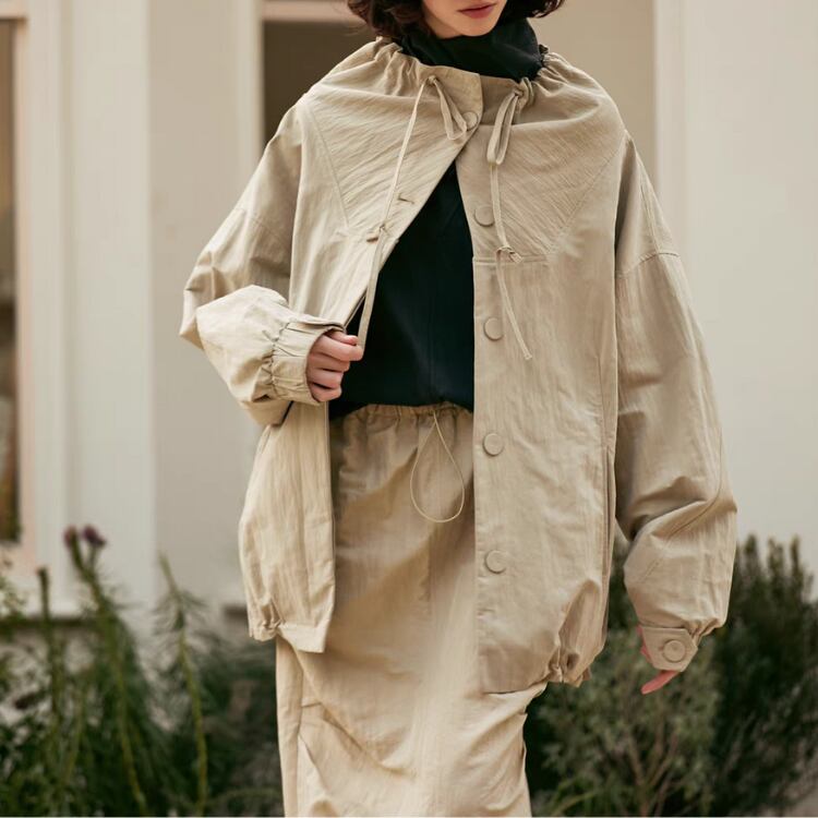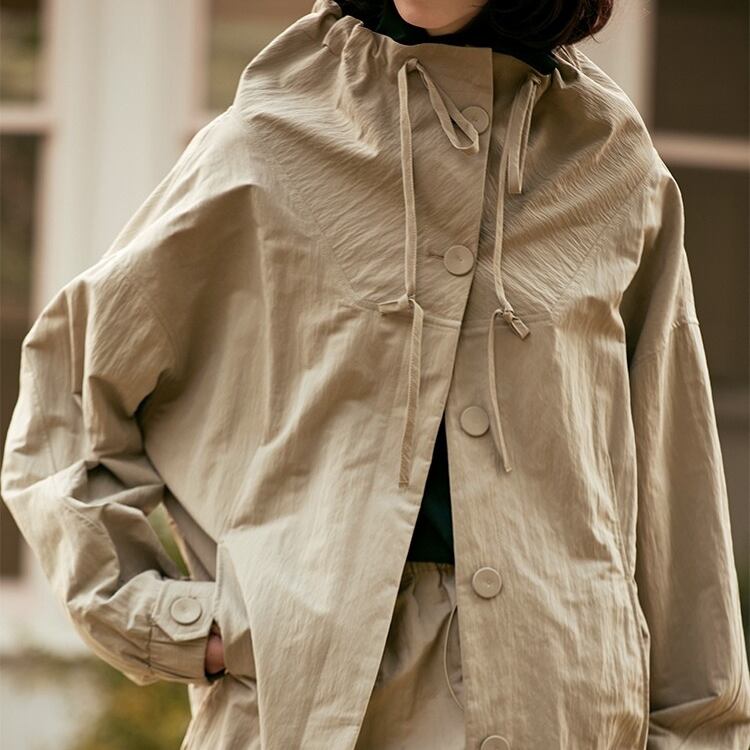 ドローストリングによってギャザーを寄せられるスタンドカラーが、シックで洗練された印象を与えます。