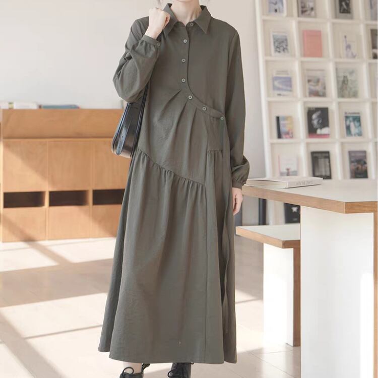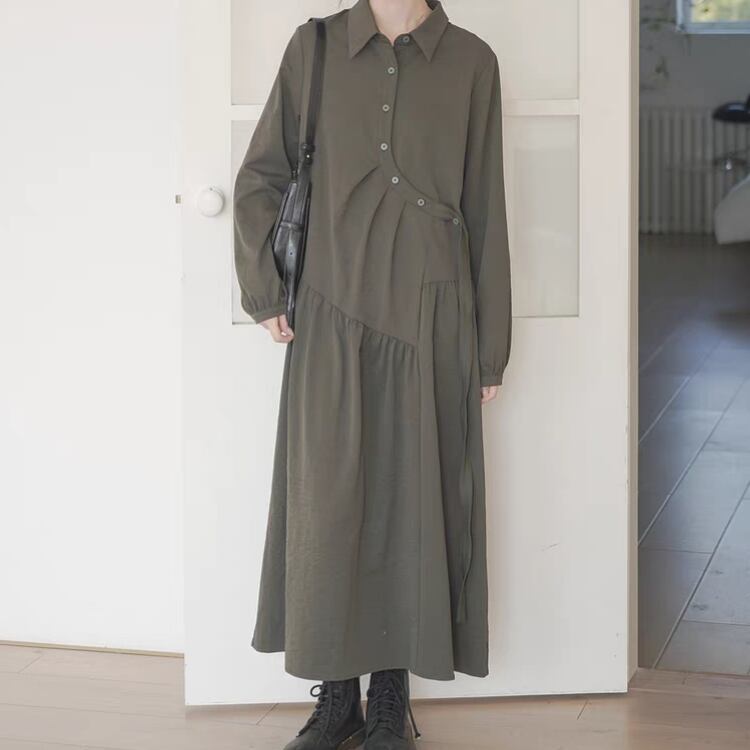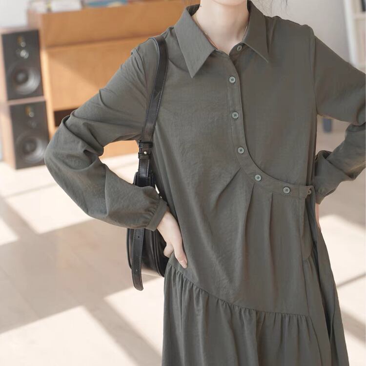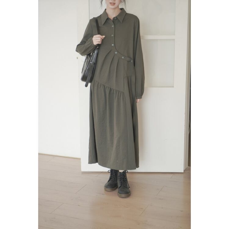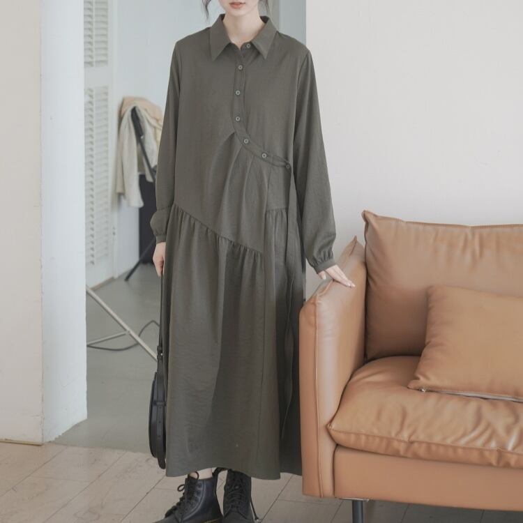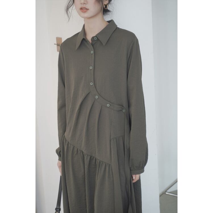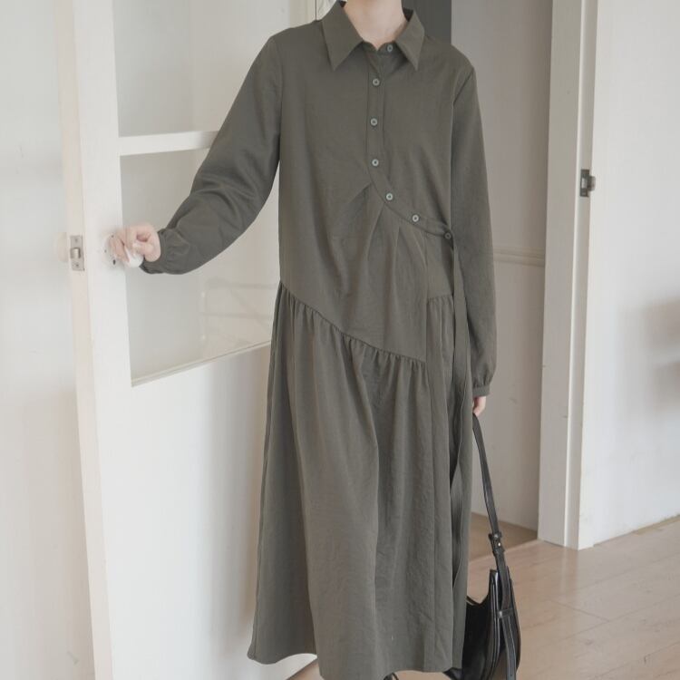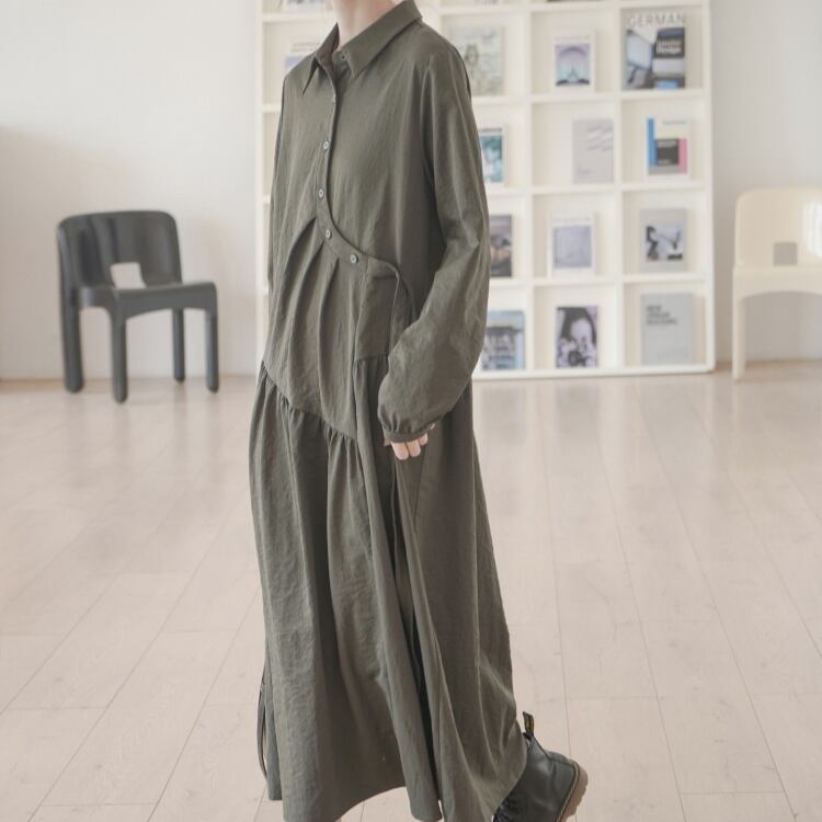 アシンメトリーラウンド前立て斜めギャザー切り替えシャツワンピース 1016
