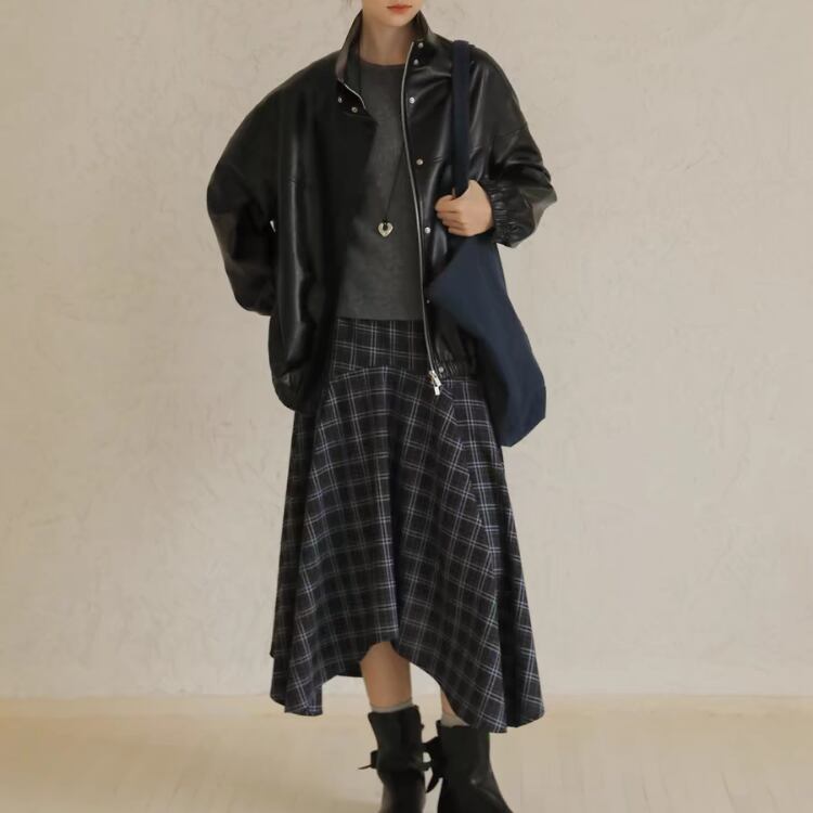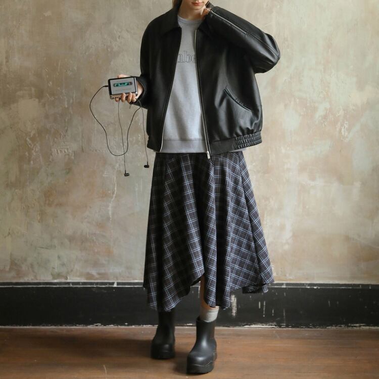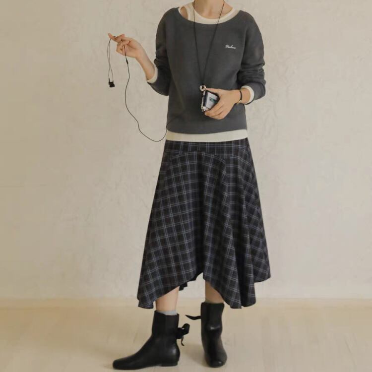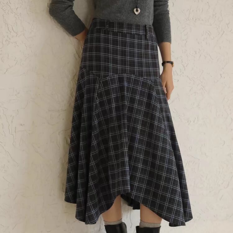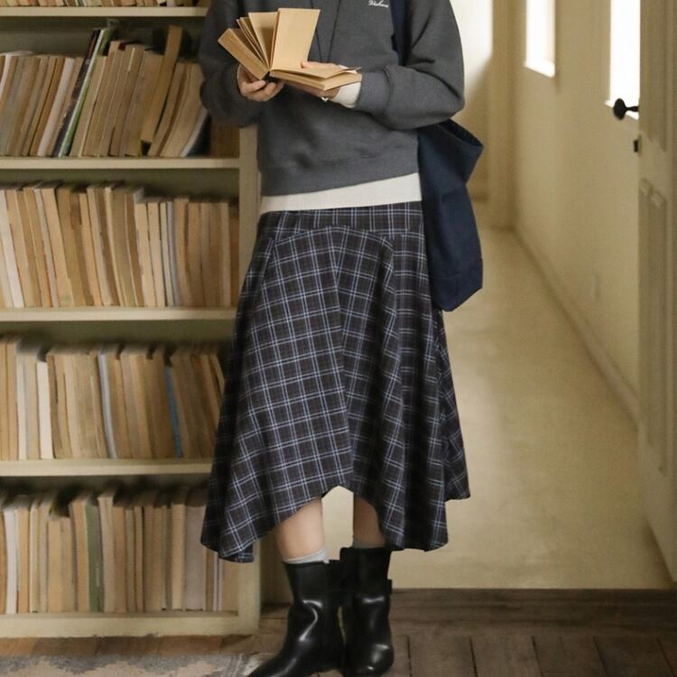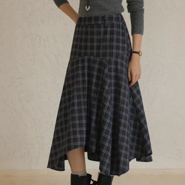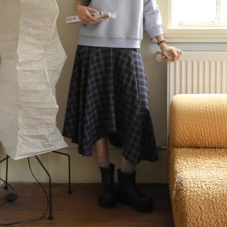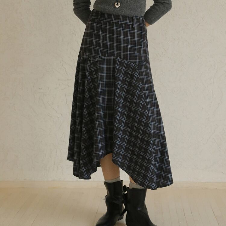 チェック柄ヨークラウンド切り替えイレギュラーヘムフレアースカート 1042