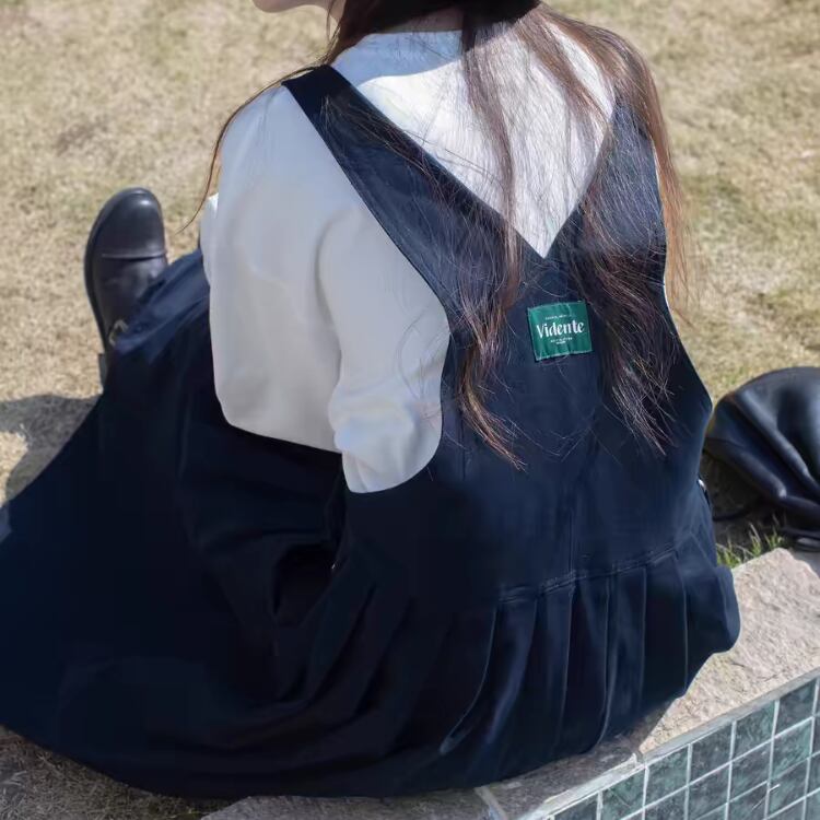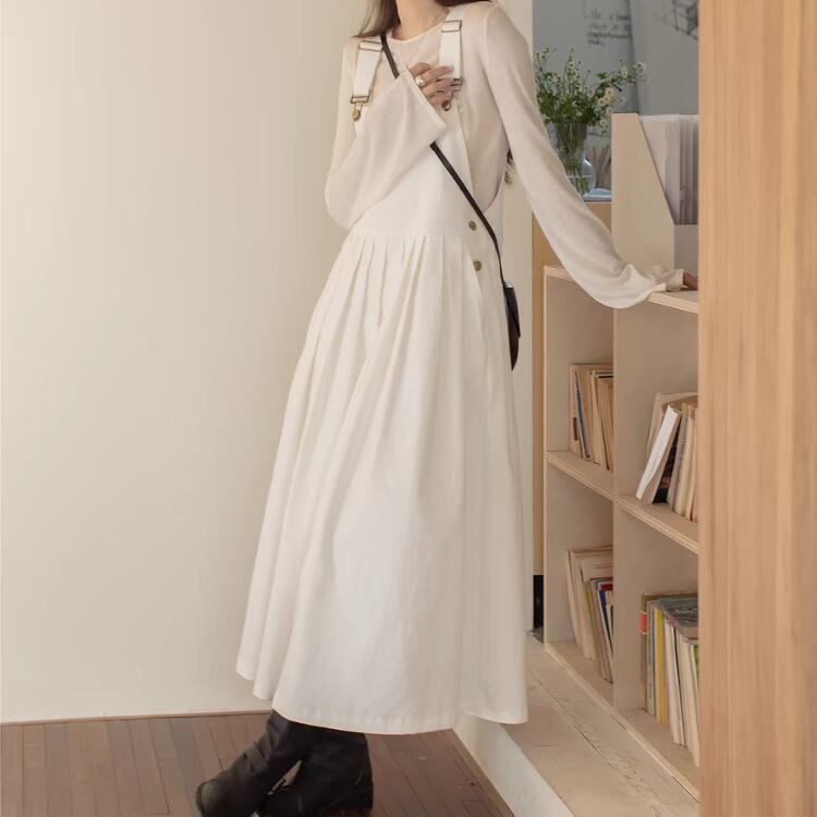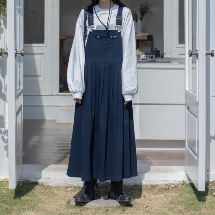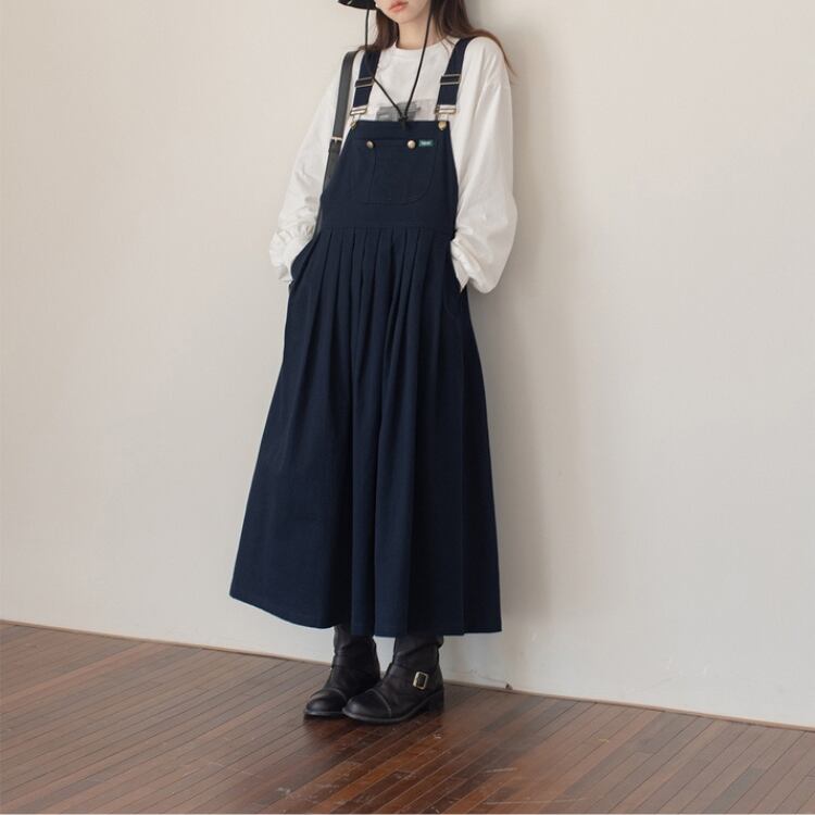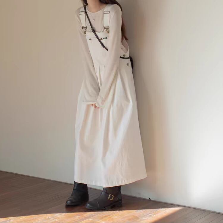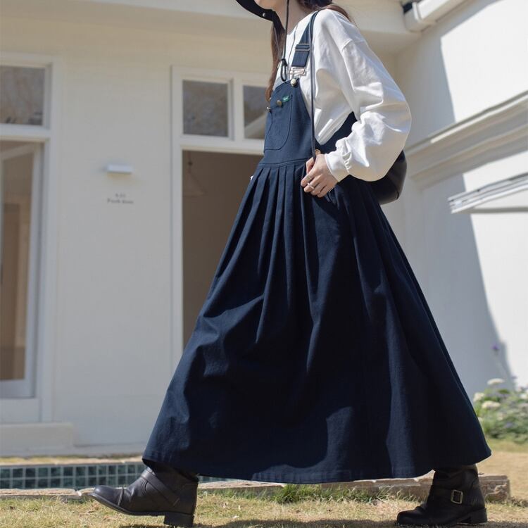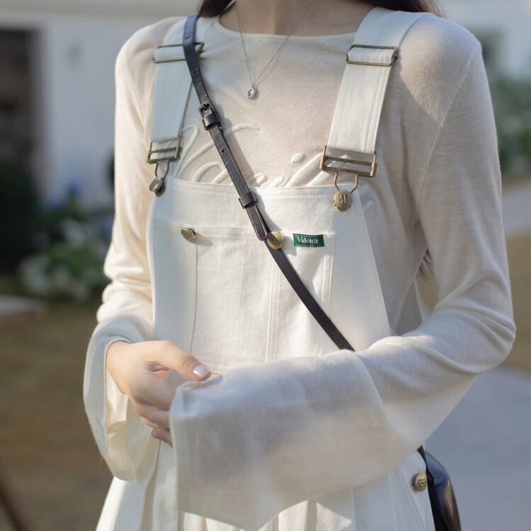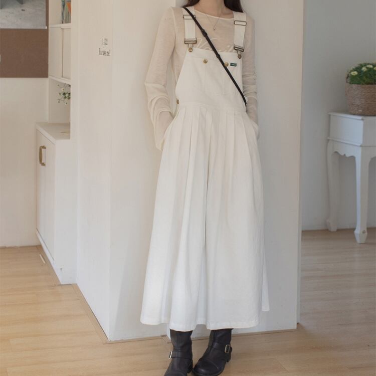 胸当て付きのオーバーオール風スタイルは、カジュアルながらもおしゃれな印象を与え、デイリー使いにぴったり。