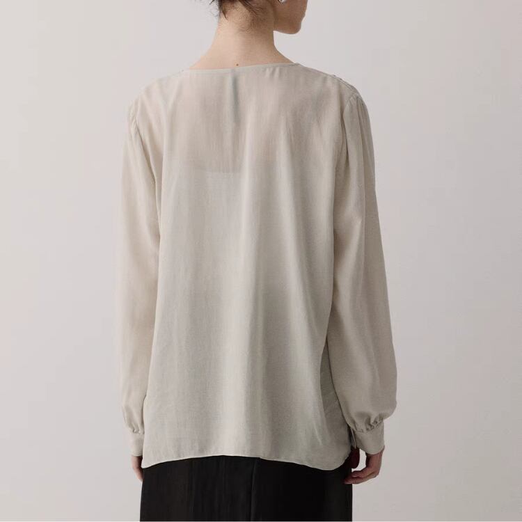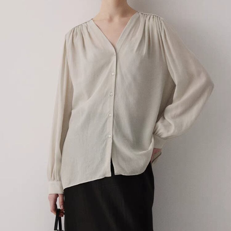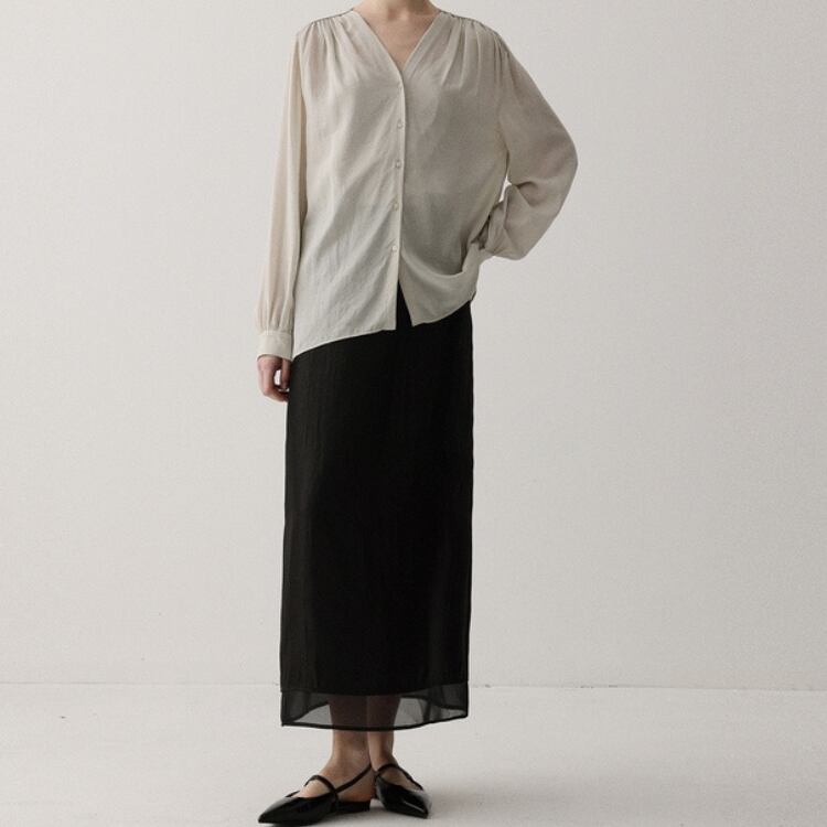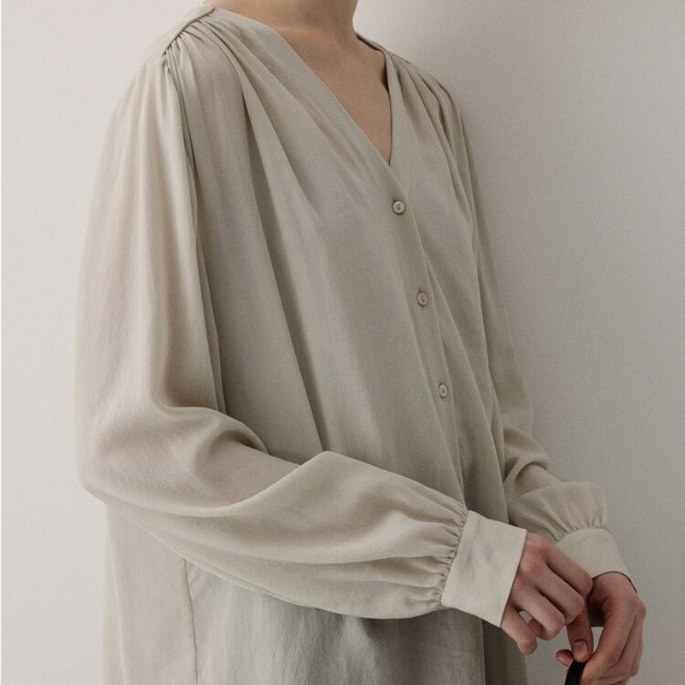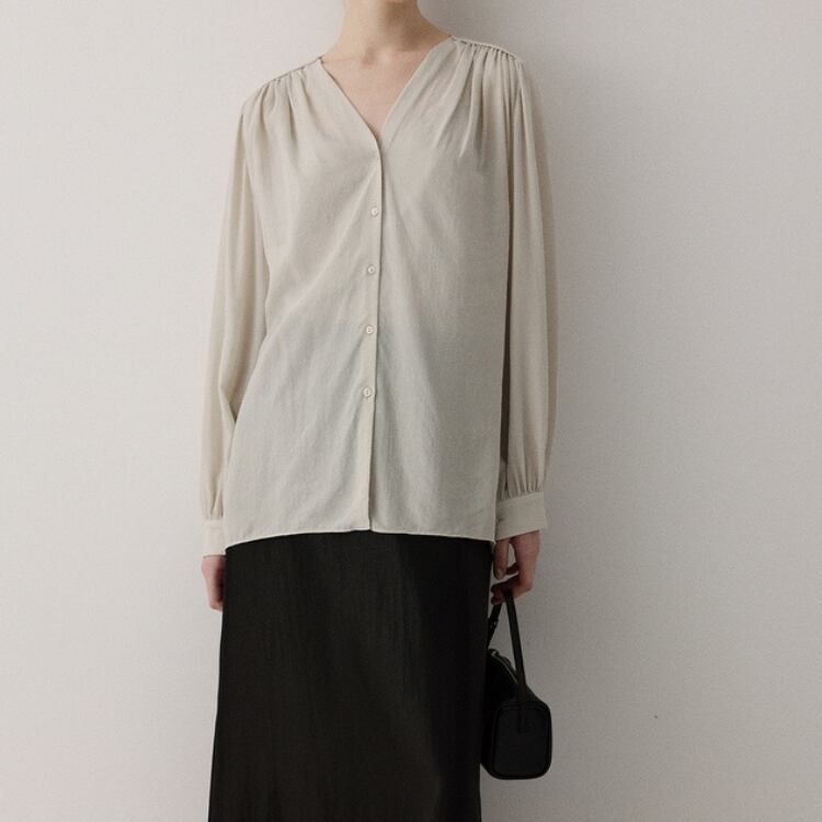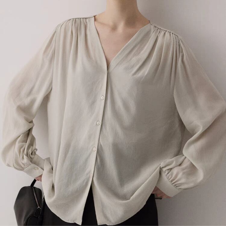 シアー生地ショルダーギャザーVネックブラウス 1051