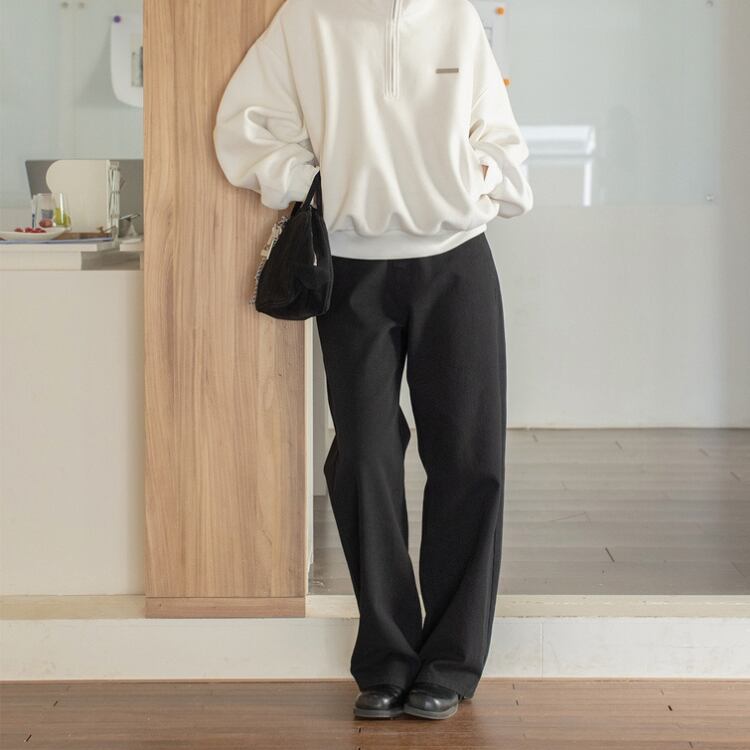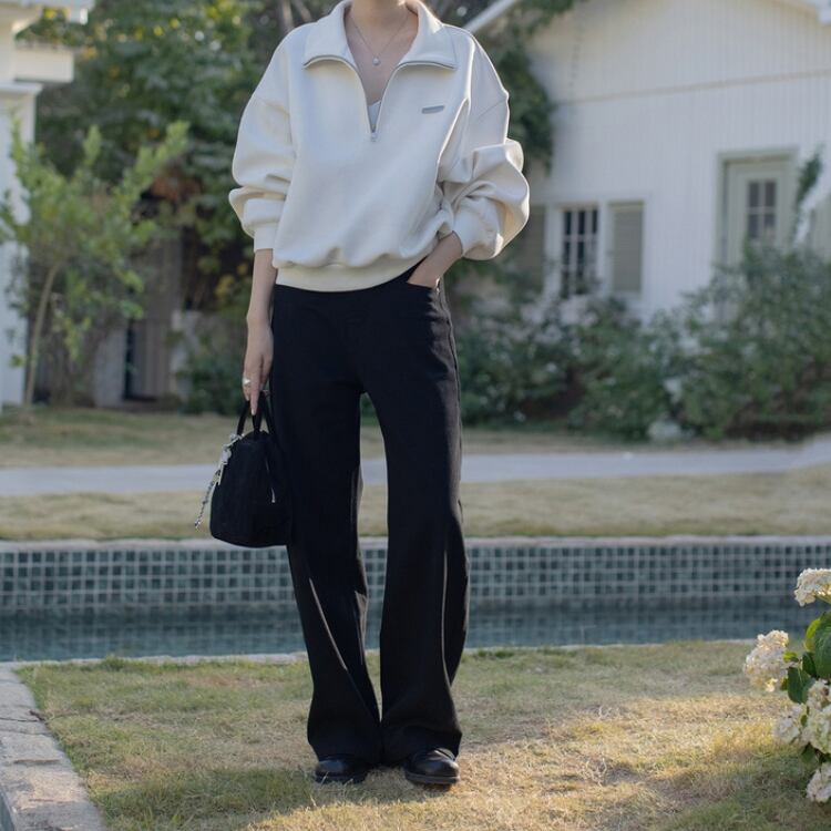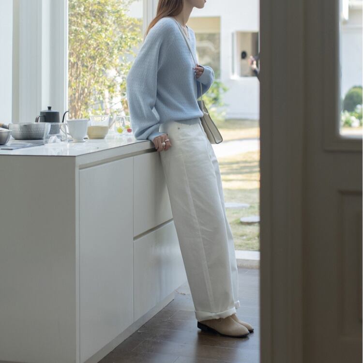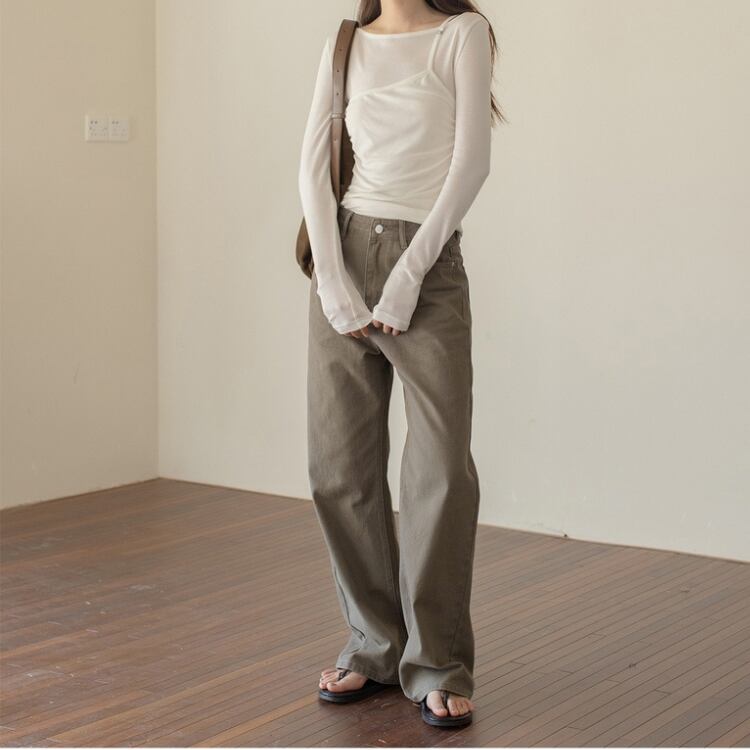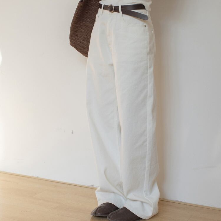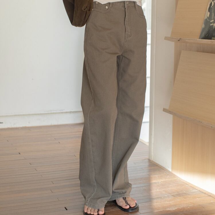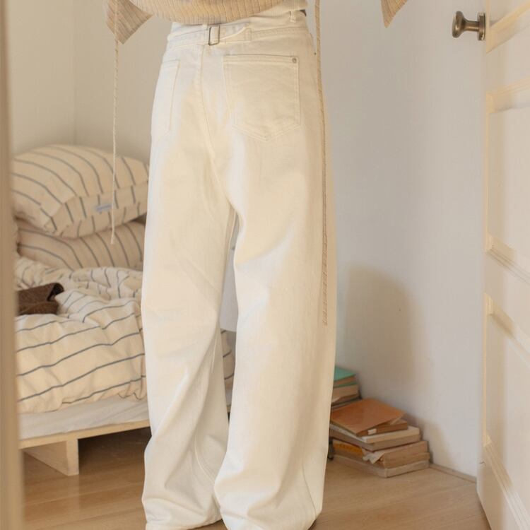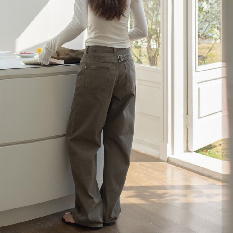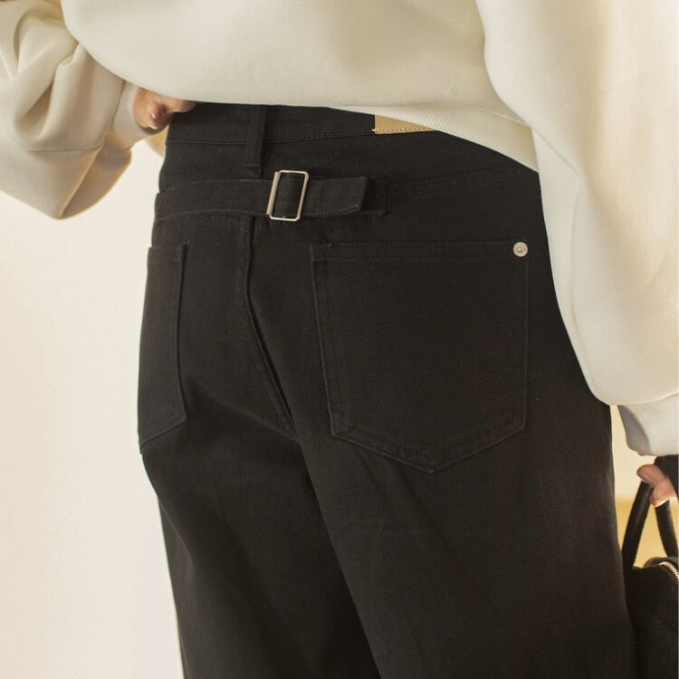 腰の後ろにシンチバックを施したこのパンツは、シンプルなデザインに絶妙なアクセントを加えています。