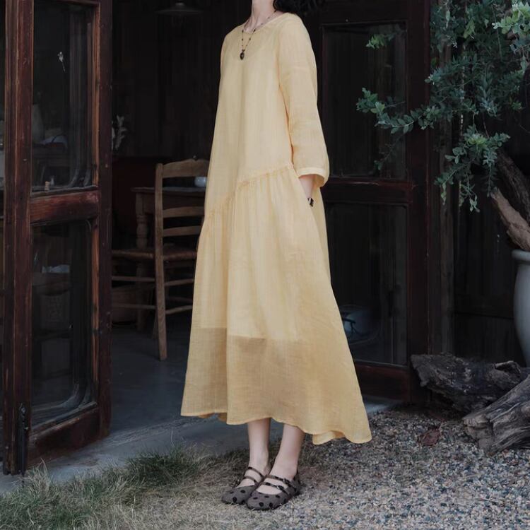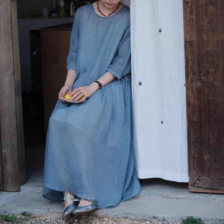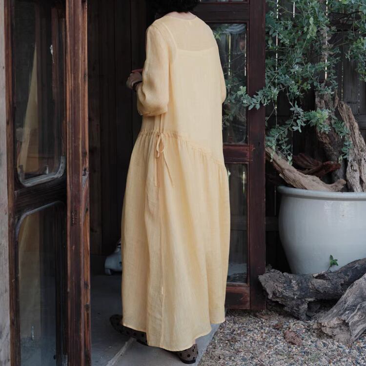薄くてほんのり透ける生地を使用したこのワンピースは、ローウエスト位置に斜めにギャザー切り替えを施しており、女性らしさを引き立てます。