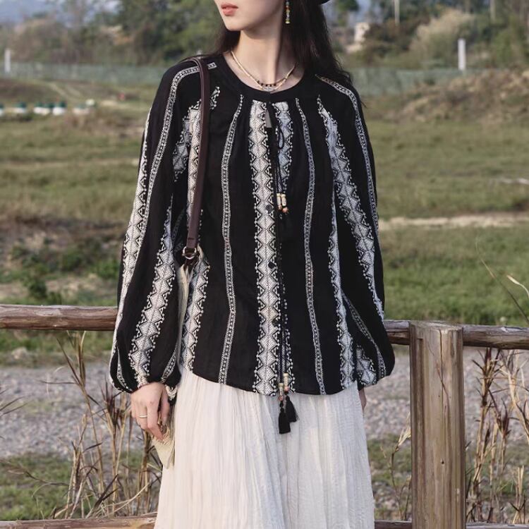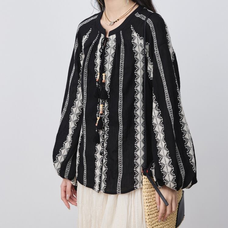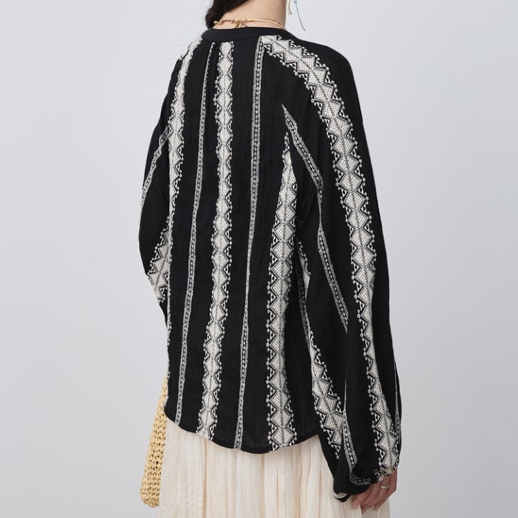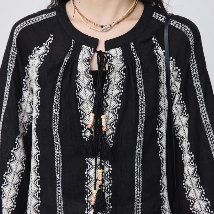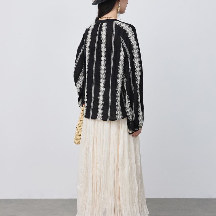 エンブロイダリーストライプ柄ラグランスリーブスモックブラウス 1077
