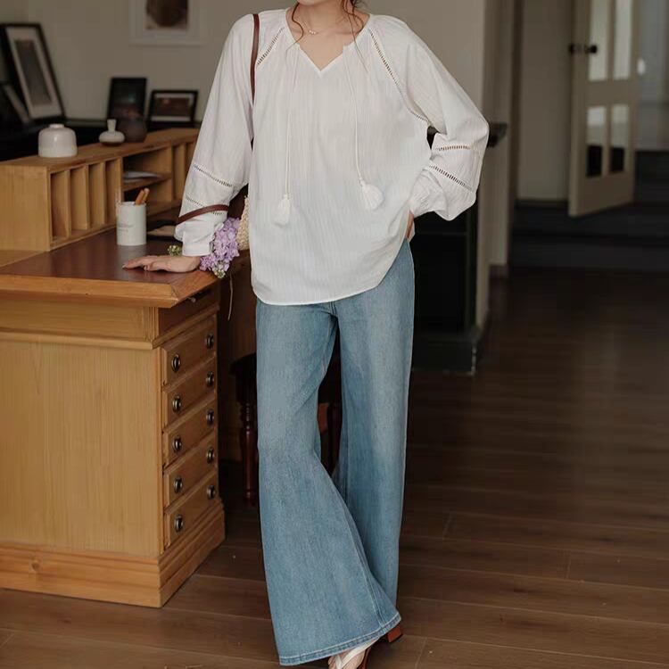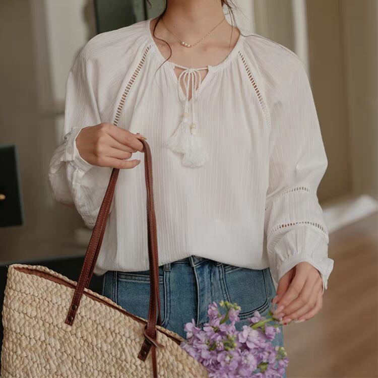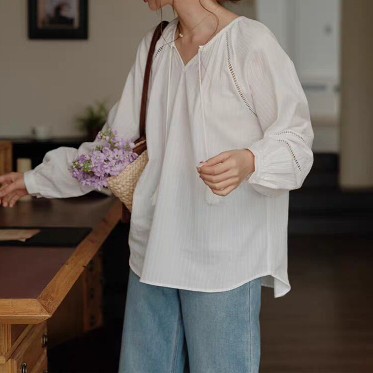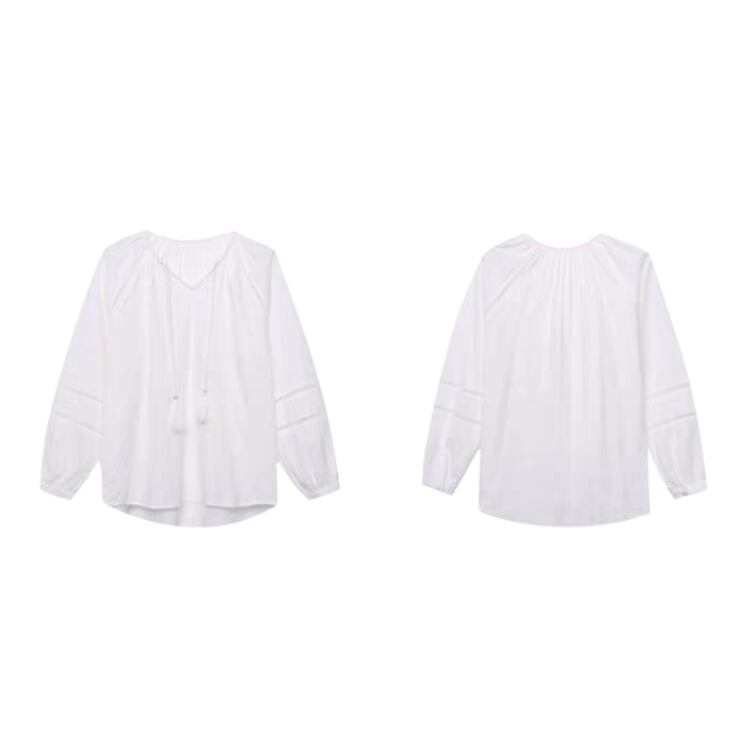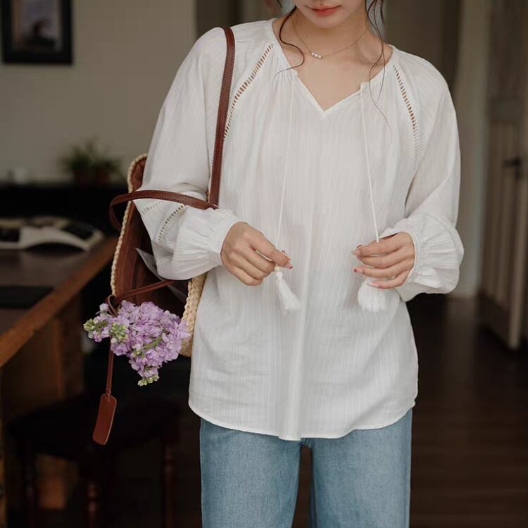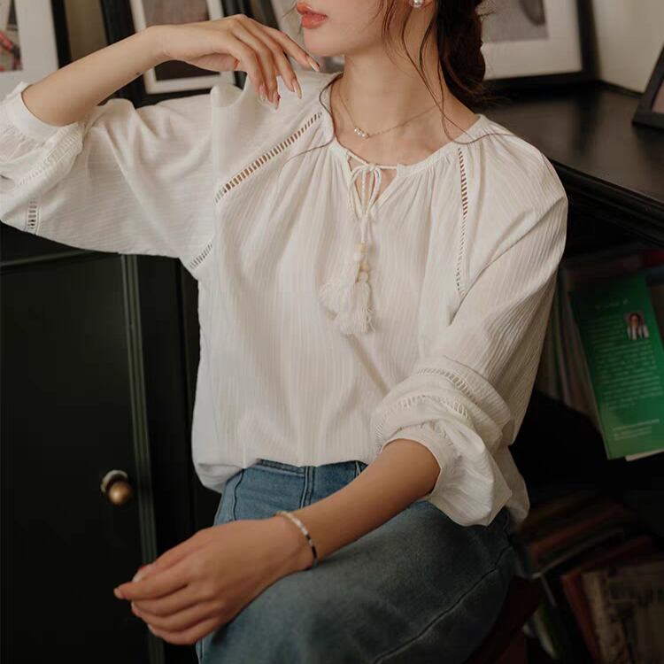 タッセルリボン付きネックはしごレースラグランスリーブブラウス 1121