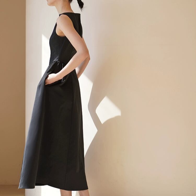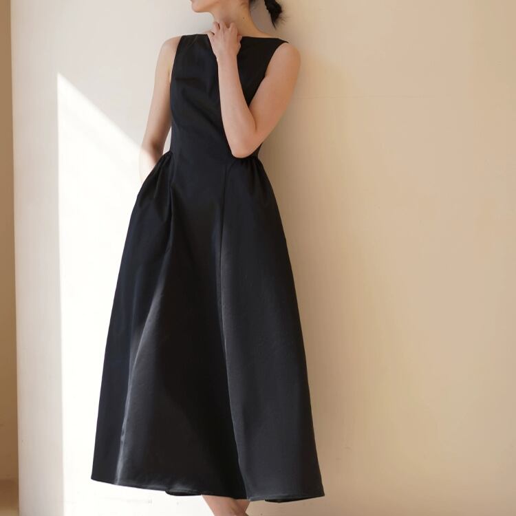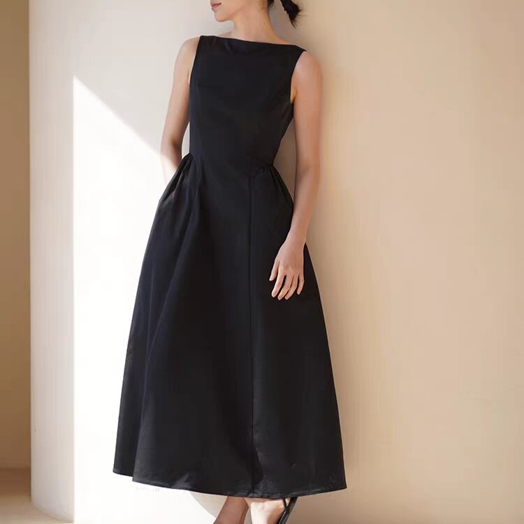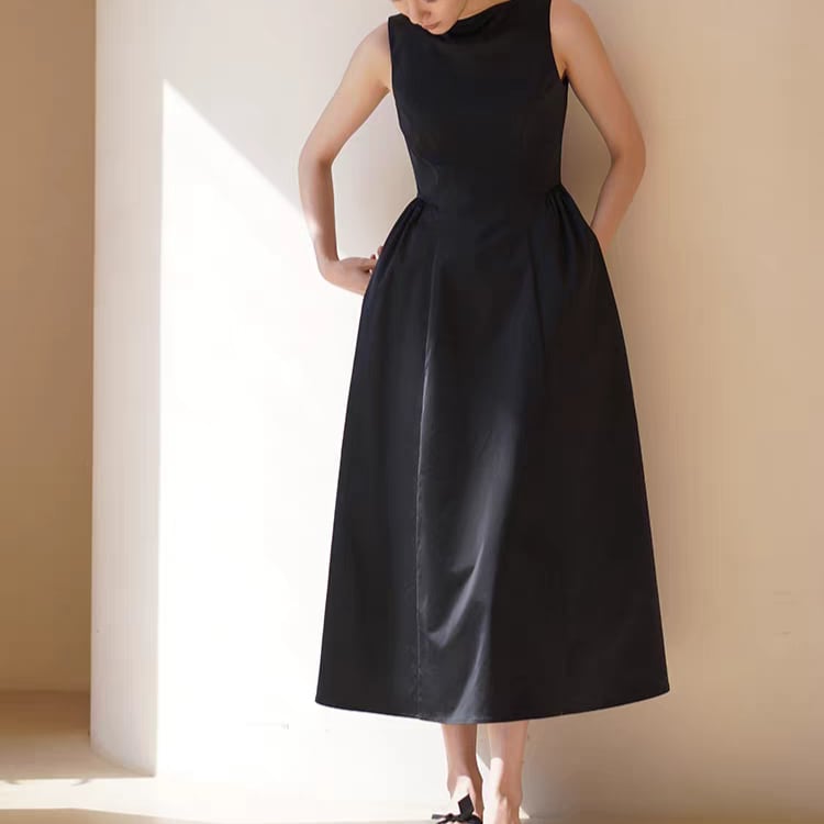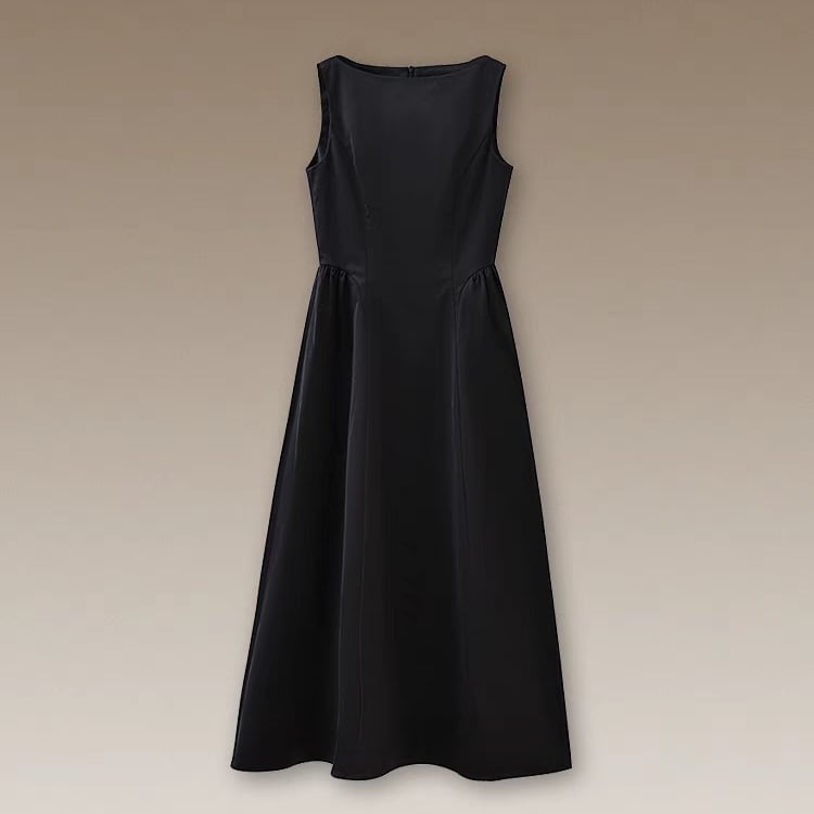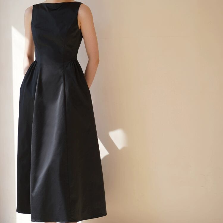 ボートネックが洗練された印象を与え、フィット&フレアーシルエットが女性らしさを引き立てます。