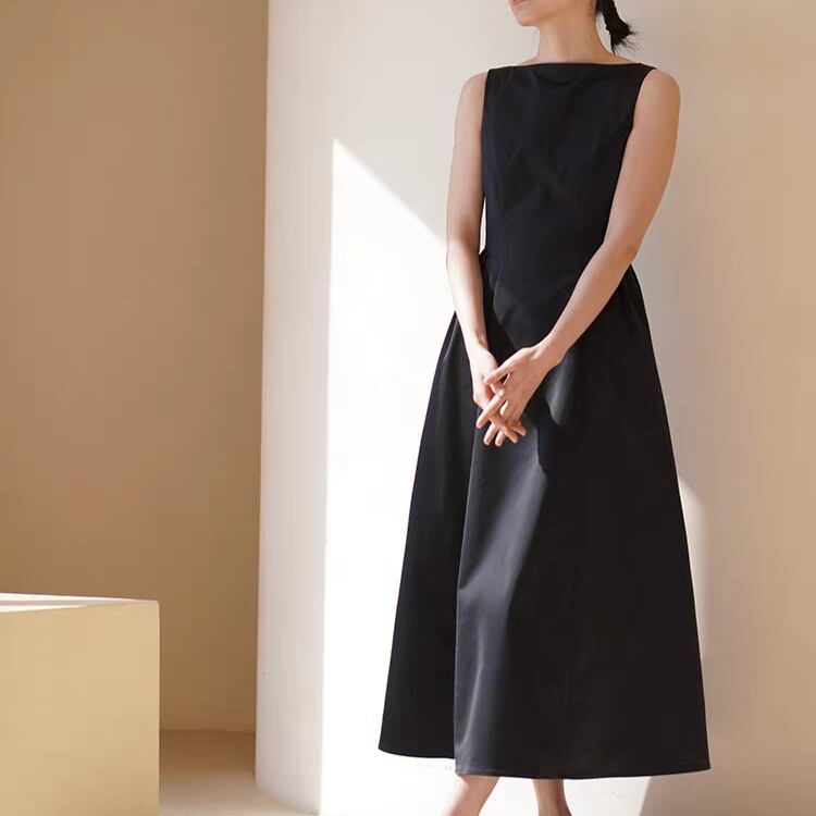 スタイリッシュなデザインが際立つボートネックのワンピースです。