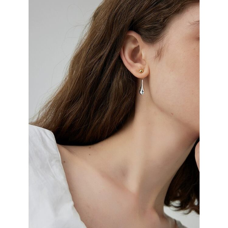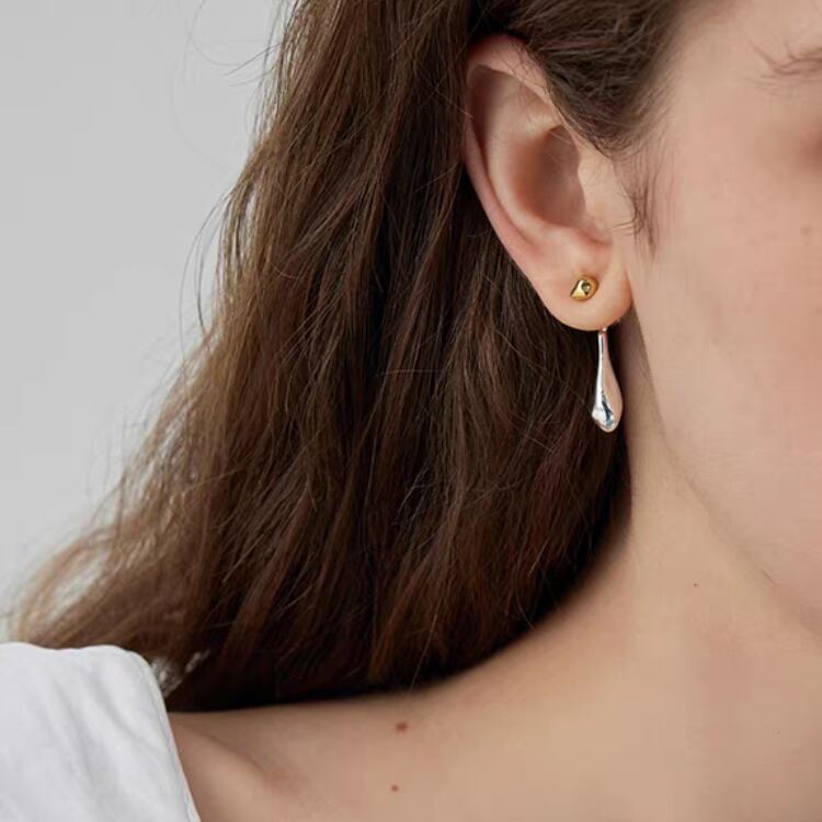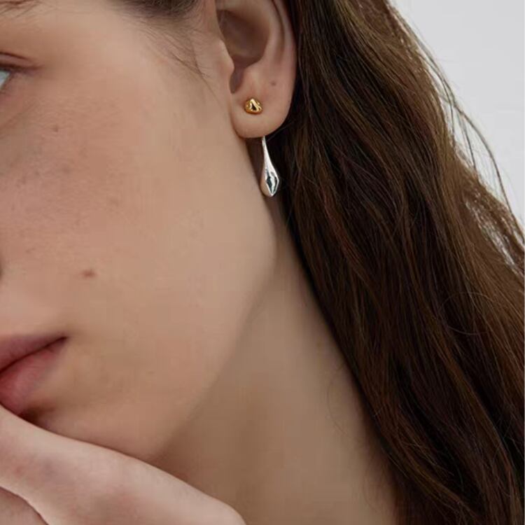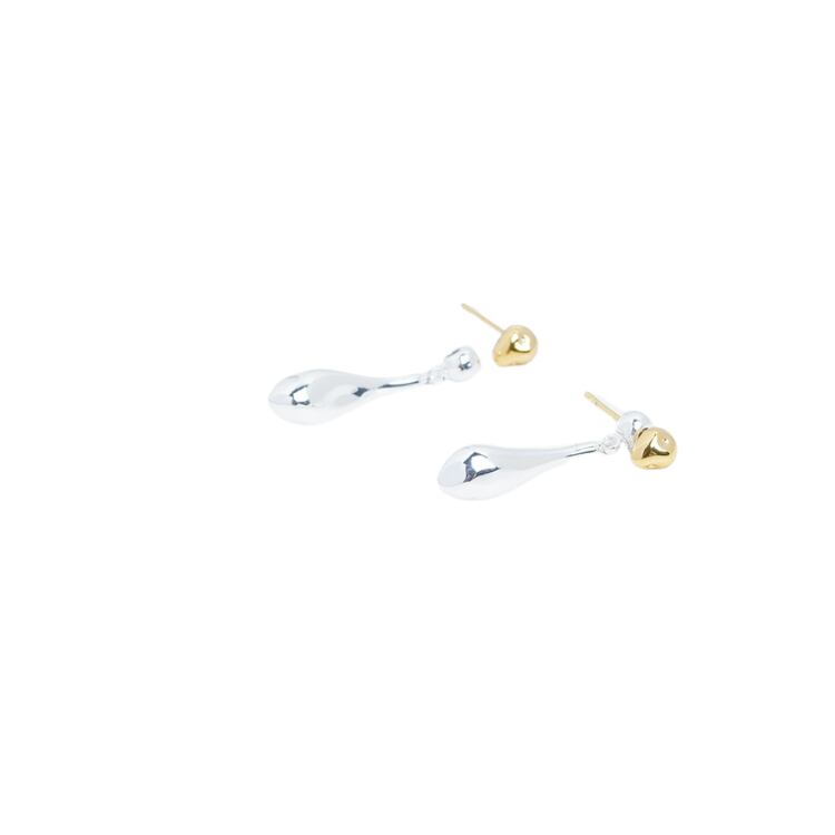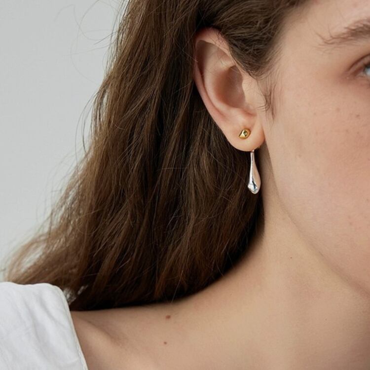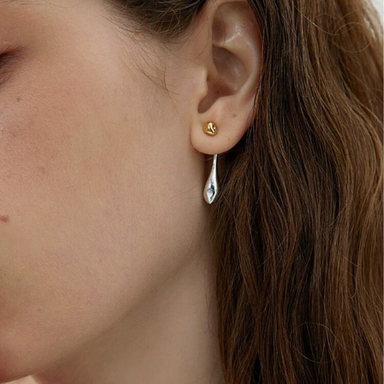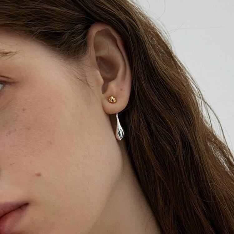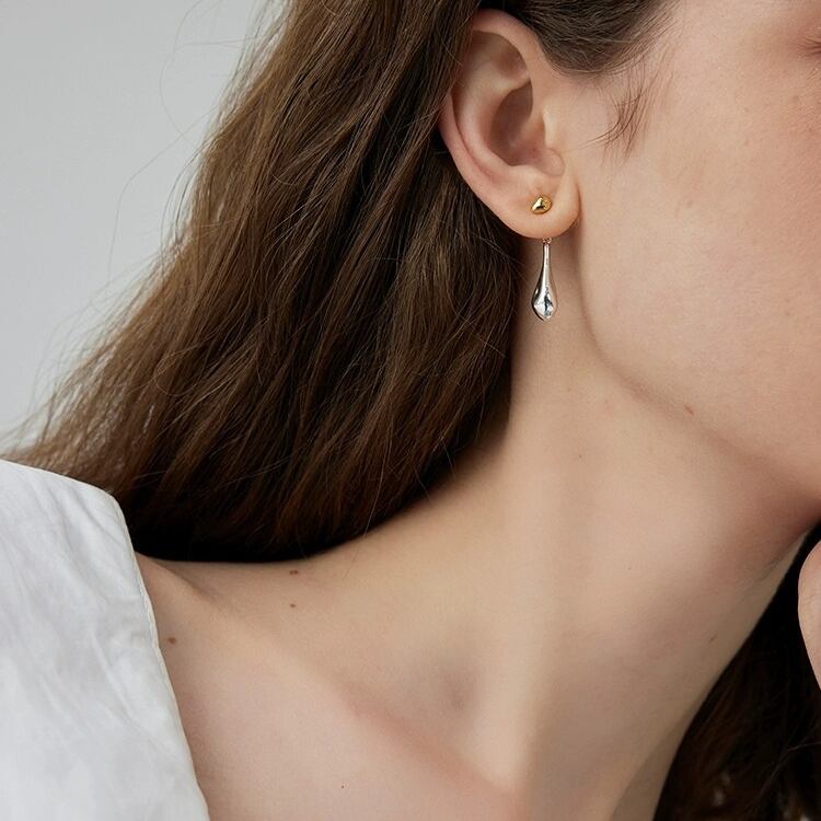 金色のピアスとキャッチの下にある銀色のドロップモチーフが、華やかに耳元を彩ります。