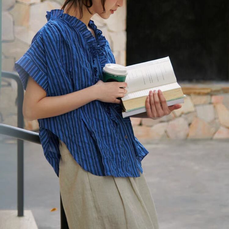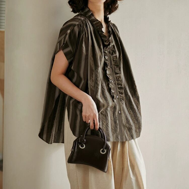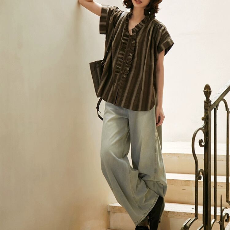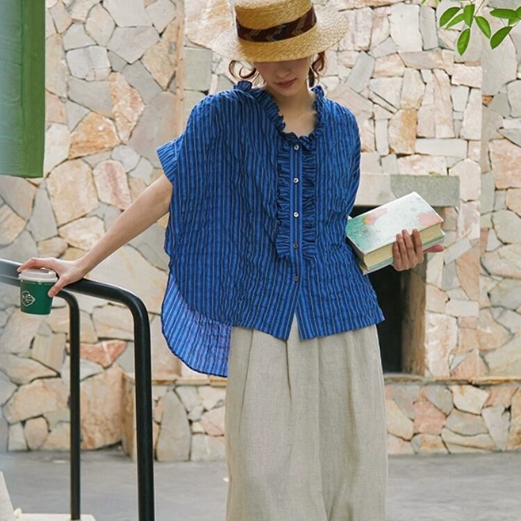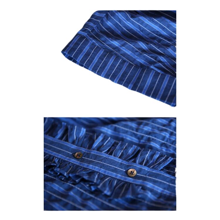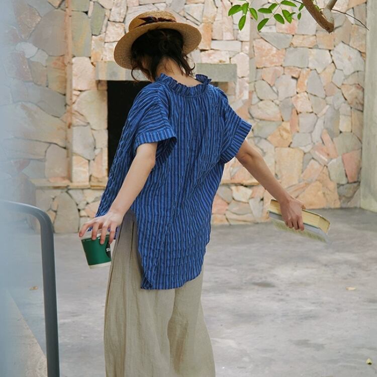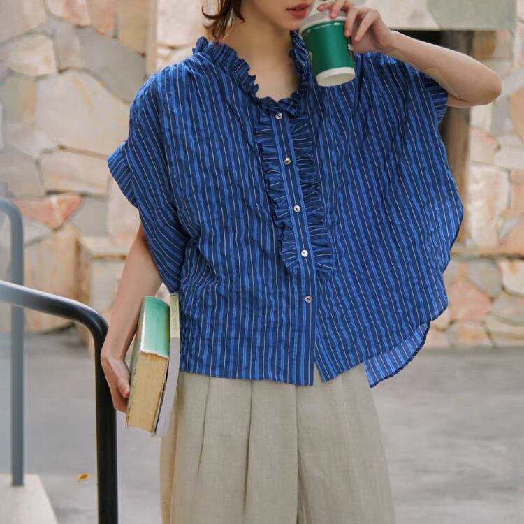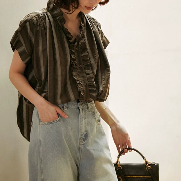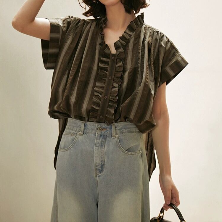 フリル襟フリル前立てストライプ柄リップルオーバーサイズシャツ 1135