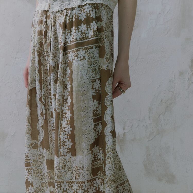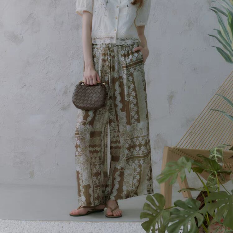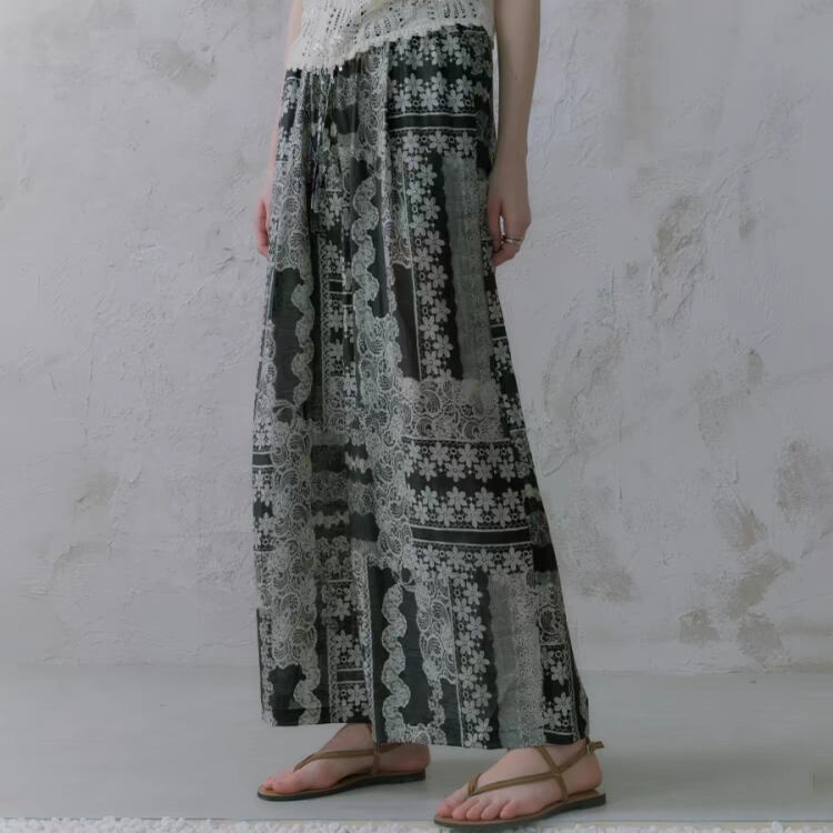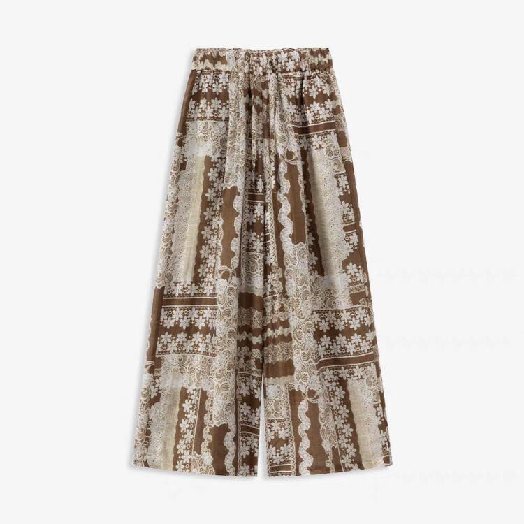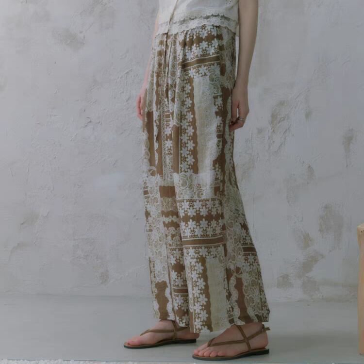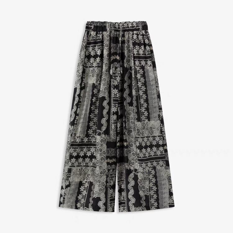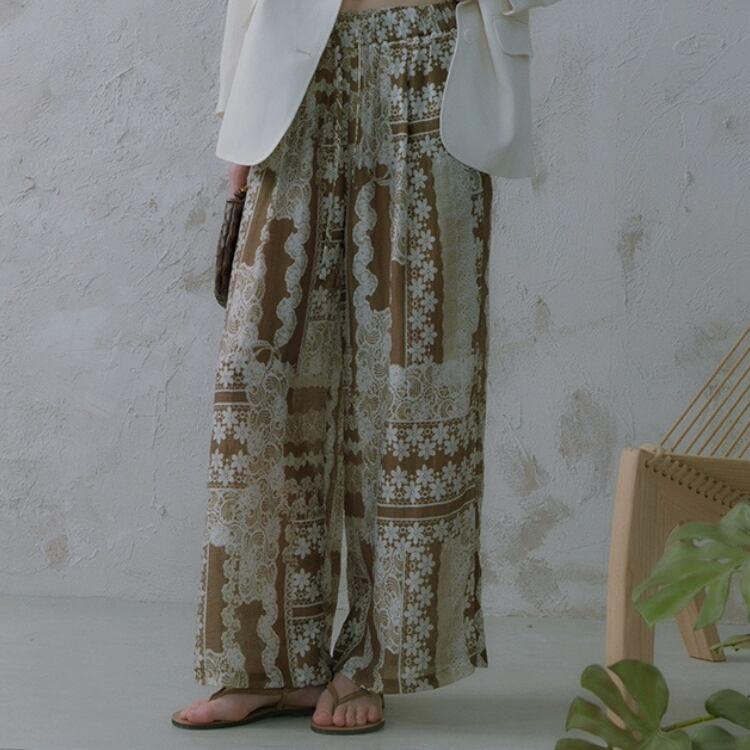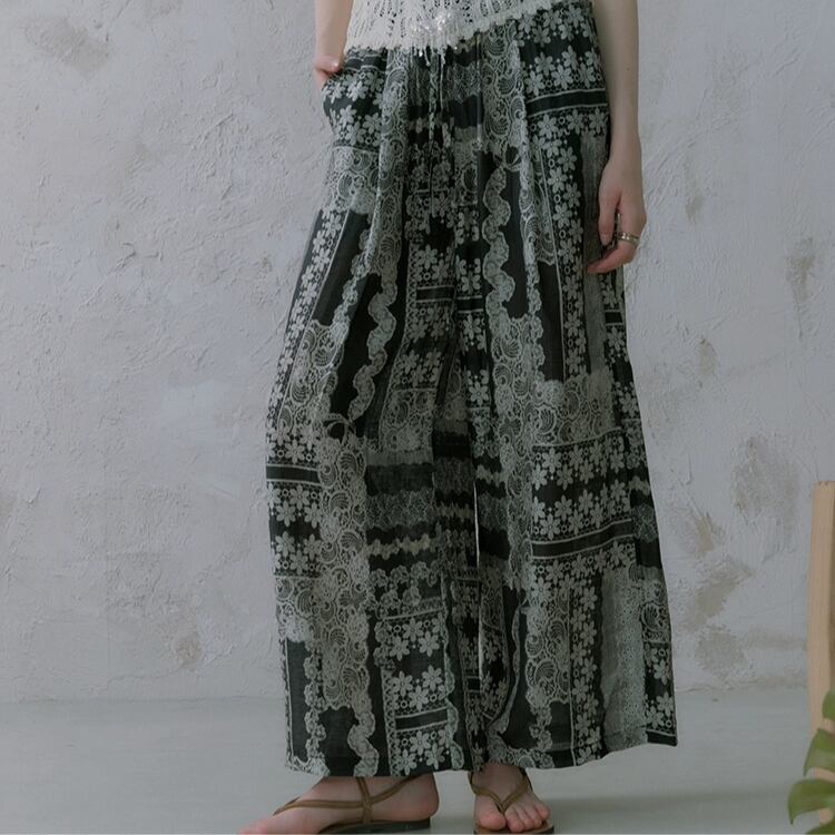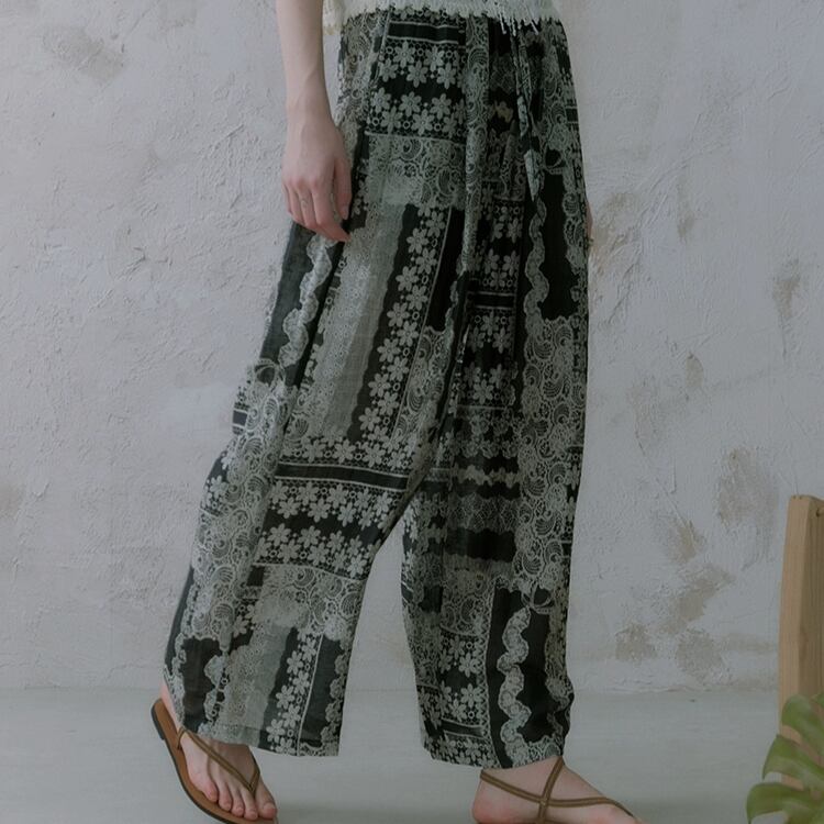 エレガントなレース柄をあしらったパネルプリントが特徴のイージーワイドパンツ。