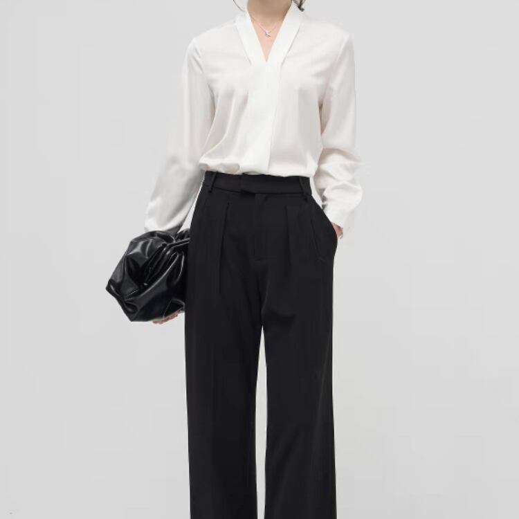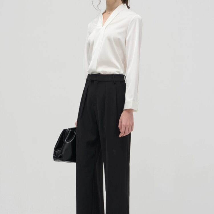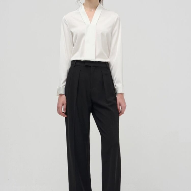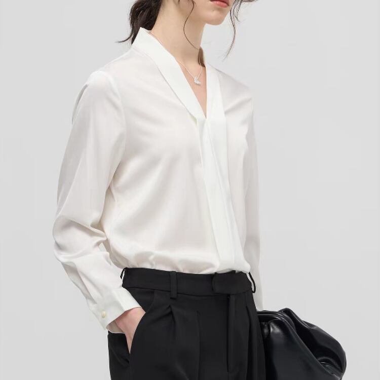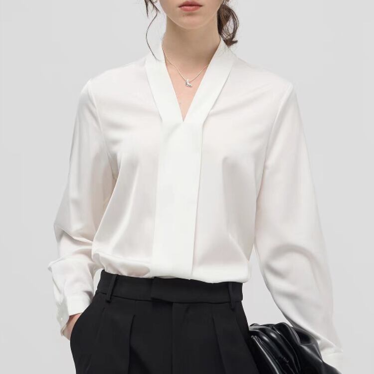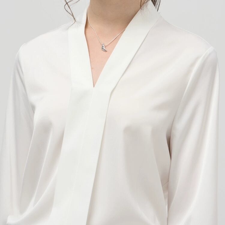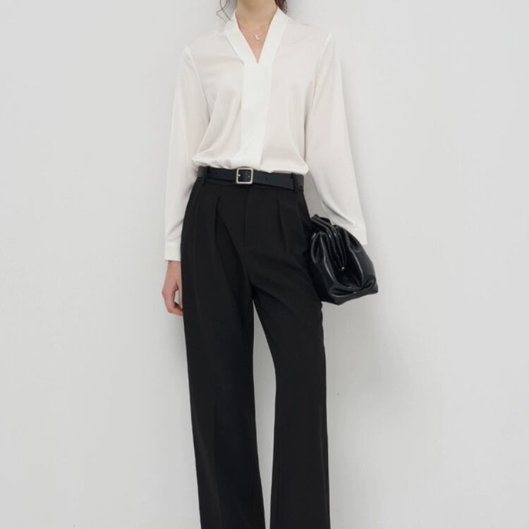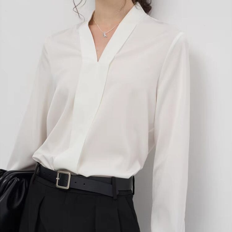 シンプルながらも顔周りをすっきりと見せるVネックデザインが魅力のブラウスです。