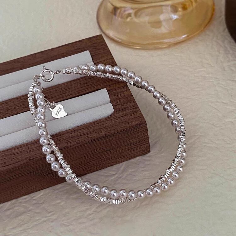 シルバービーズ&淡水パール2連ツイストブレスレット 1162