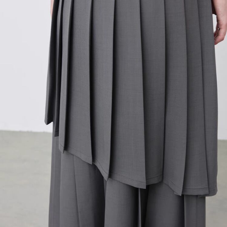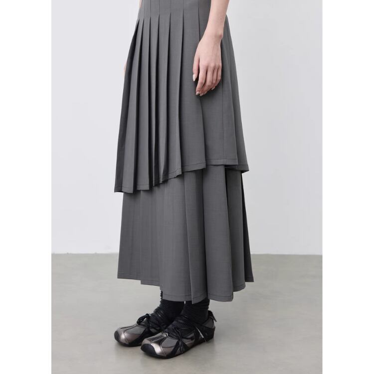 アシンメトリーヘムラインのプリーツと、マキシ丈のプリーツスカートが絶妙にレイヤードされたデザインが特徴です。