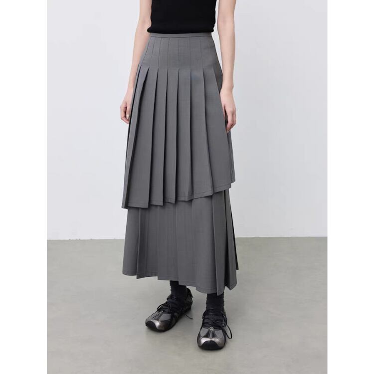 洗練された印象を与える、レイヤードのプリーツスカートです。