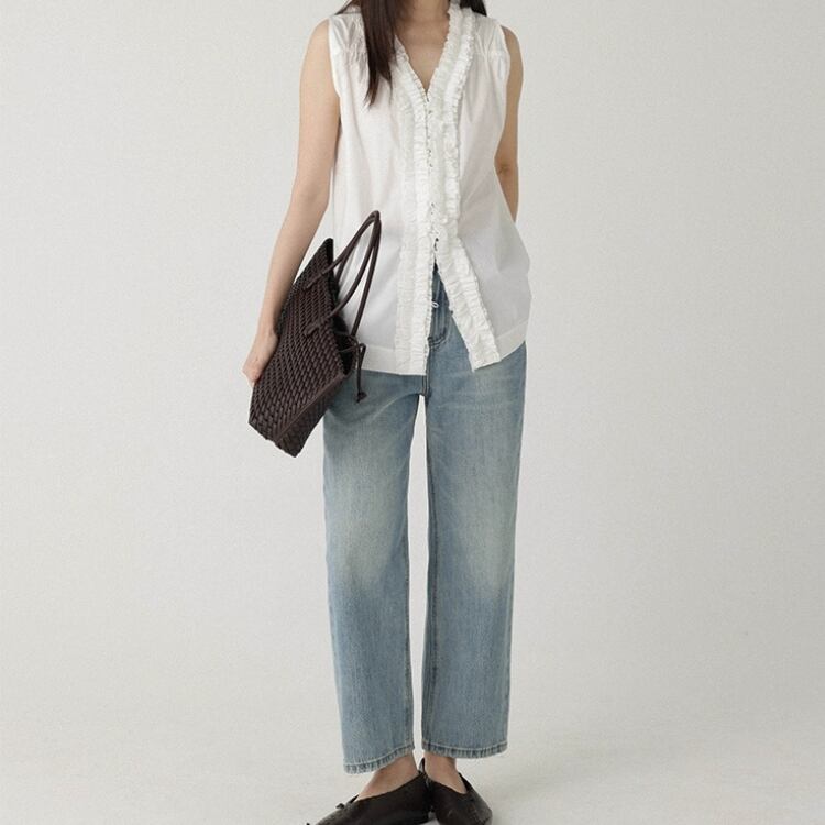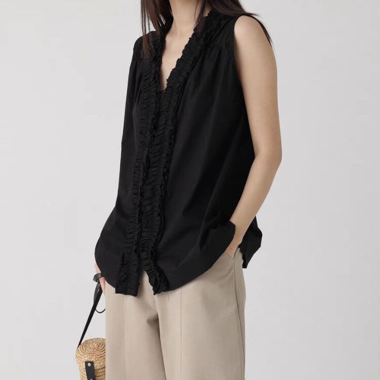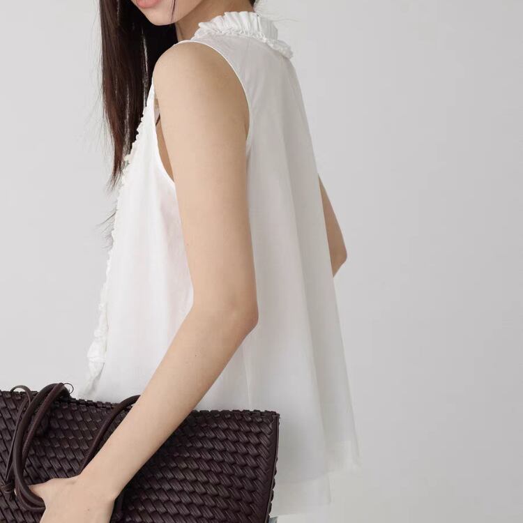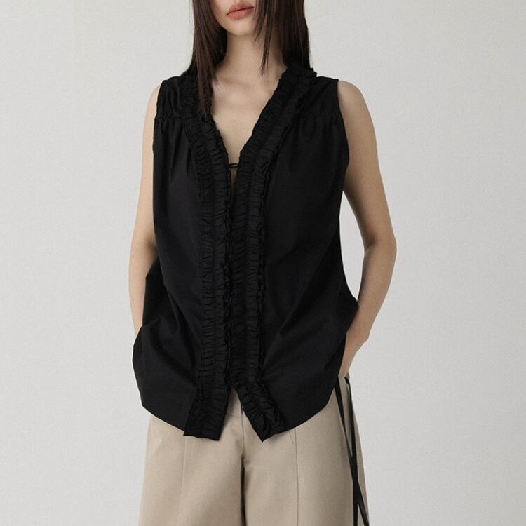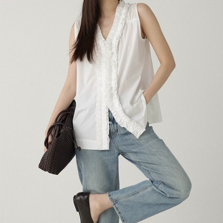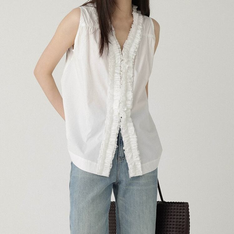 Vネックデザインに幅広のタタキフリルを施し、華やかに着映えます。