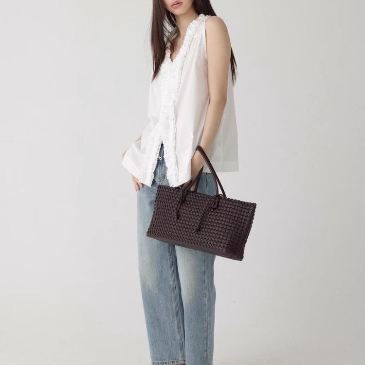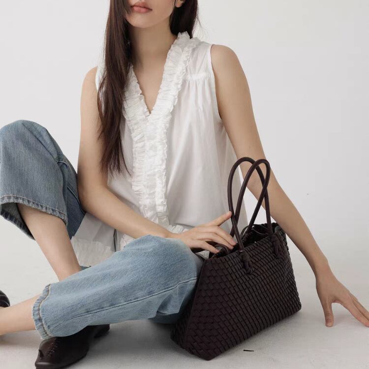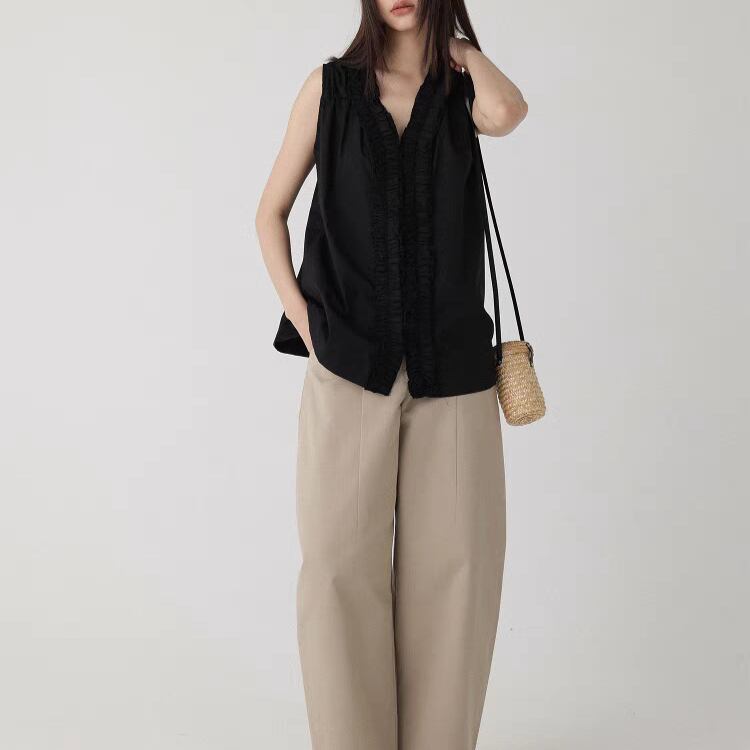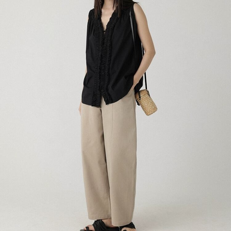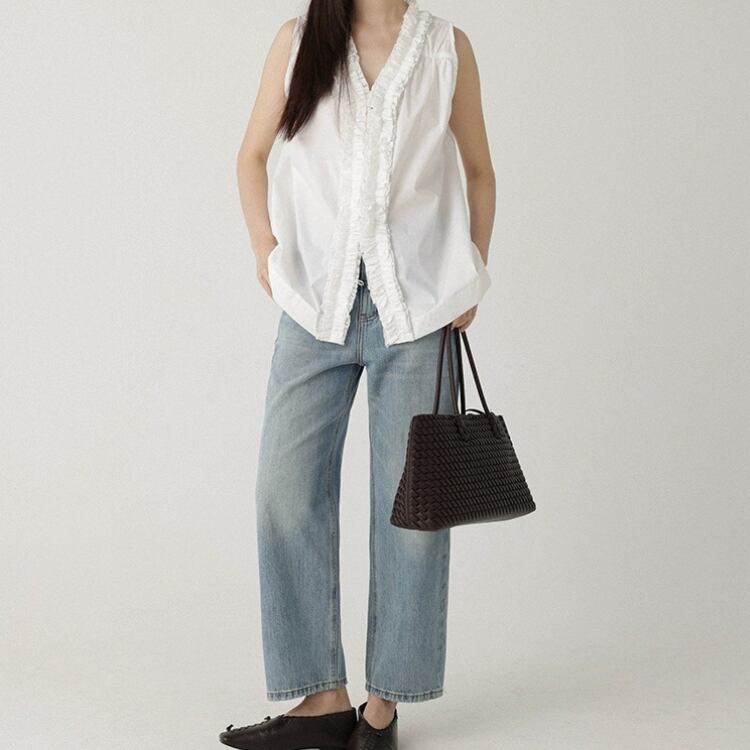 Vネックが顔周りをすっきり見せてくれるため、大人っぽく洗練された印象を与えます。