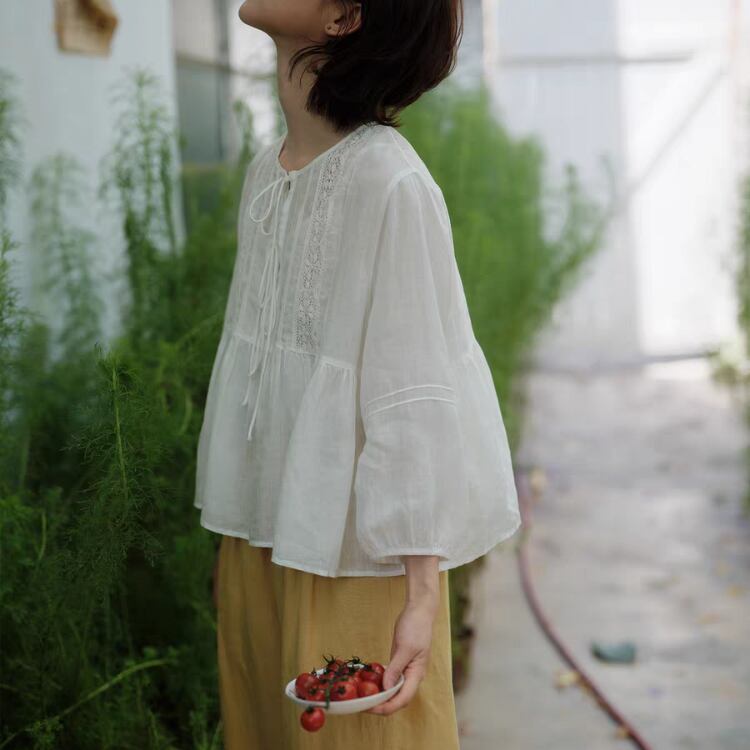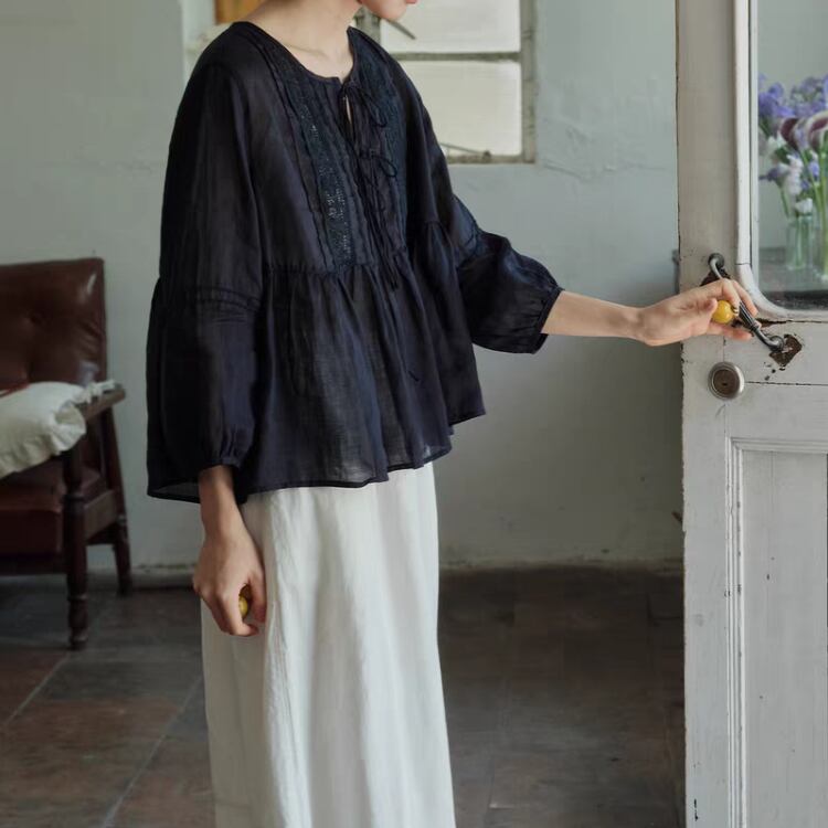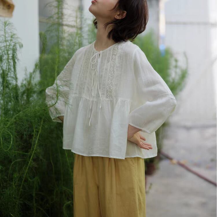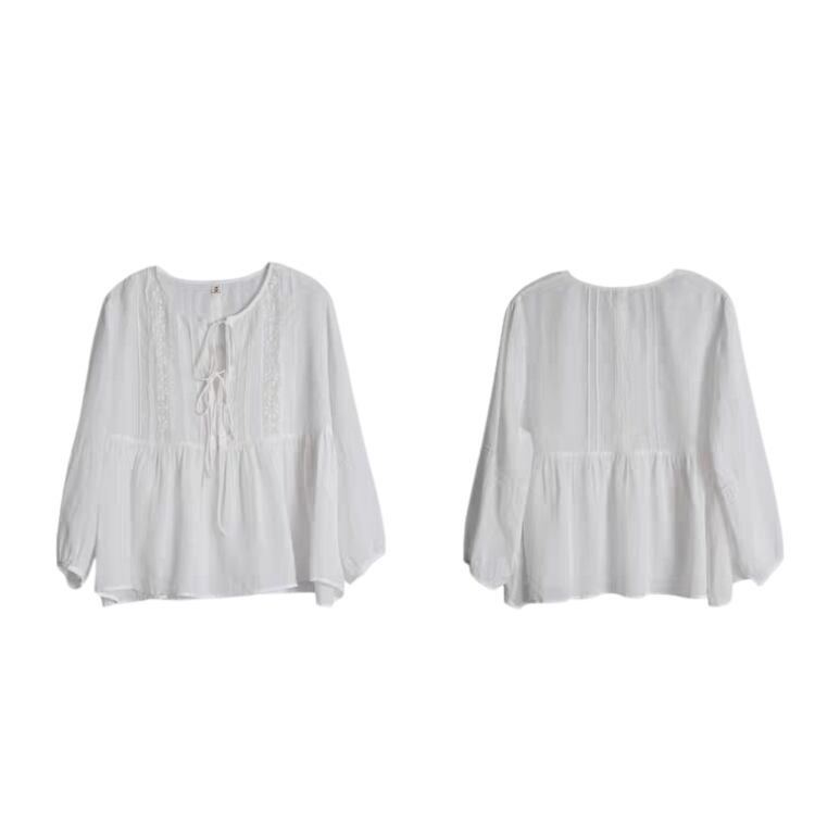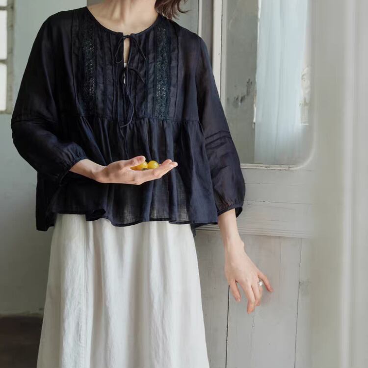 フロントピンタックレース配色ギャザー切り替えAラインシアーブラウス 1209
