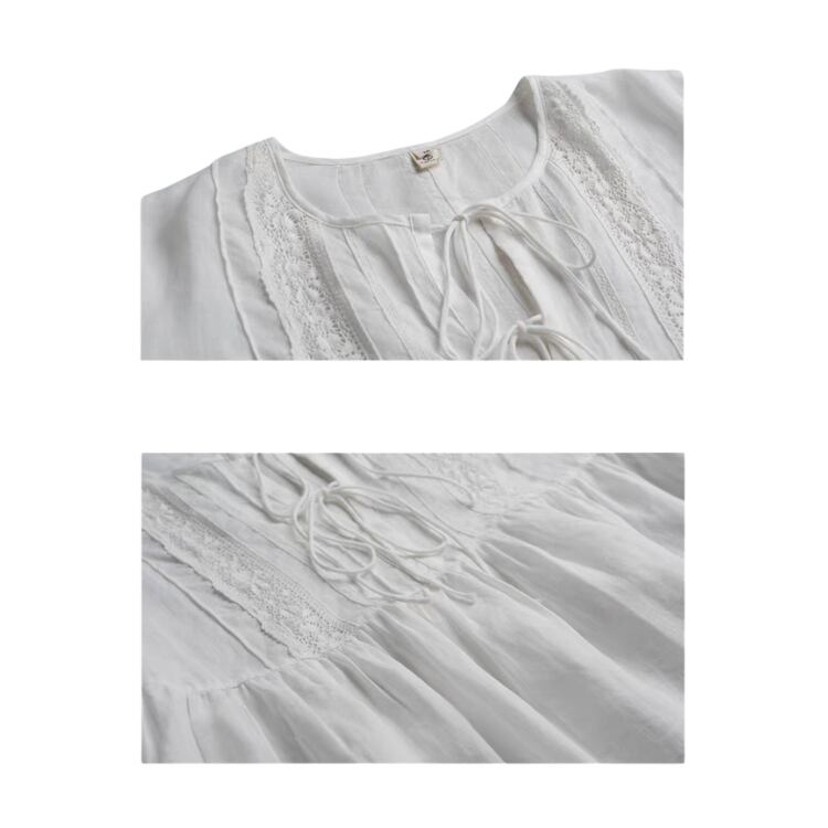 フロントに施されたピンタックとレースのデザインが、ガーリッシュな雰囲気を引き立てる一着です。