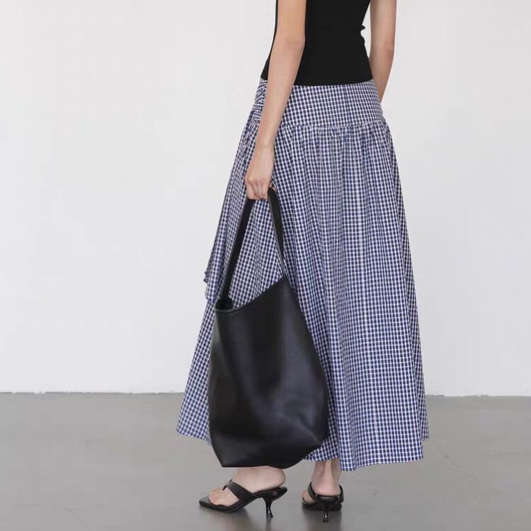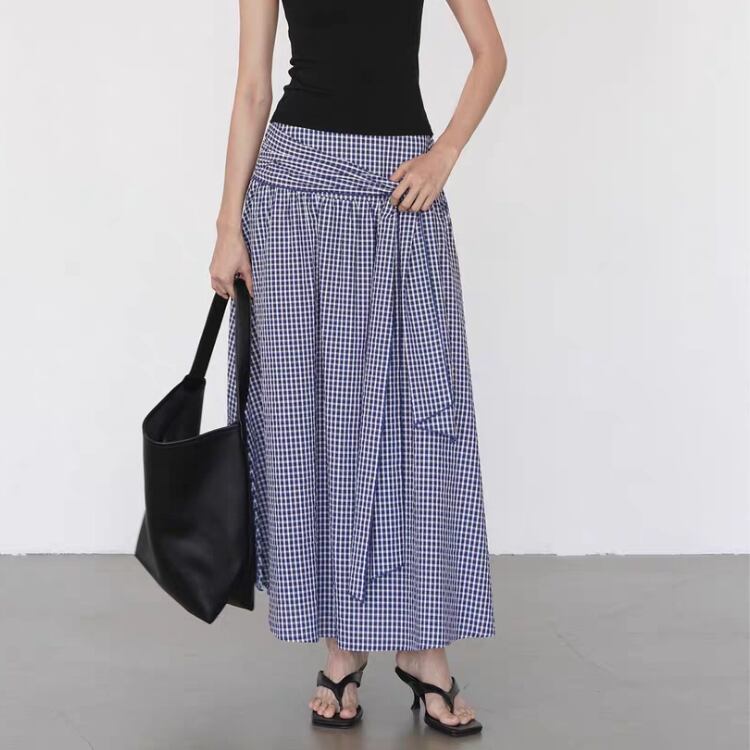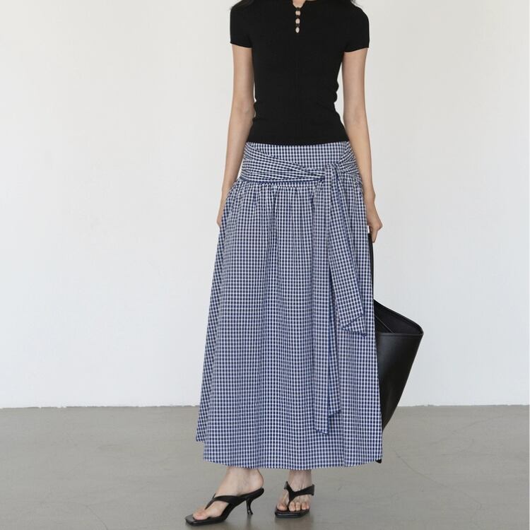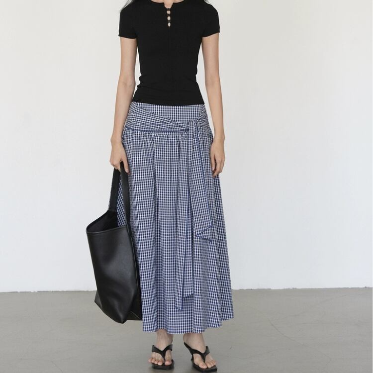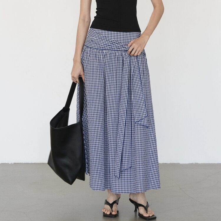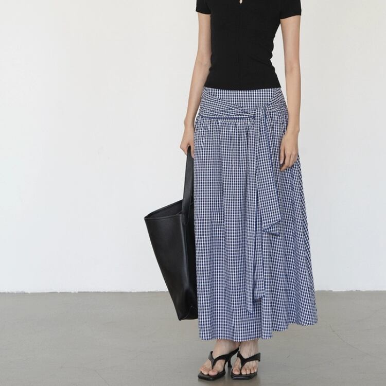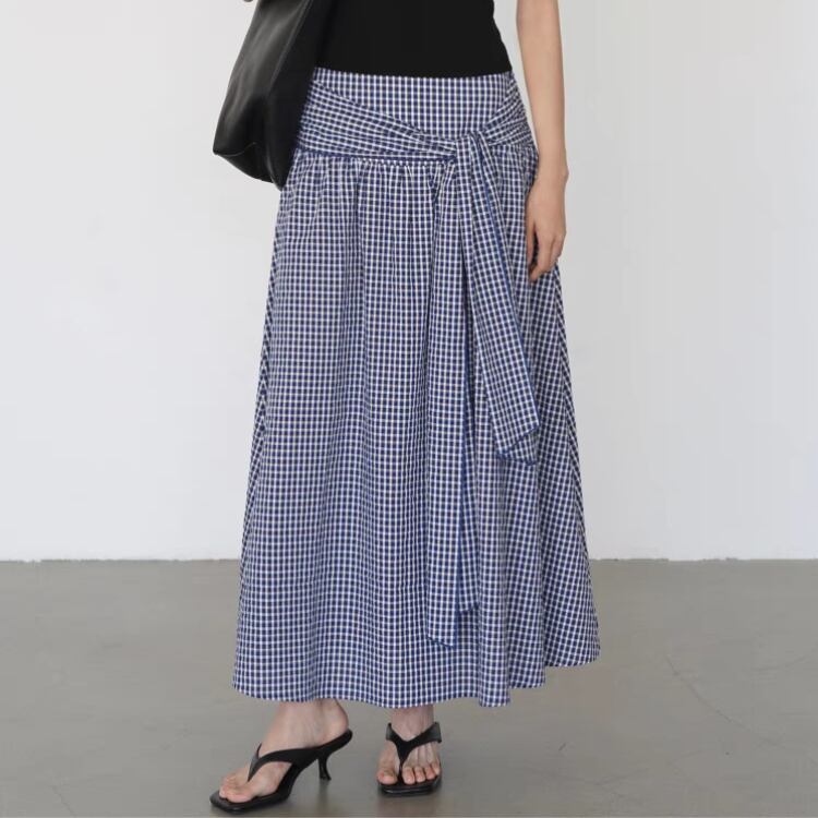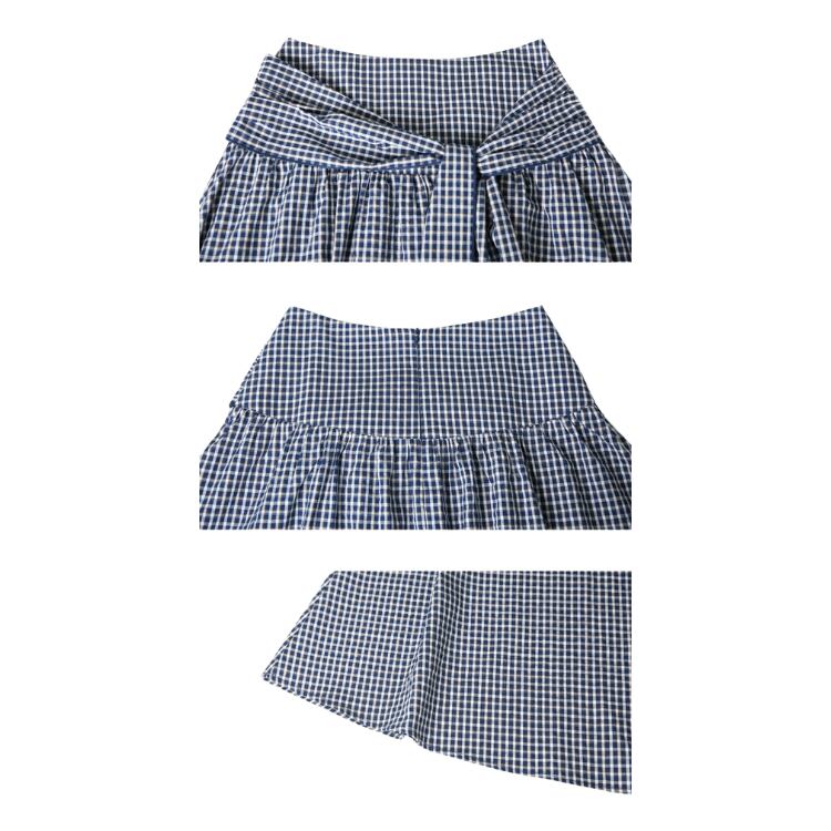 ギンガムチェック柄ウエストリボン付きヨークギャザー切替フレアースカート 1246
