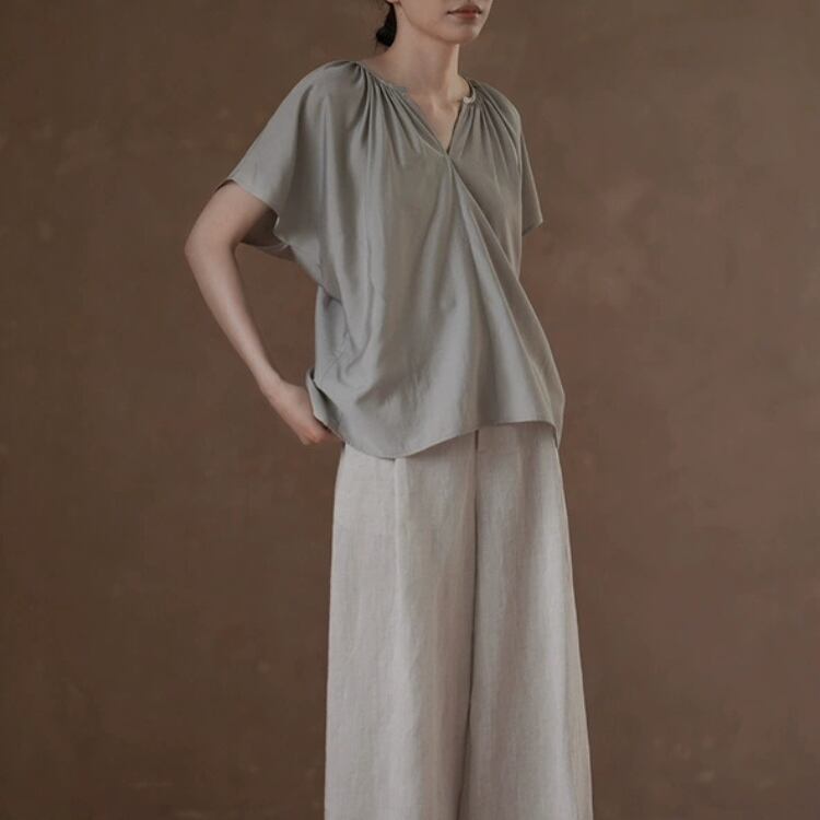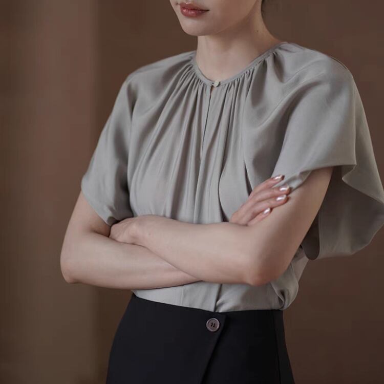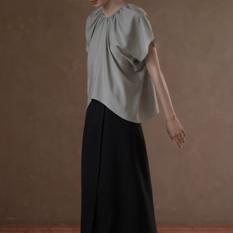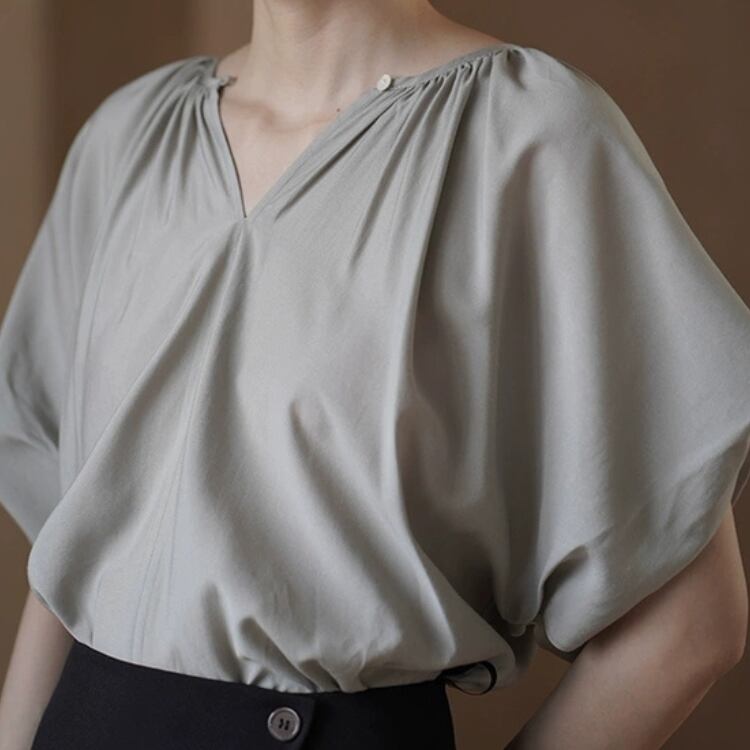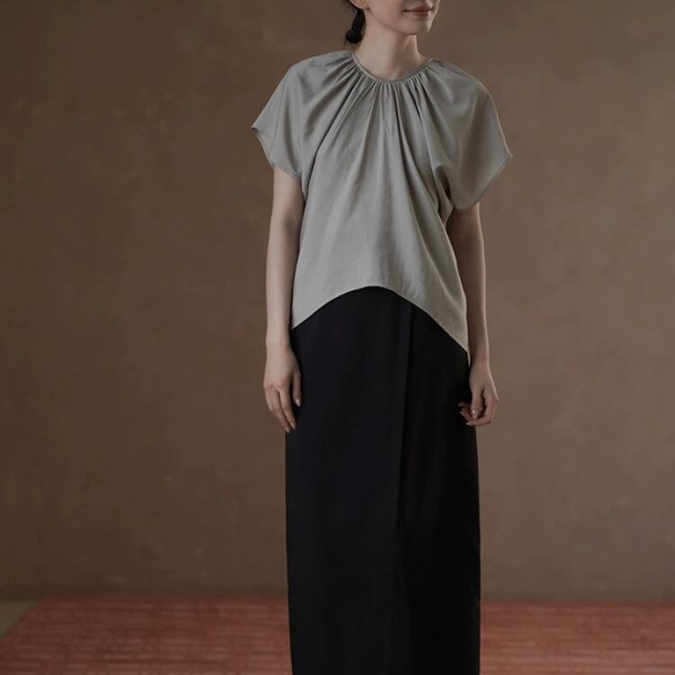 ギャザーを寄せたネックラインが美しいシルエットを作り出し、女性らしさを引き立ててくれます。
