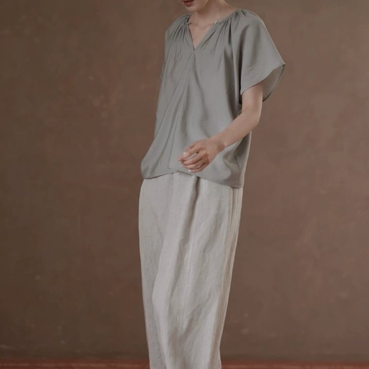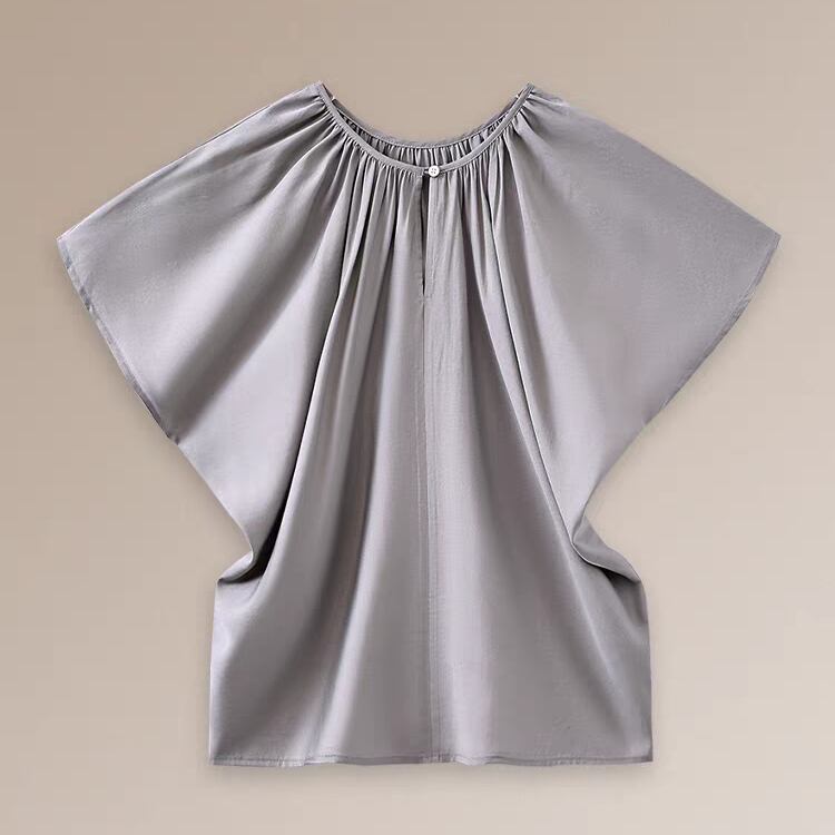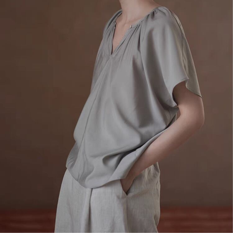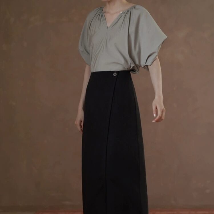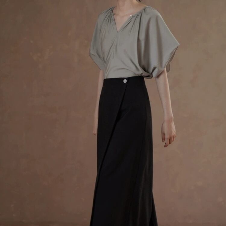 2WAY着用可能ギャザー寄せキーネックラグランスリーブサテンブラウス 1219
