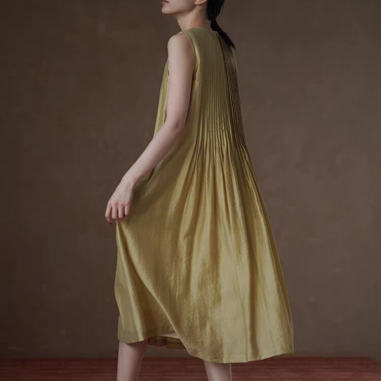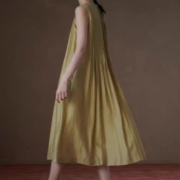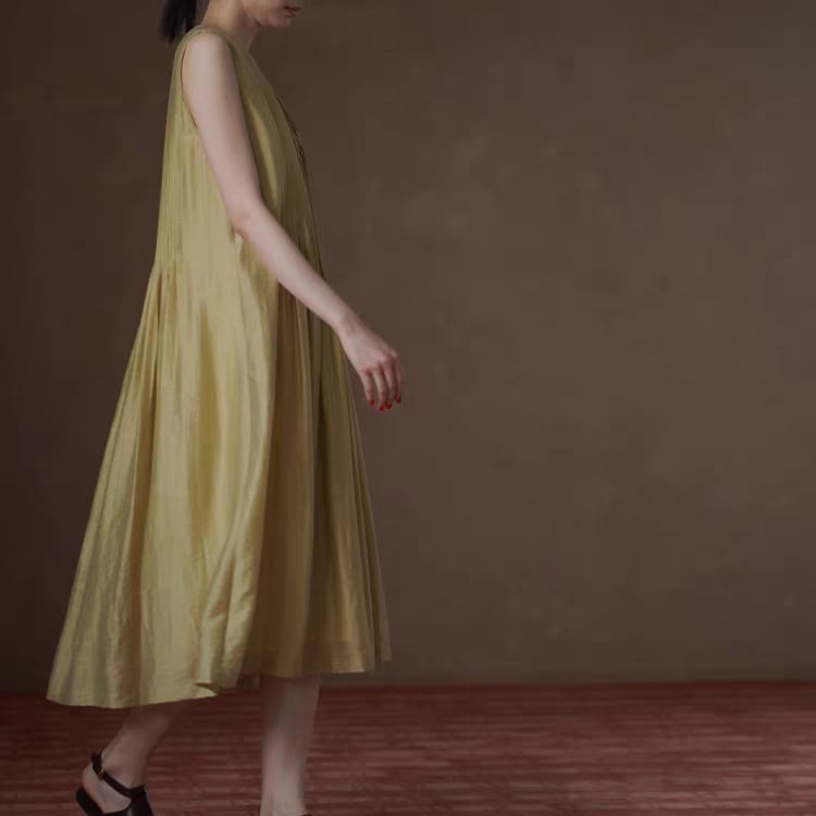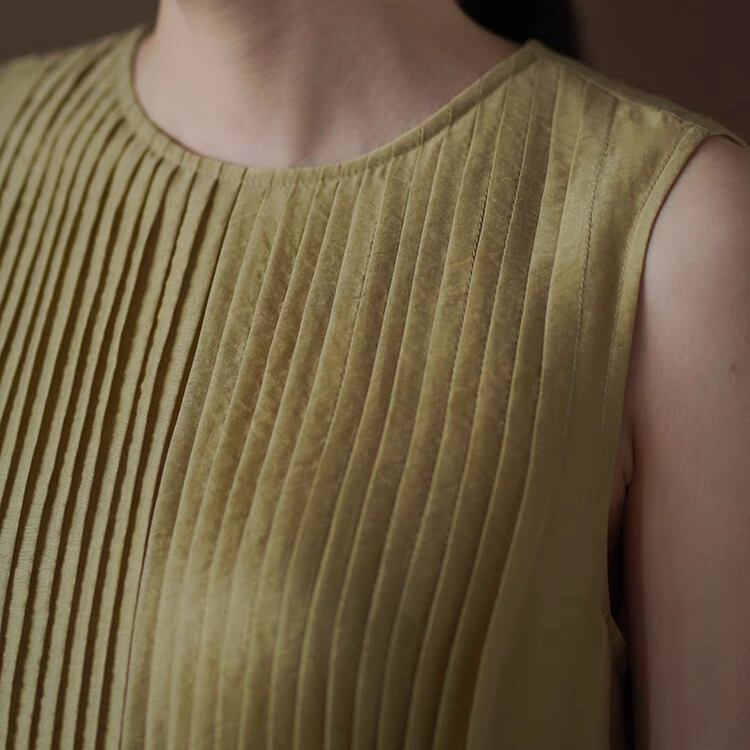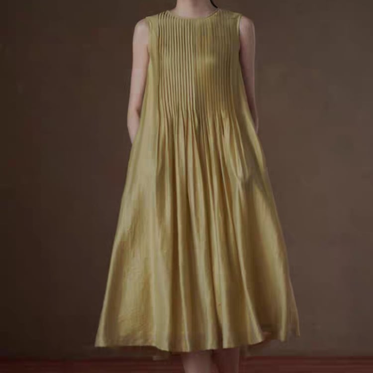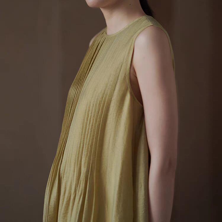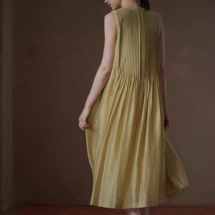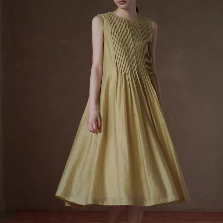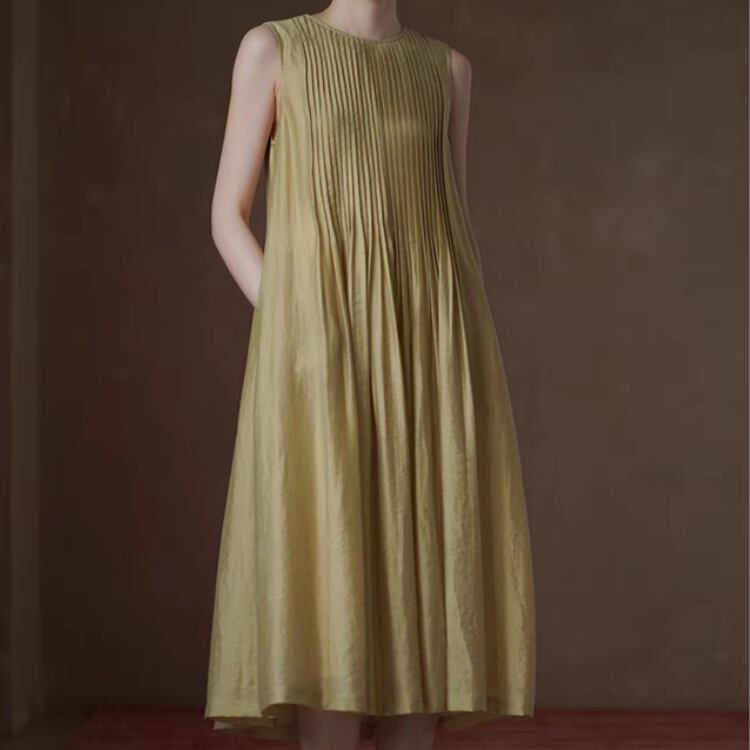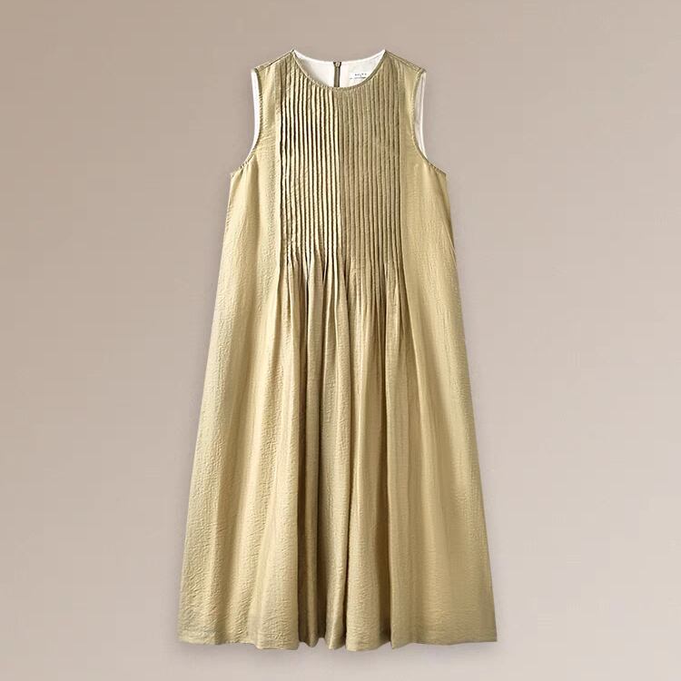 フロントとバックに施されたピンタックが上品な印象を与え、ウエスト位置で広がるAラインシルエットが女性らしさを引き立てます。