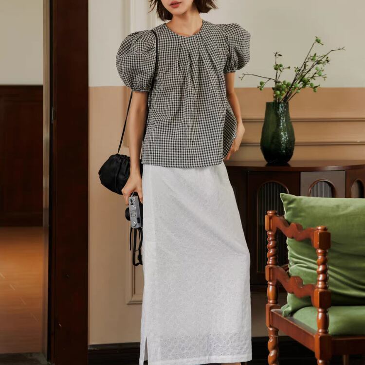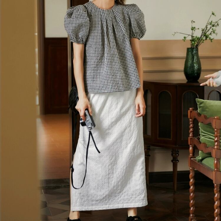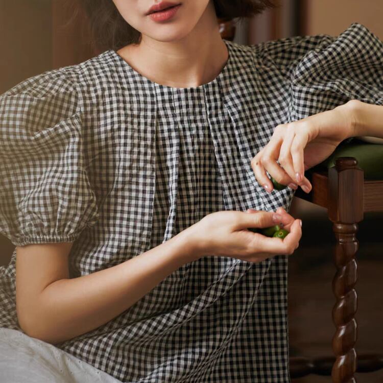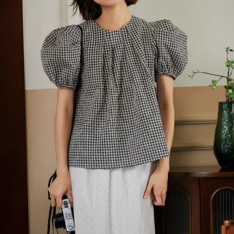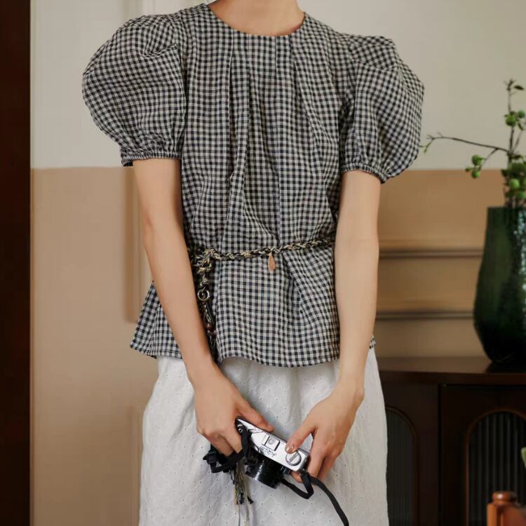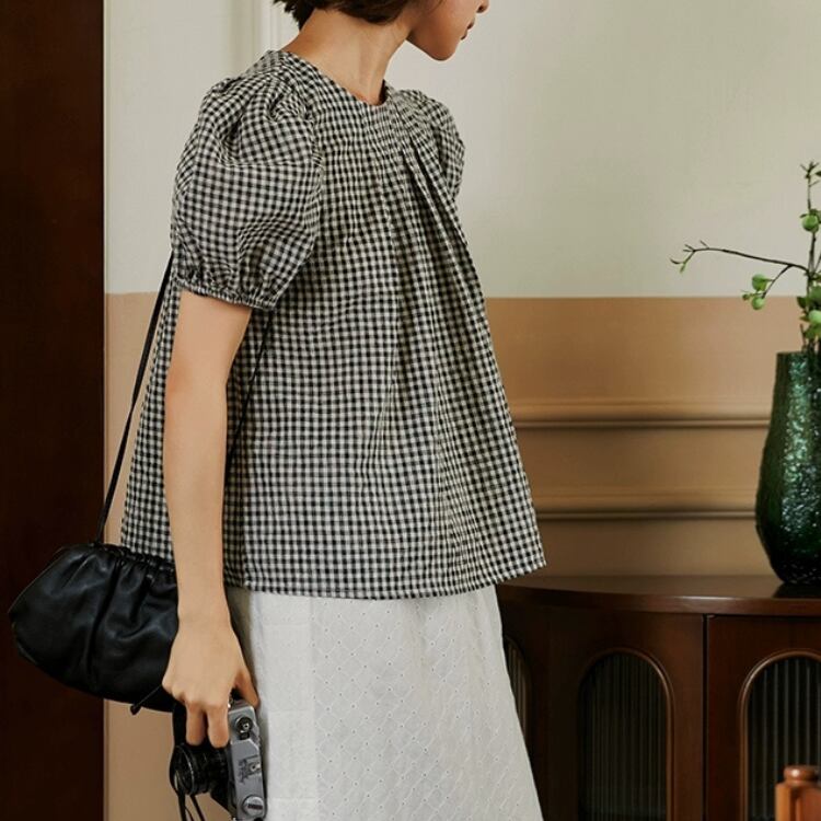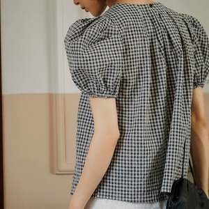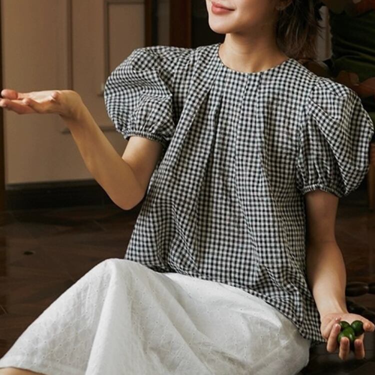 ギンガムチェック柄タックネックパフスリーブAラインブラウス 1241