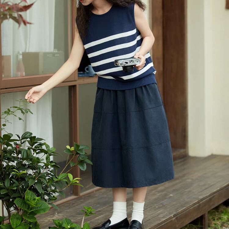 カーディガンやジャケットのインナーとしても使用でき、季節を問わず長く楽しめるアイテムです。