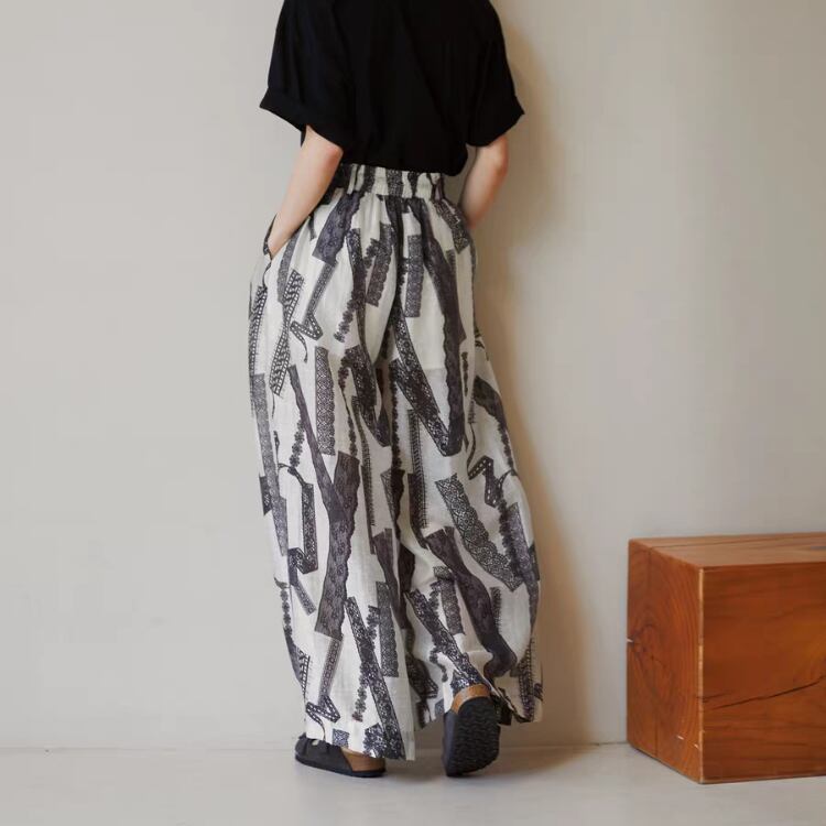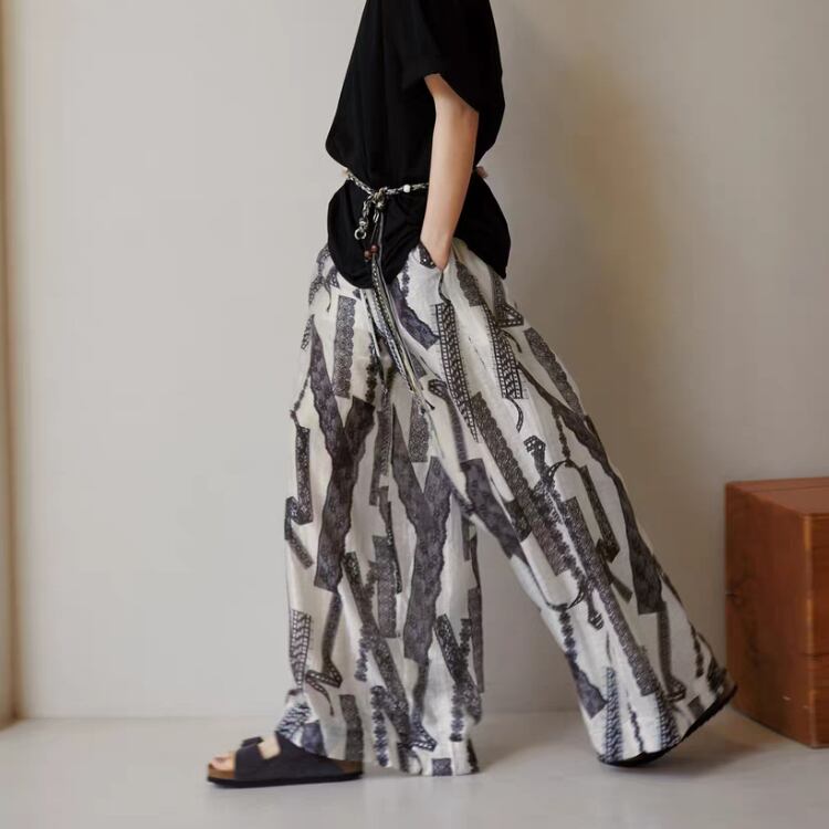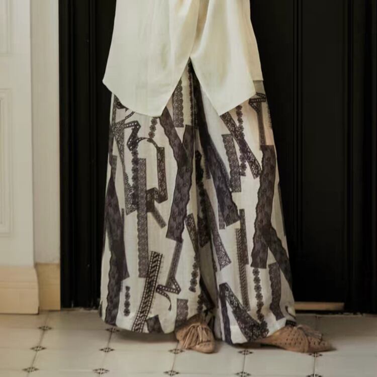 レーステープ柄のプリントが特徴的なワイドパンツです。