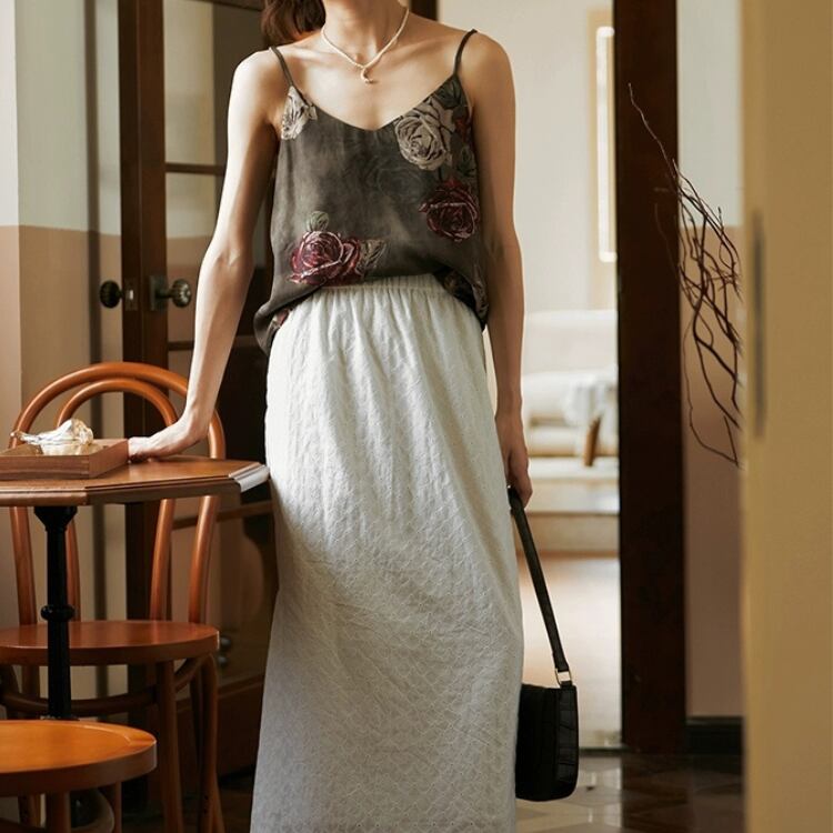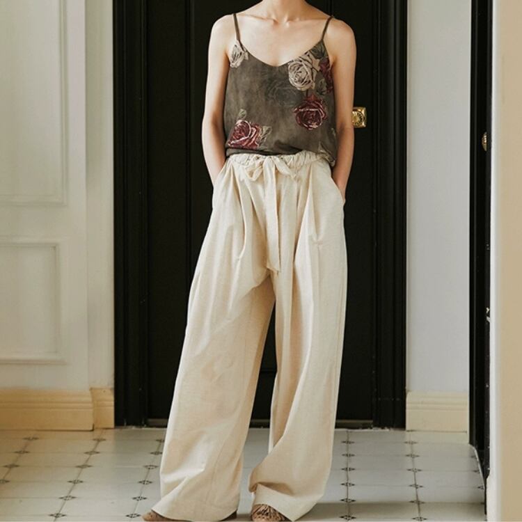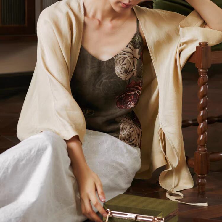 大きめのバラのプリントが印象的で、エレガントなスタイルを演出します。