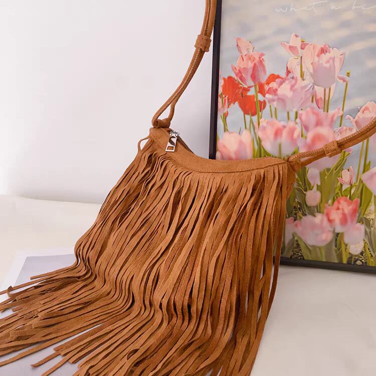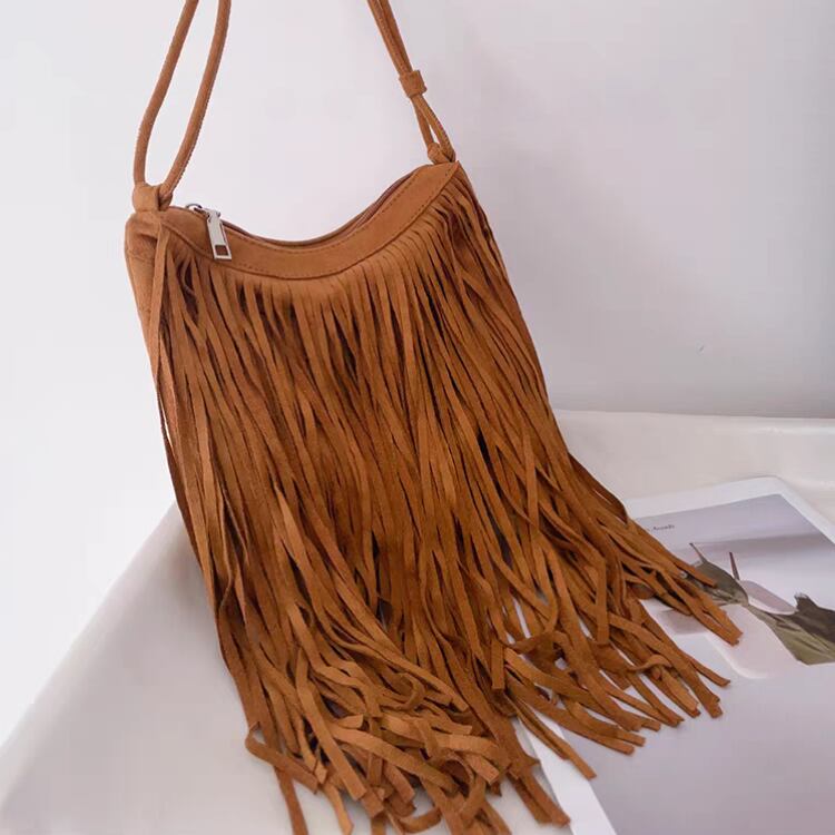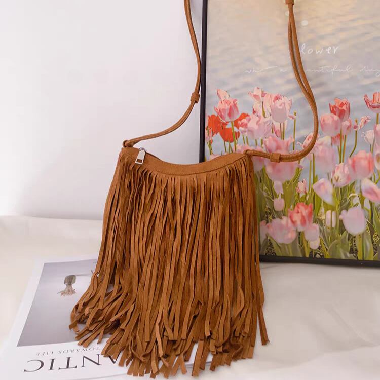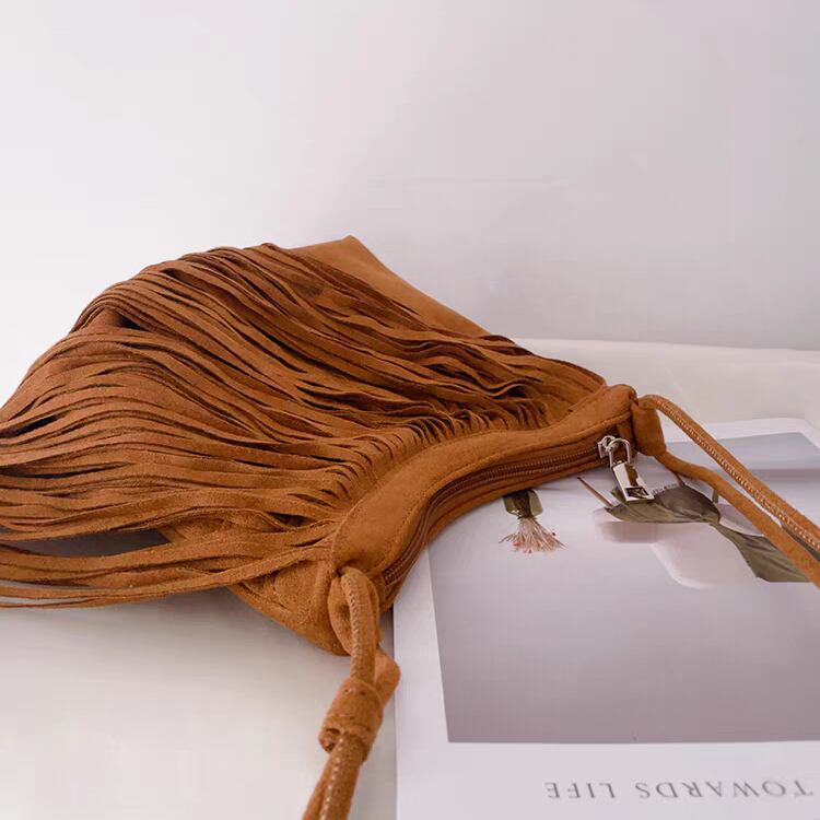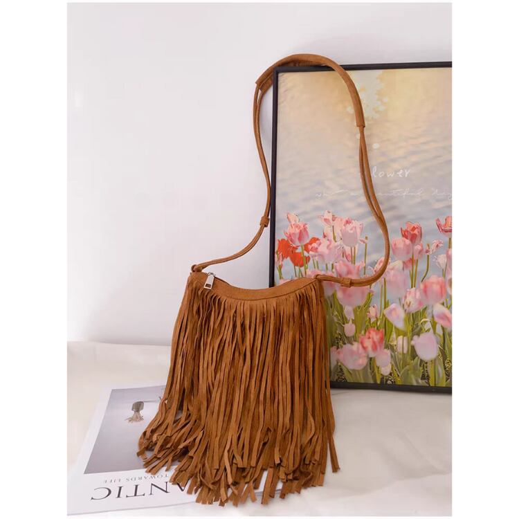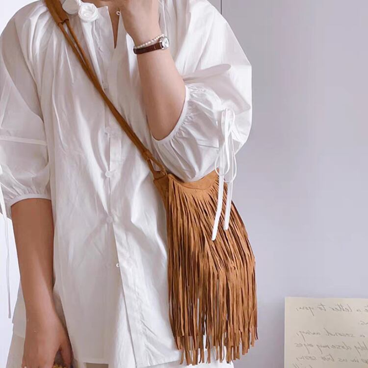フロントに施された長いフリンジが魅力的なショルダーバッグ。