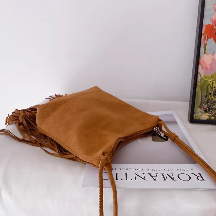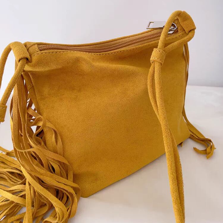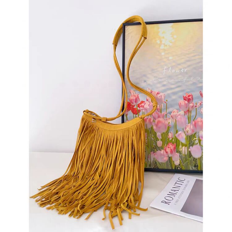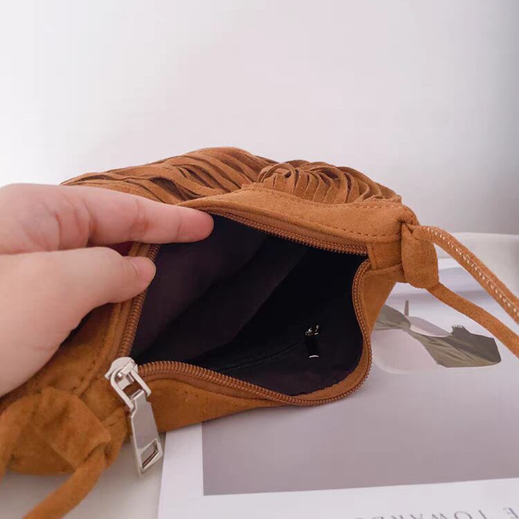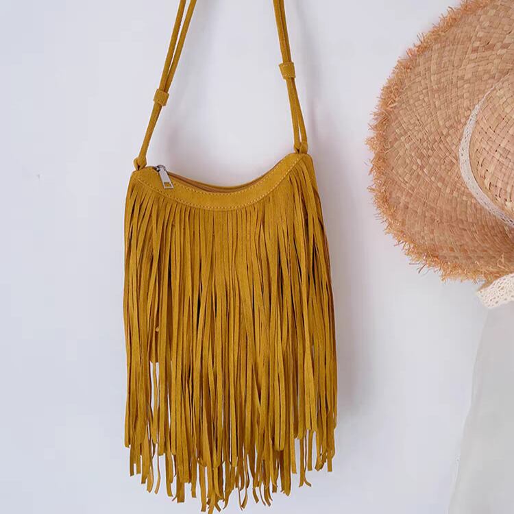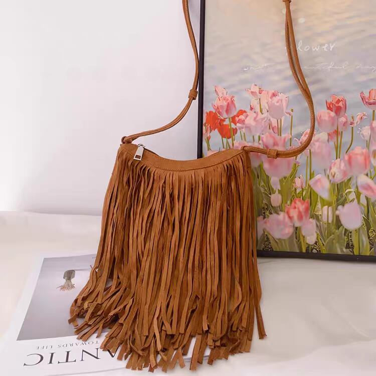 フロントに施された長いフリンジが魅力的なショルダーバッグ。
