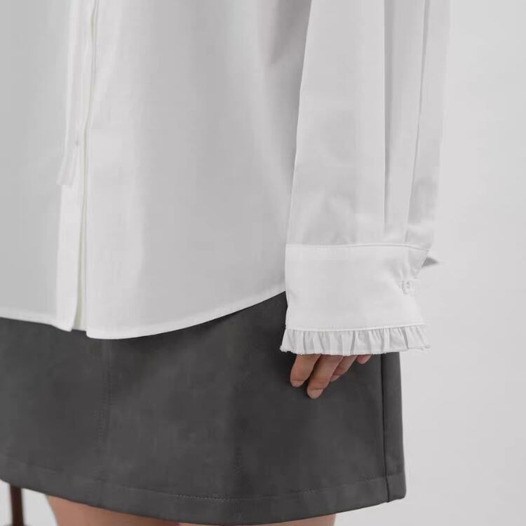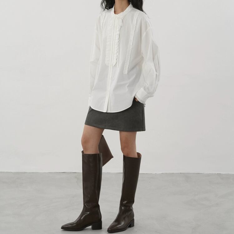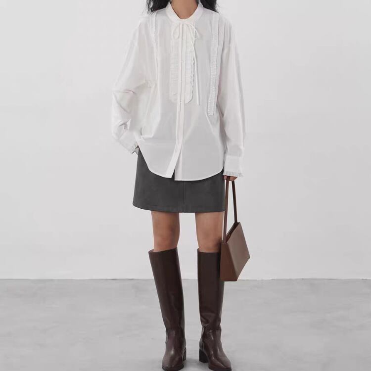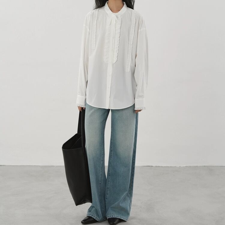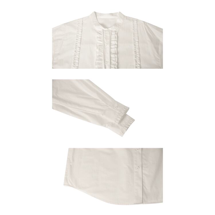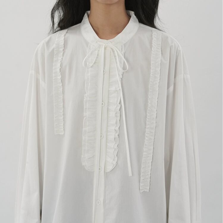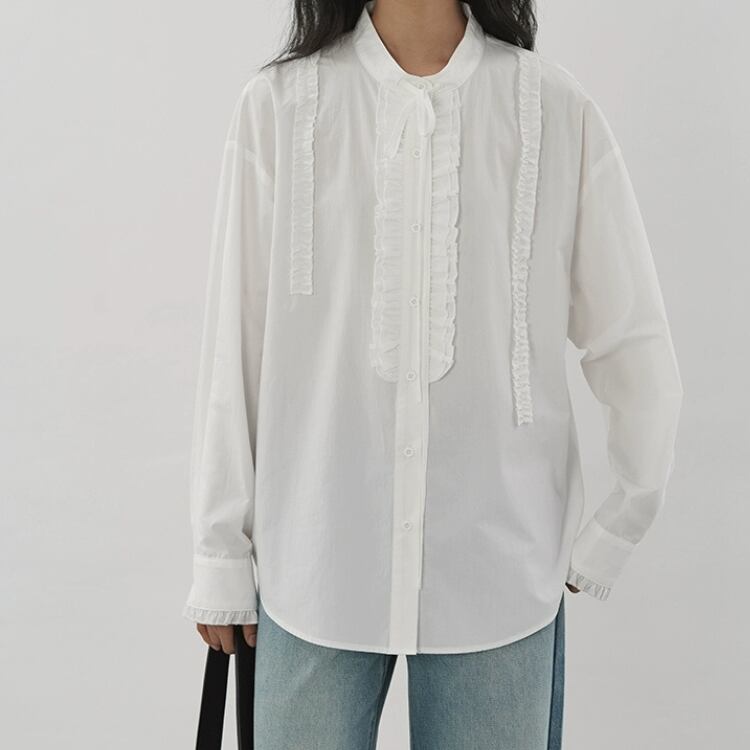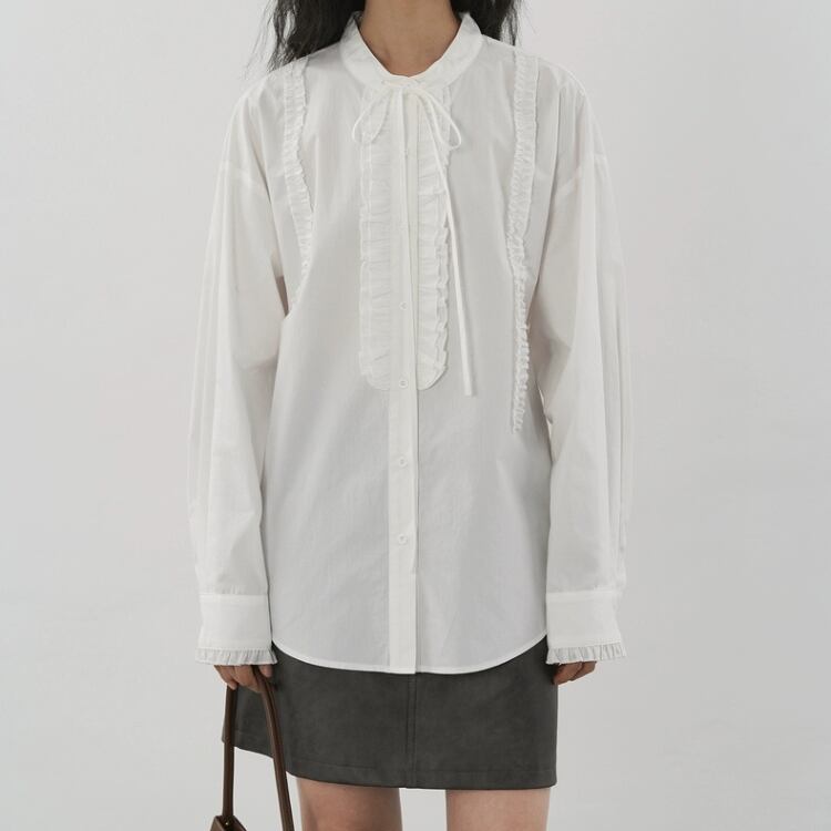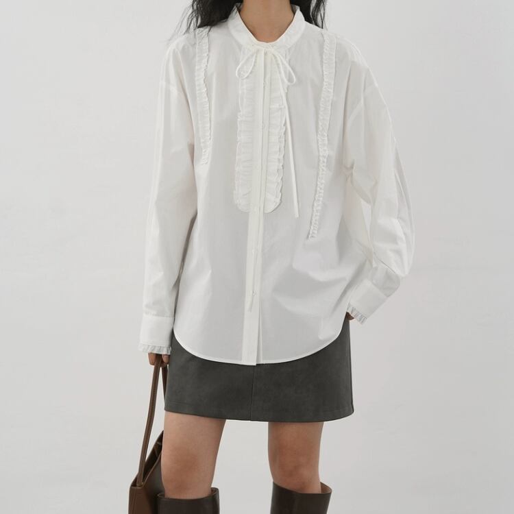 リボン付きバンドカラーフロントタタキフリルブラウス 1332