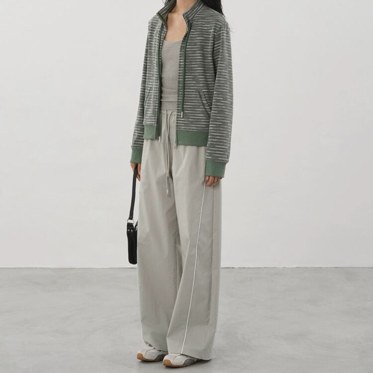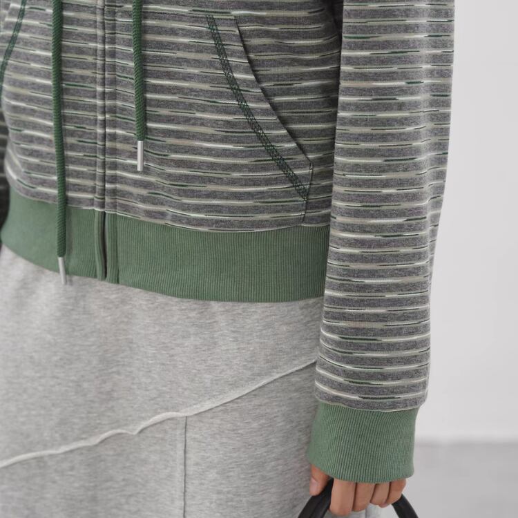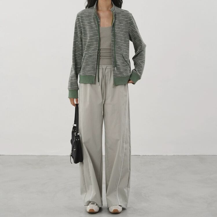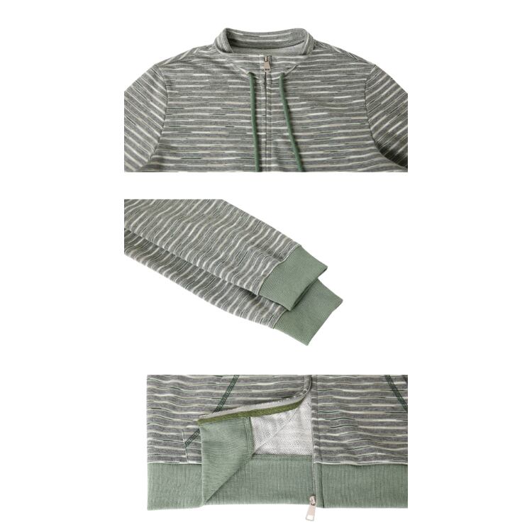メランジボーダー柄がシンプルながらもおしゃれ感を演出し、ジップアップデザインがさりげないアクセントに。