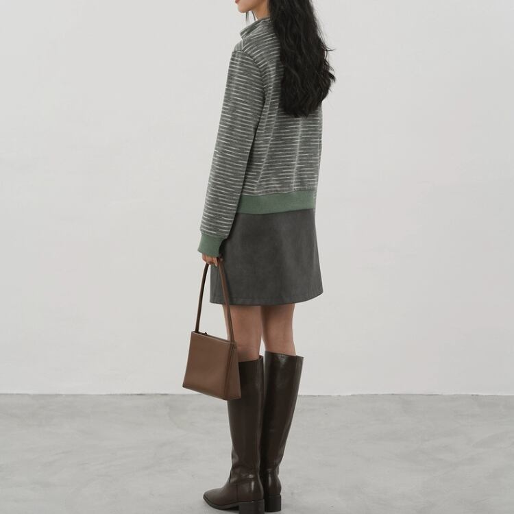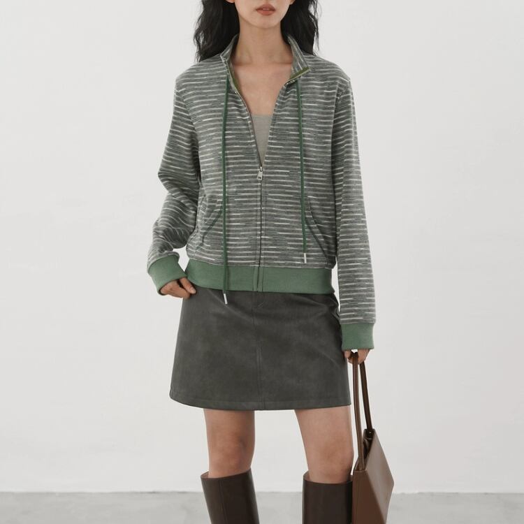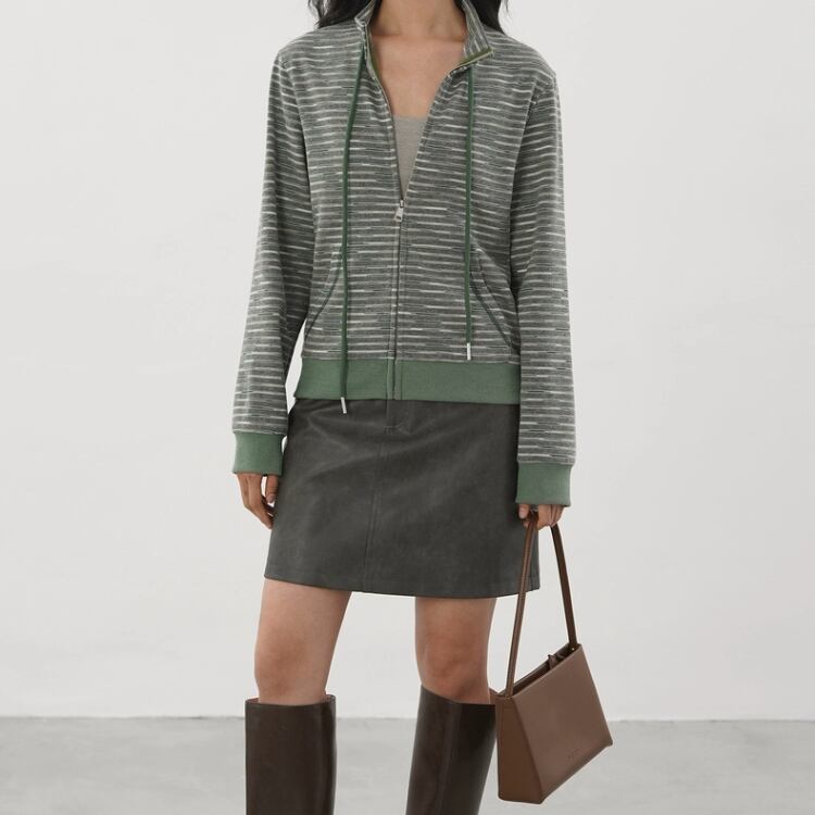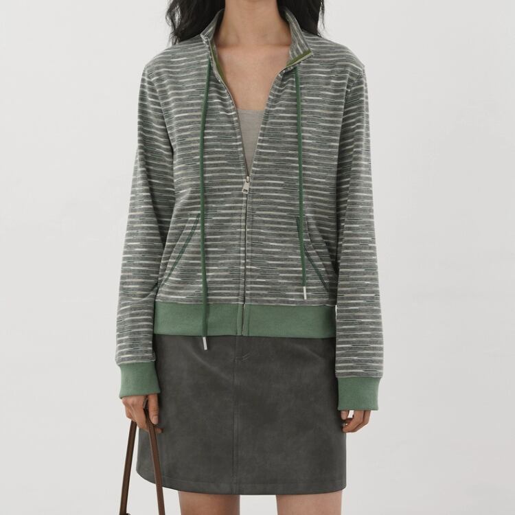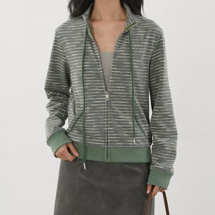 裏毛メランジボーダー柄スタンドネックジップアップカーディガン 1307