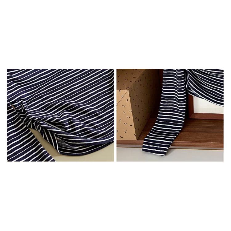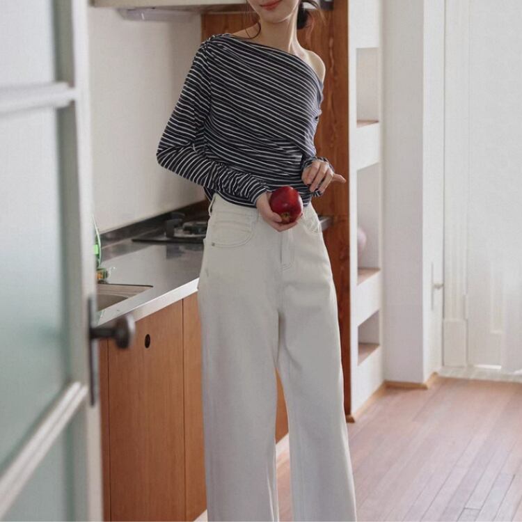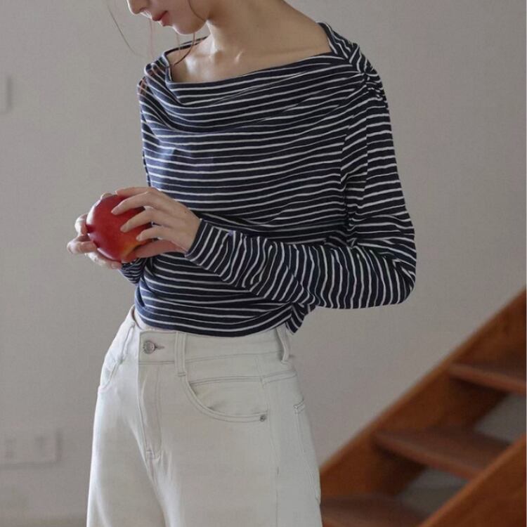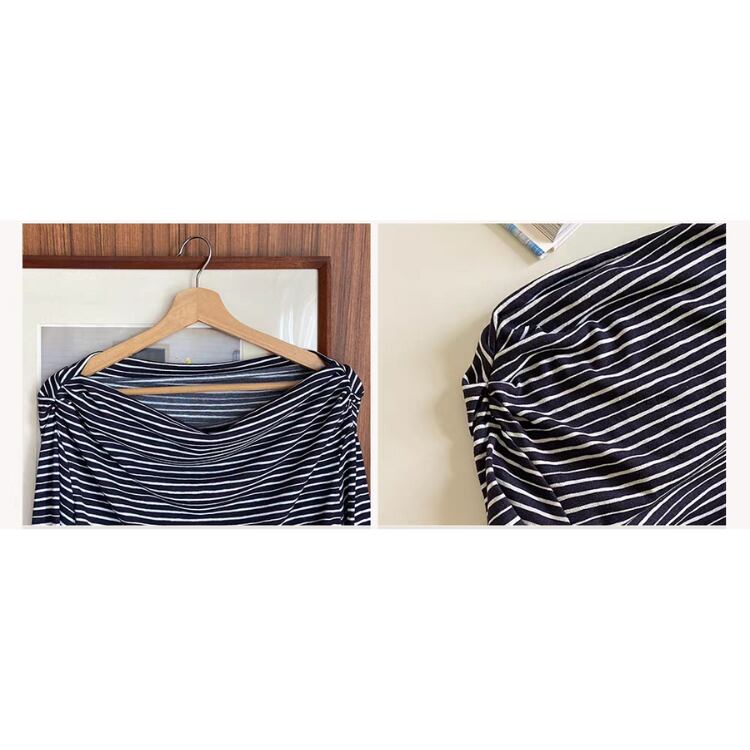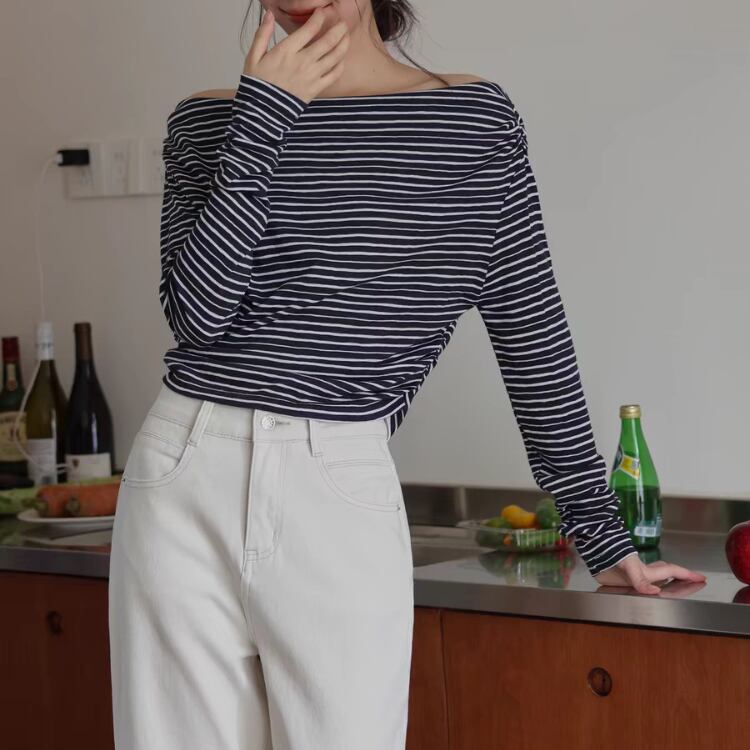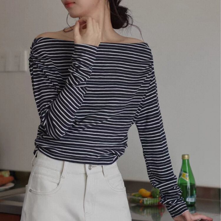 ボーダー柄肩裾ギャザー寄せオフショルダーカットソー 1299