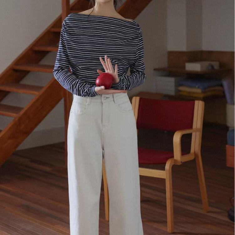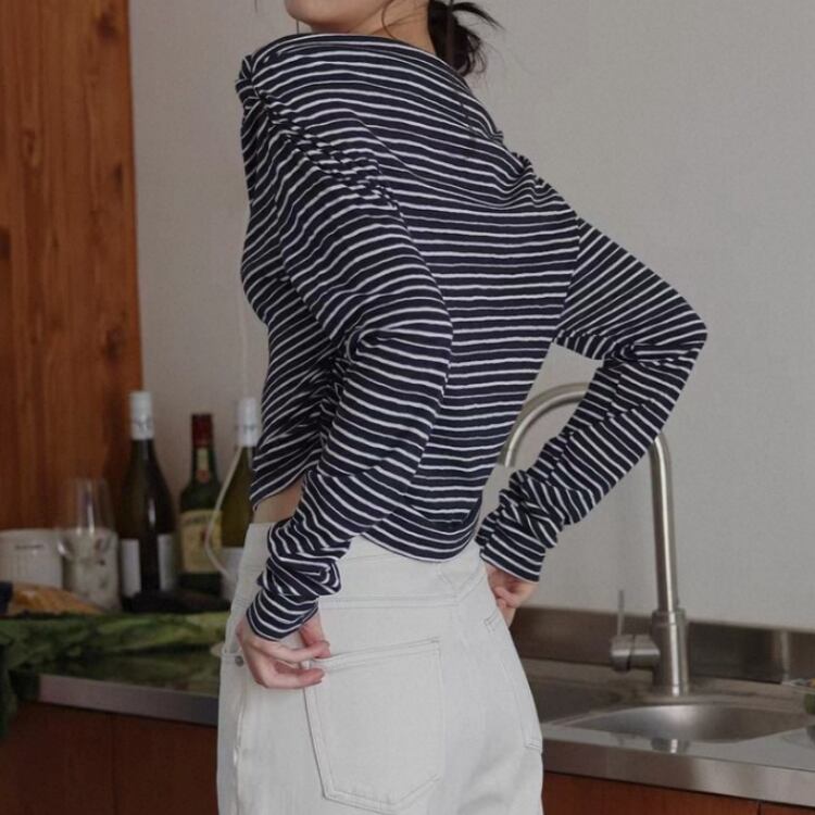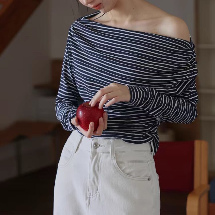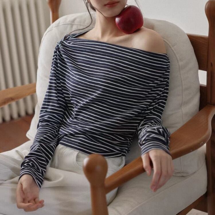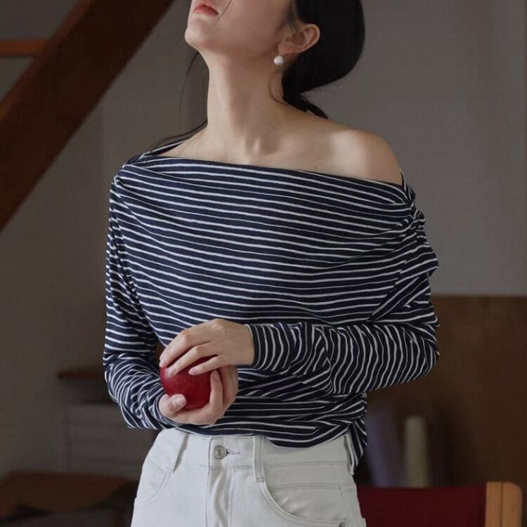女性らしい雰囲気を演出する、ボーダー柄のオフショルダーカットソーです。