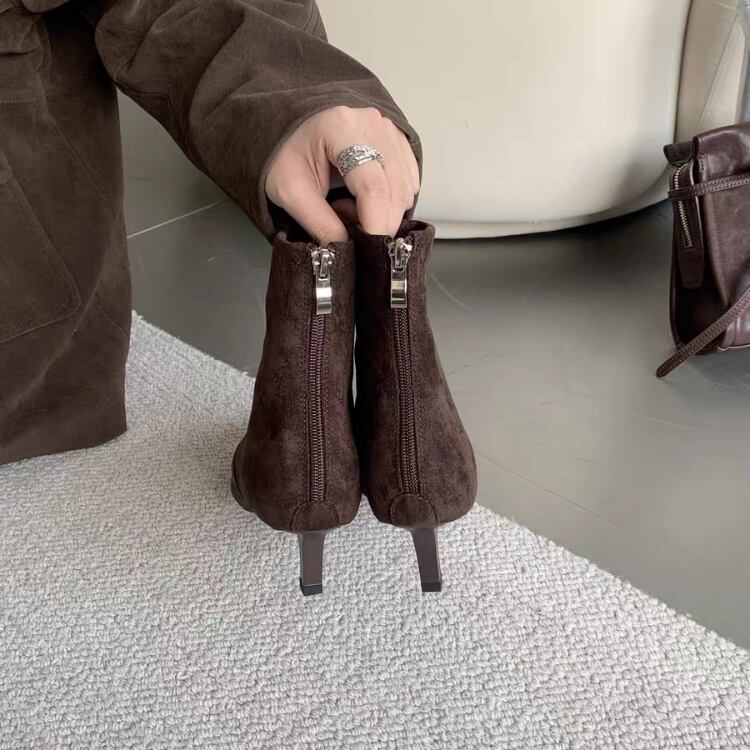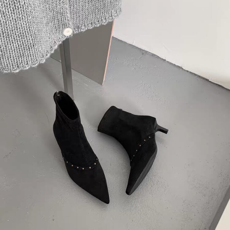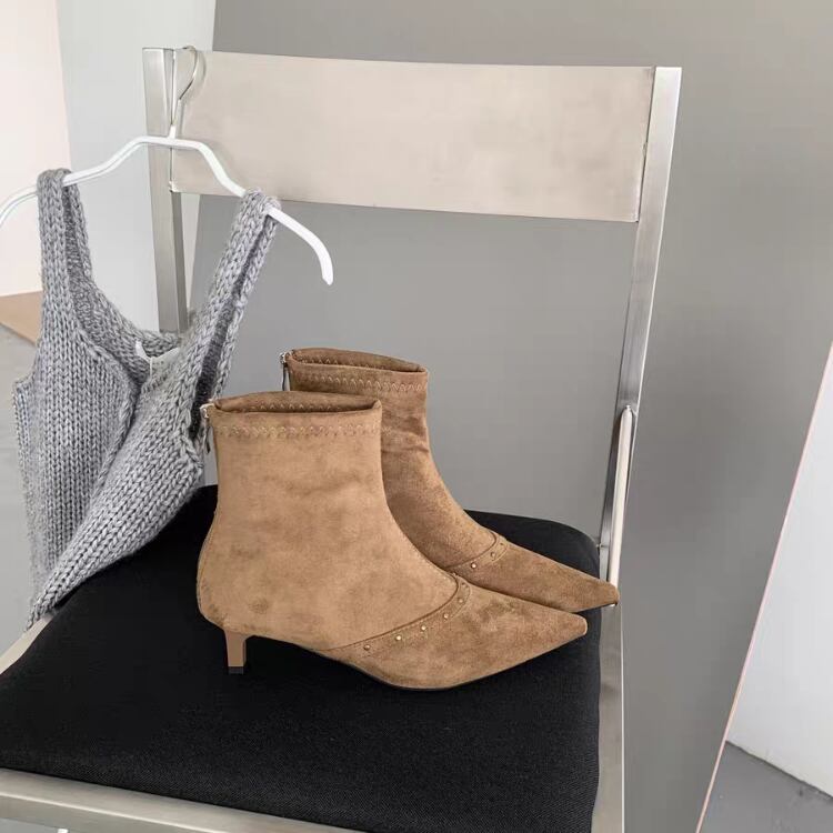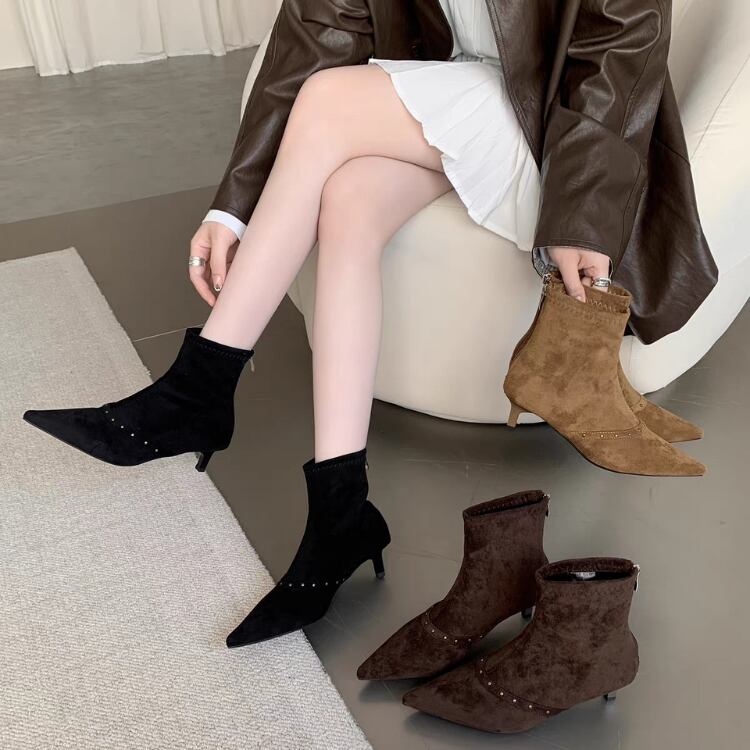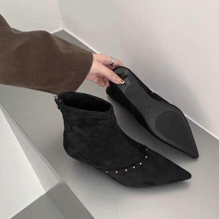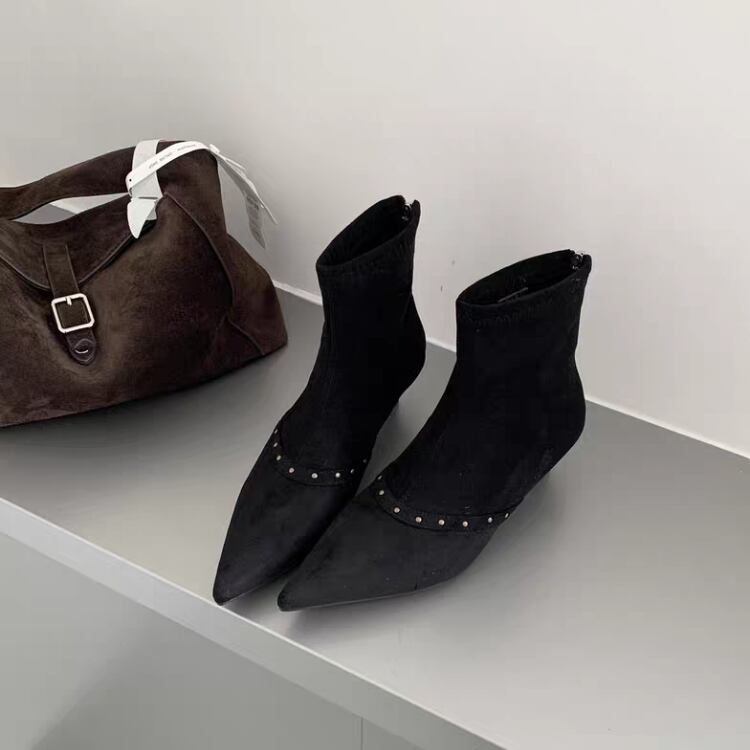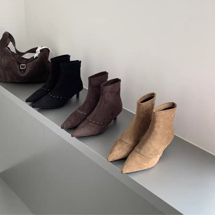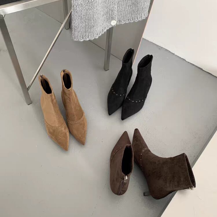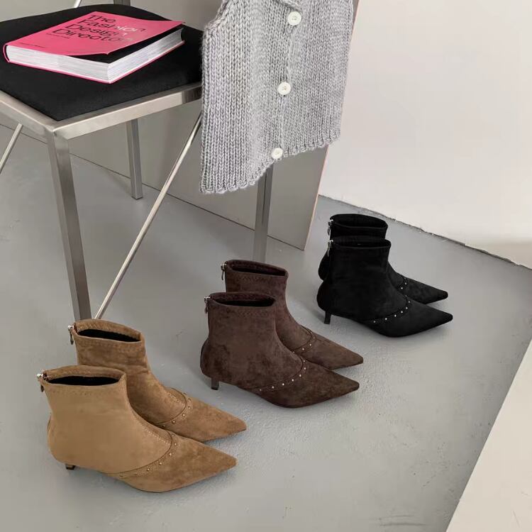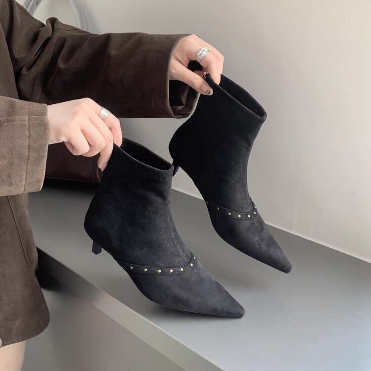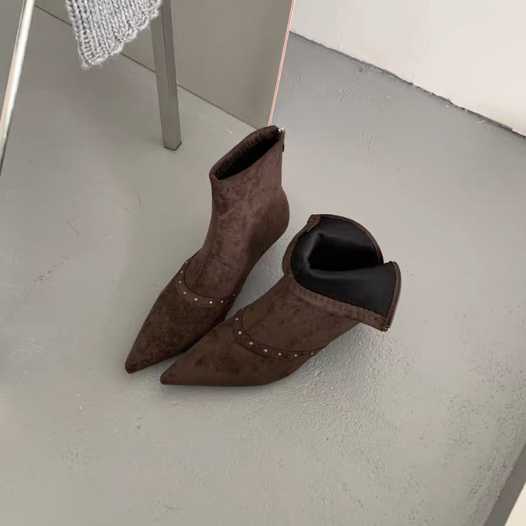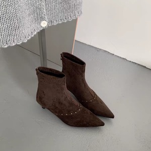 フェイクスエードスタッズインステップラウンド切替ピンヒールショートブーツ 1325