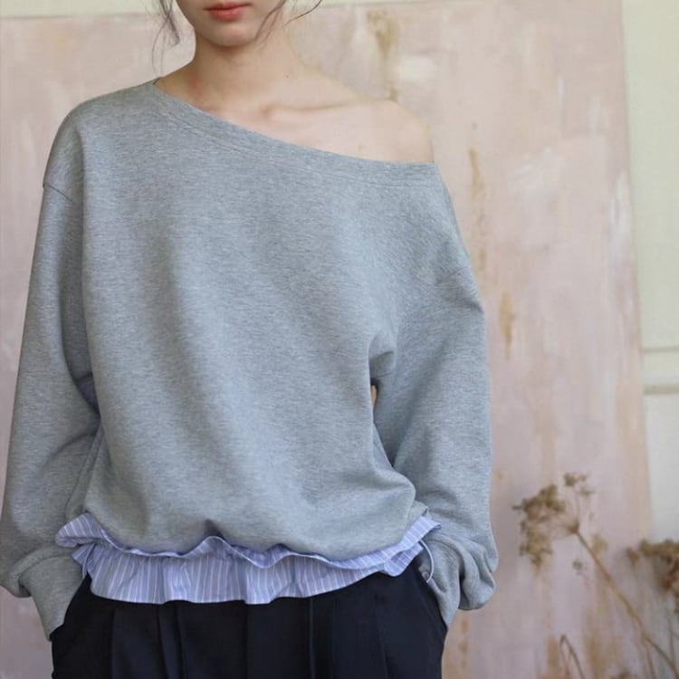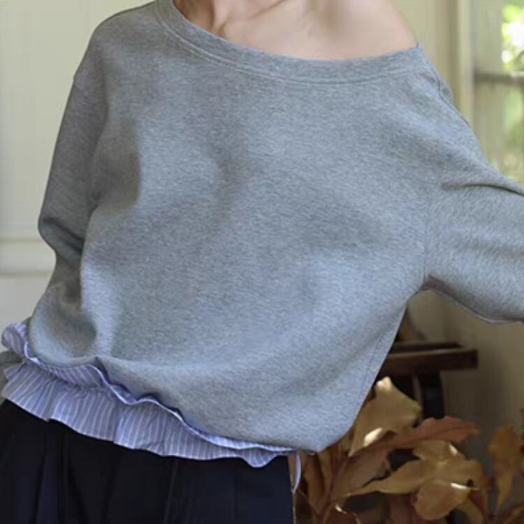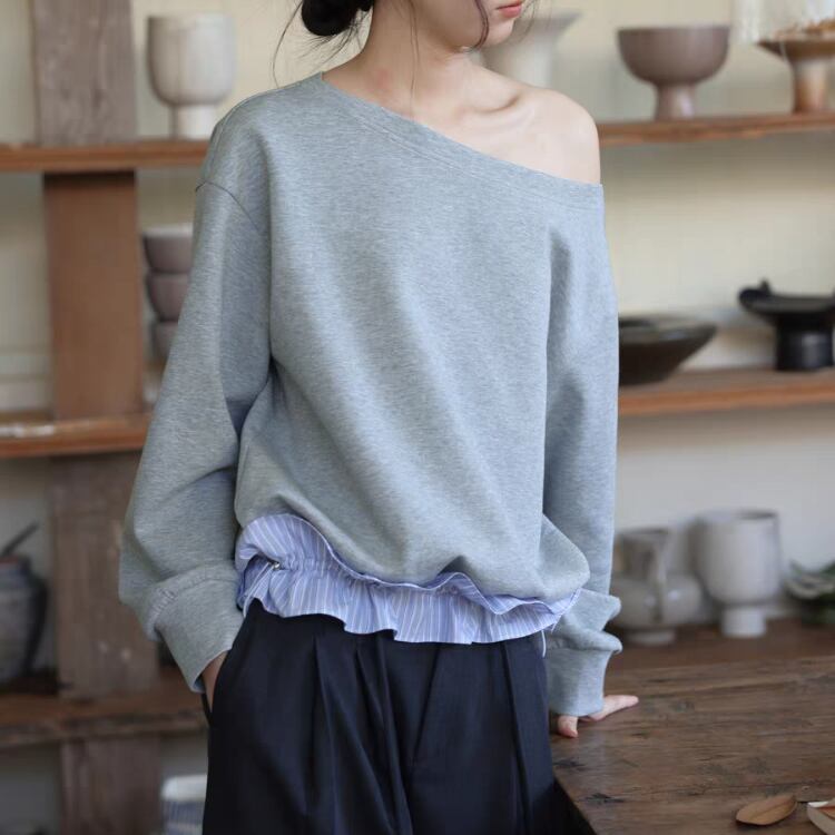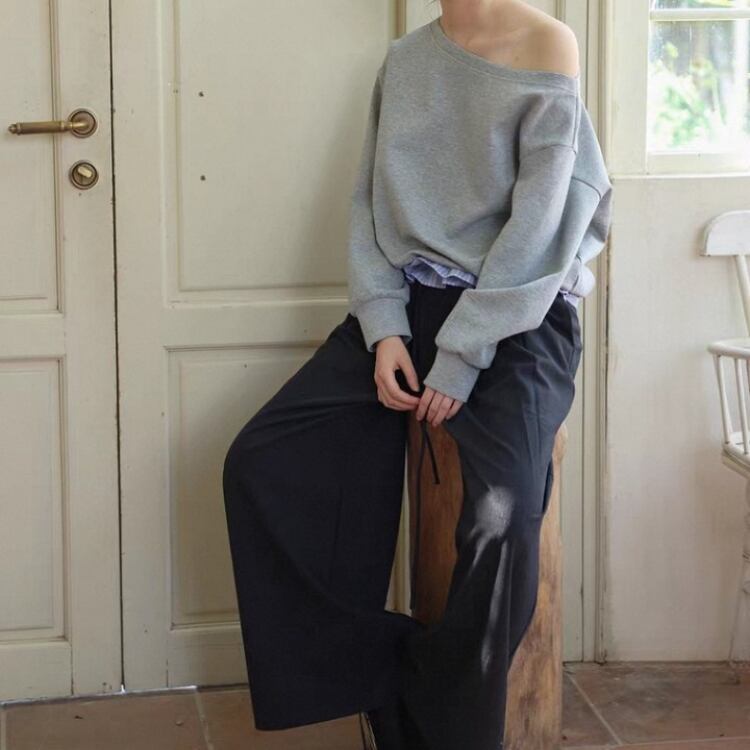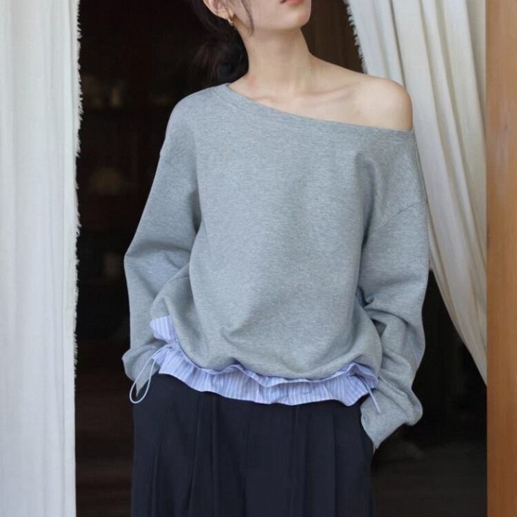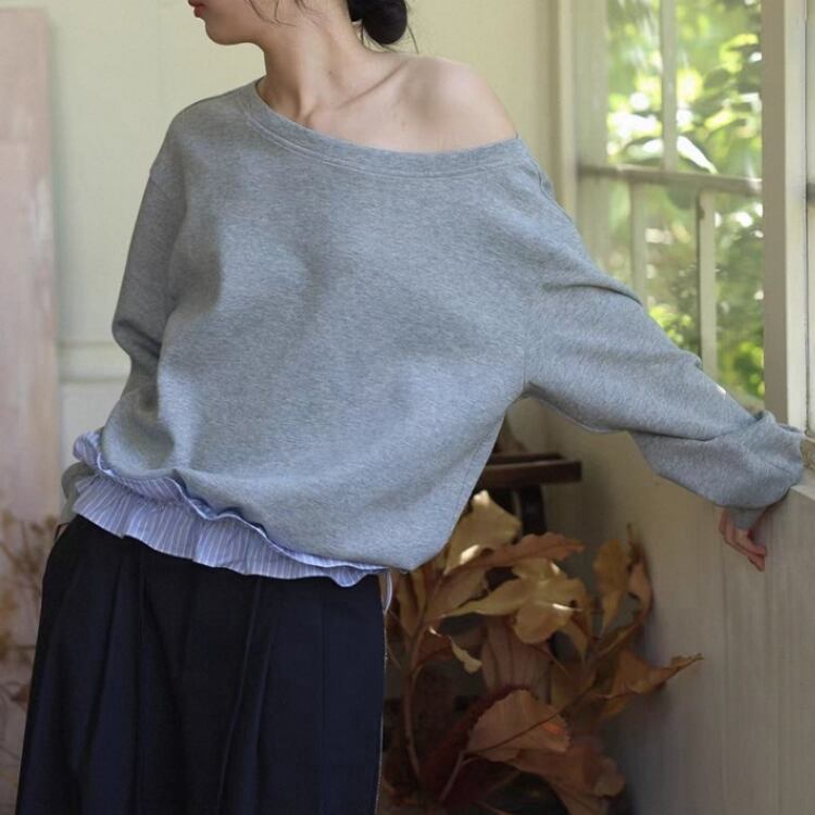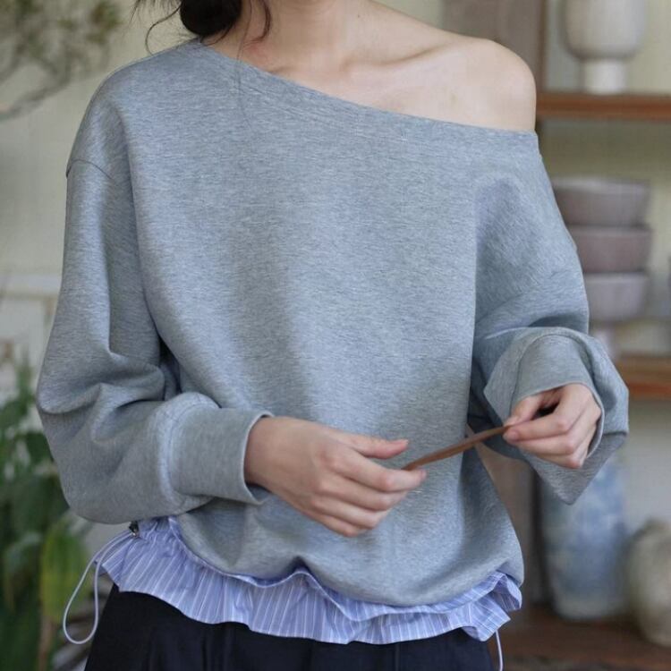 襟元が横に開いたボートネックスタイルで、ゆったりとしたシルエットが特徴です。