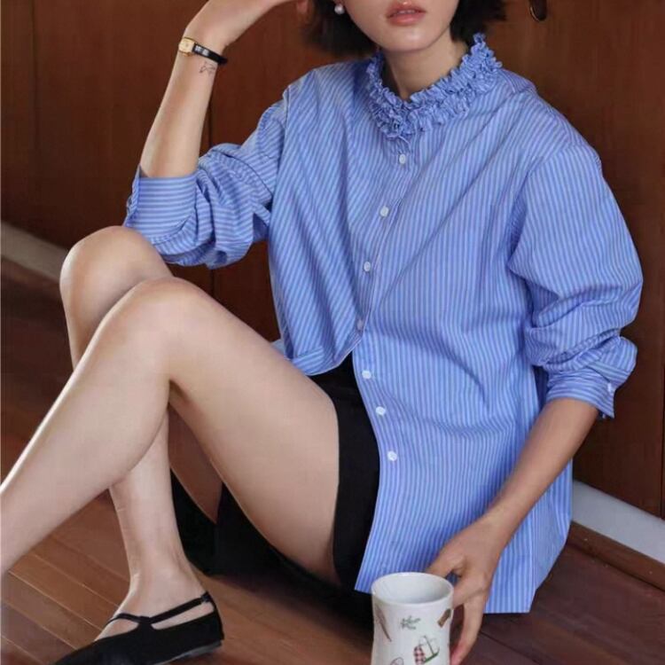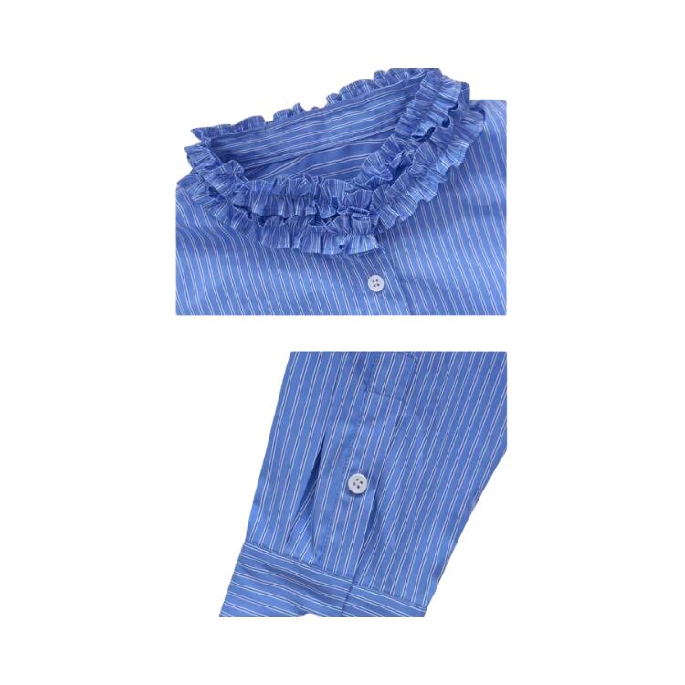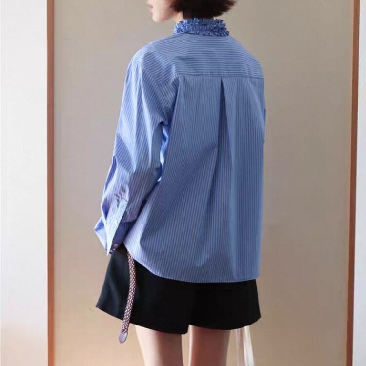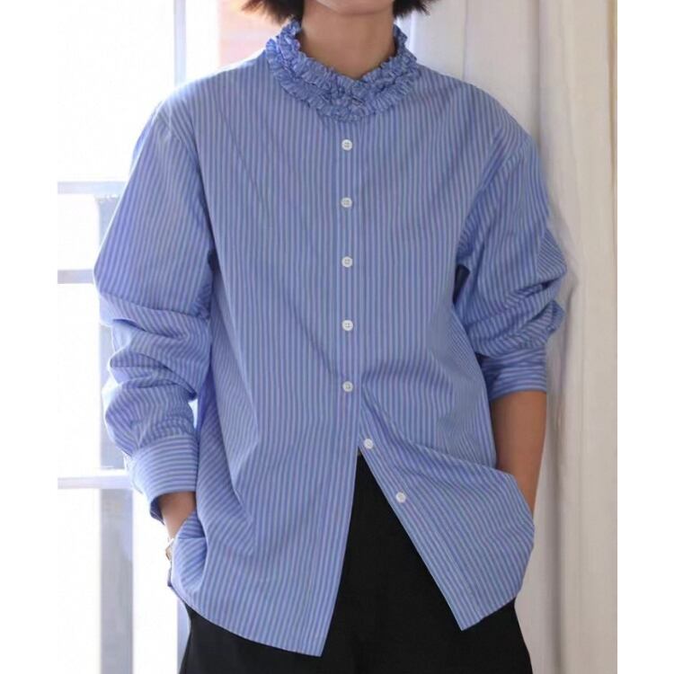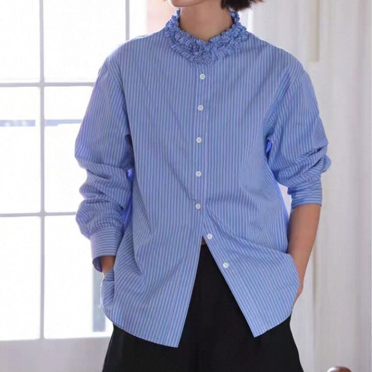 ストライプ柄タタキフリルネックブラウス 1358