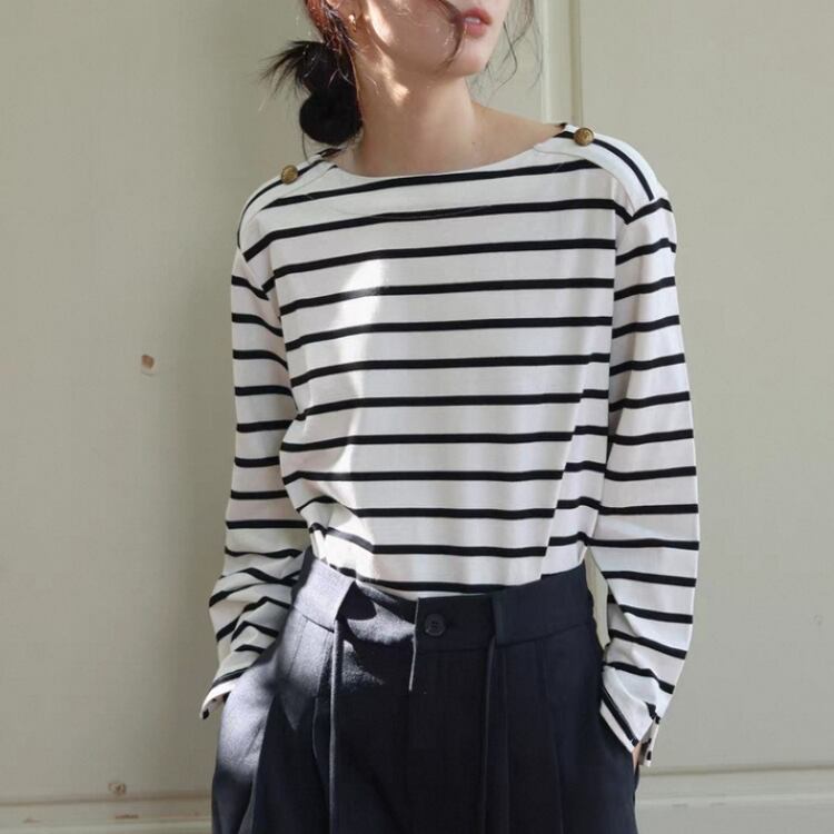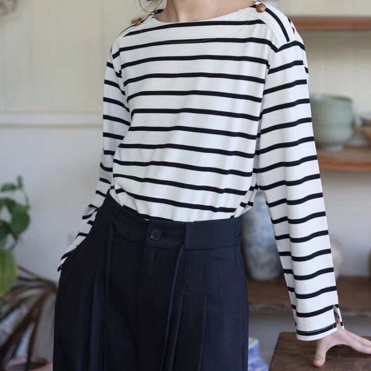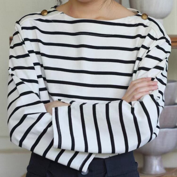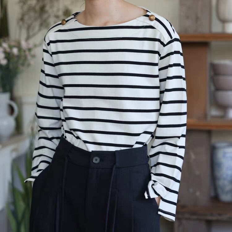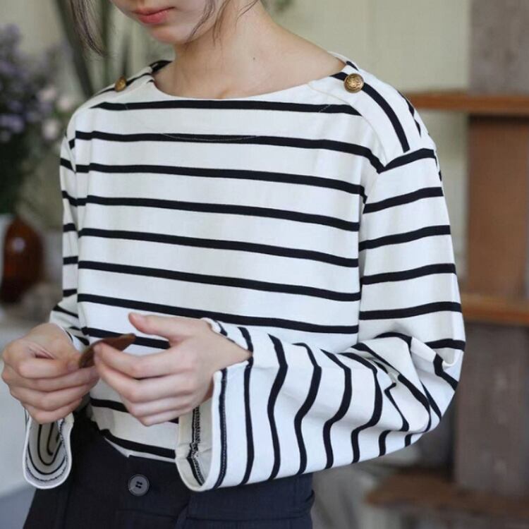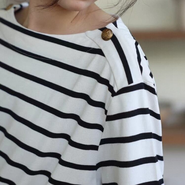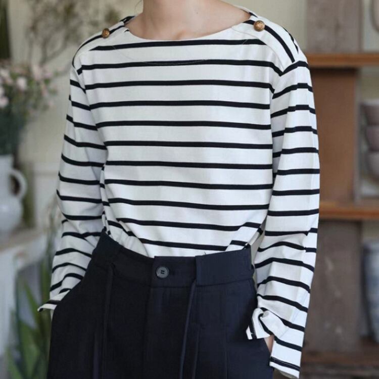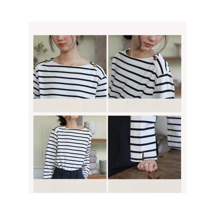 ボーダー柄ショルダー金釦ボートネックカットソー 1364