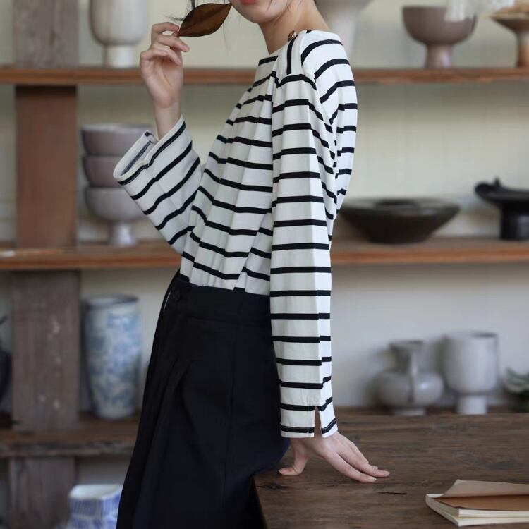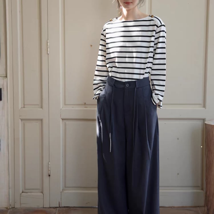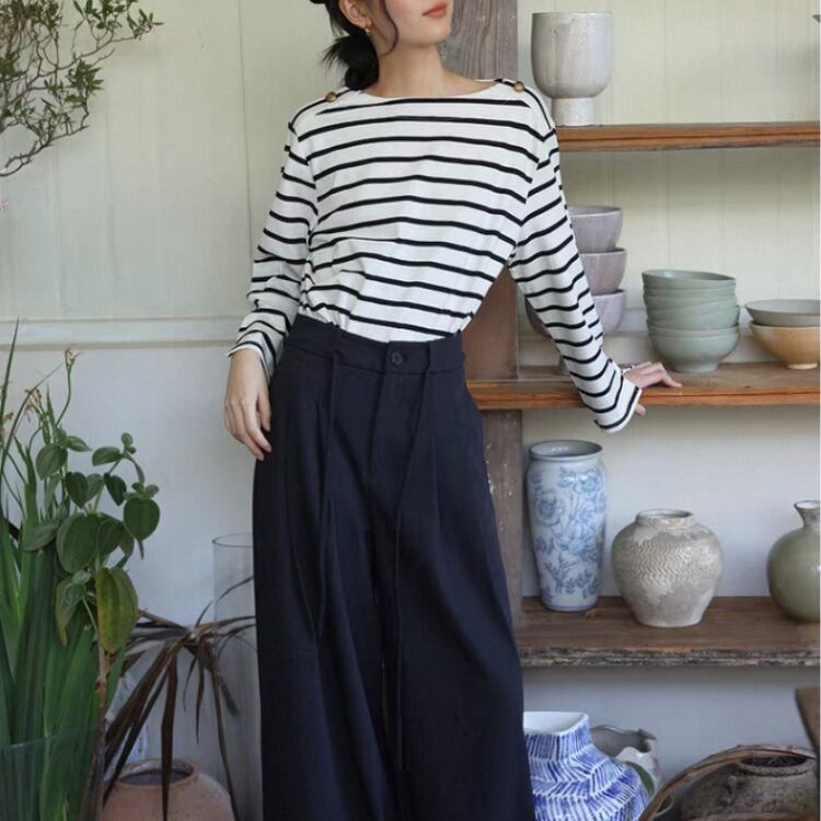 ボーダー柄とボートネックの端に施された金釦が、マリンテイストで着映えます。