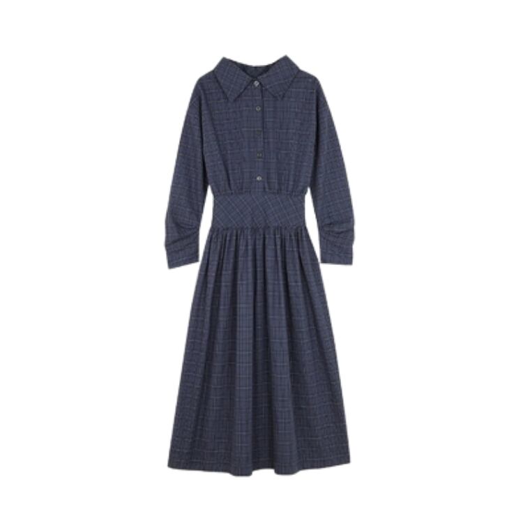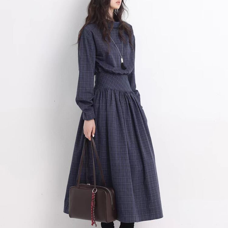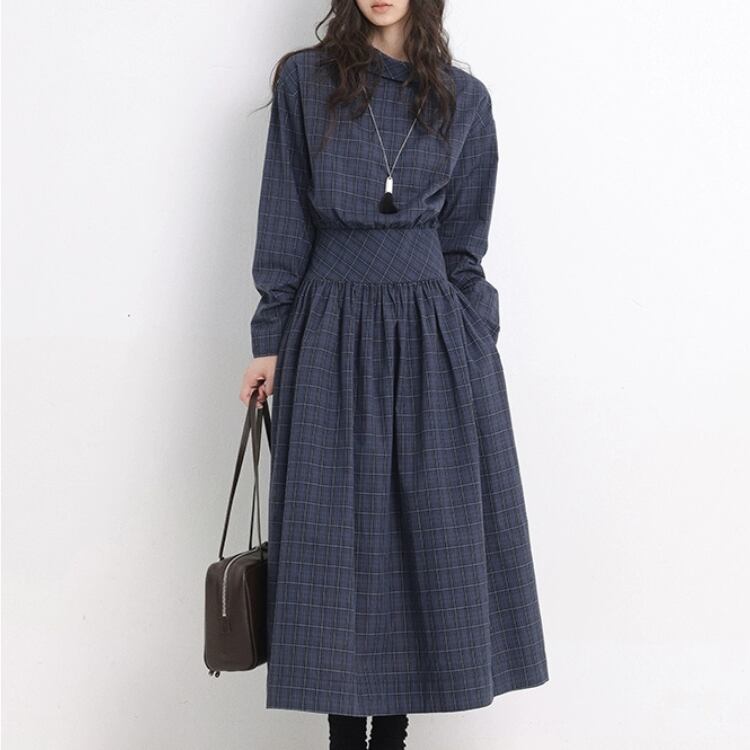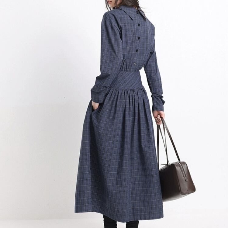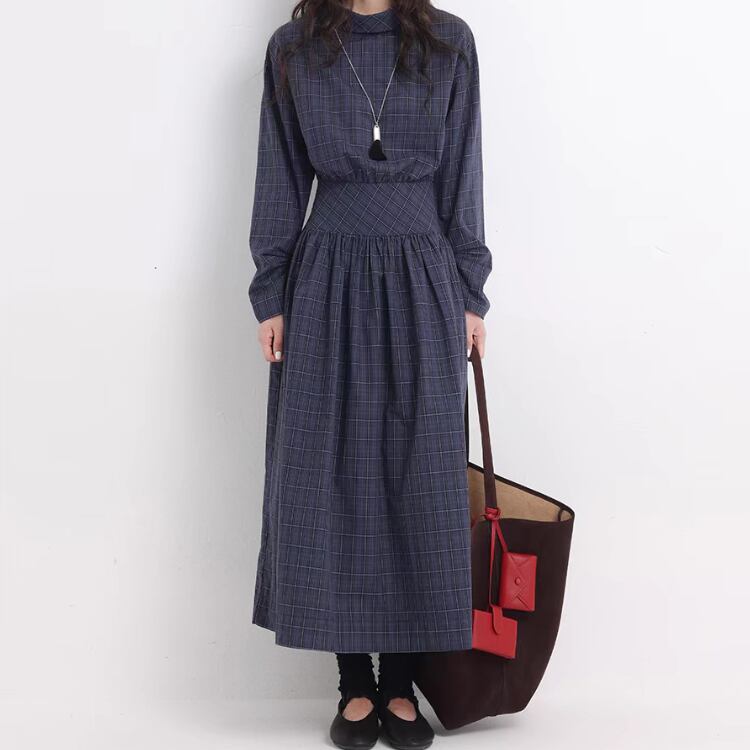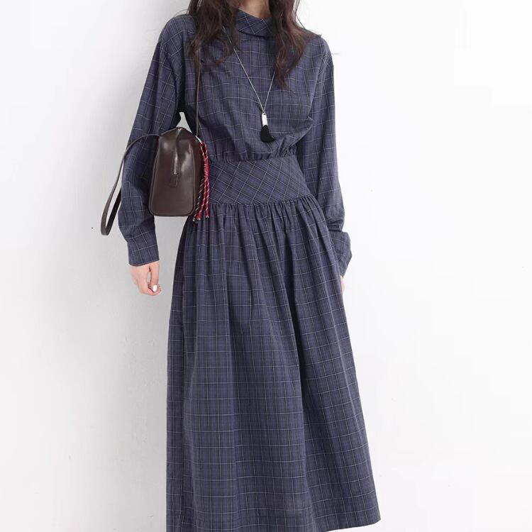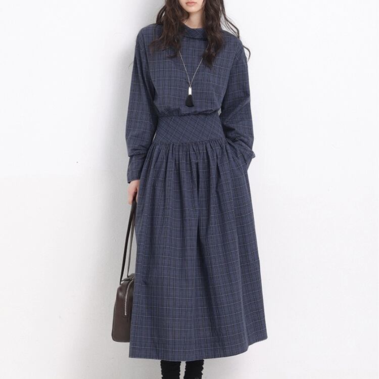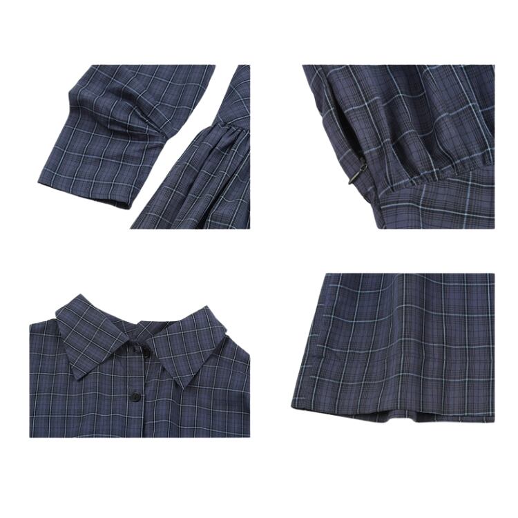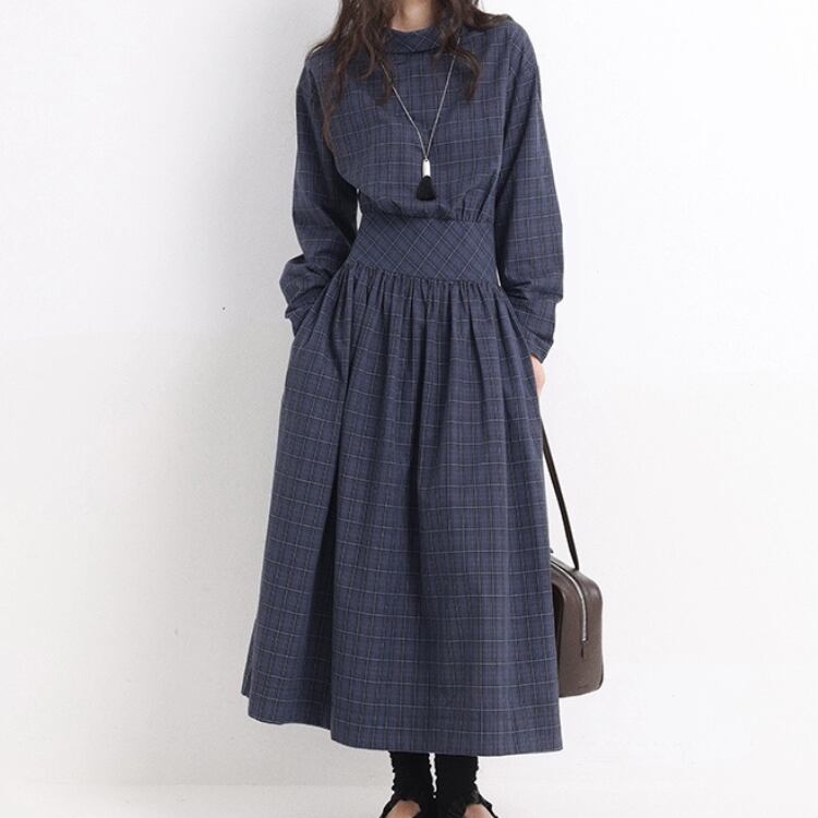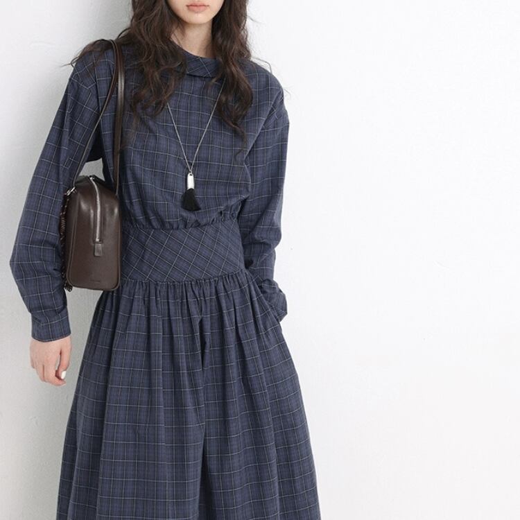 2WAY(スタンドカラー・シャツカラー)チェック柄ウエスト切替ワンピース 1375