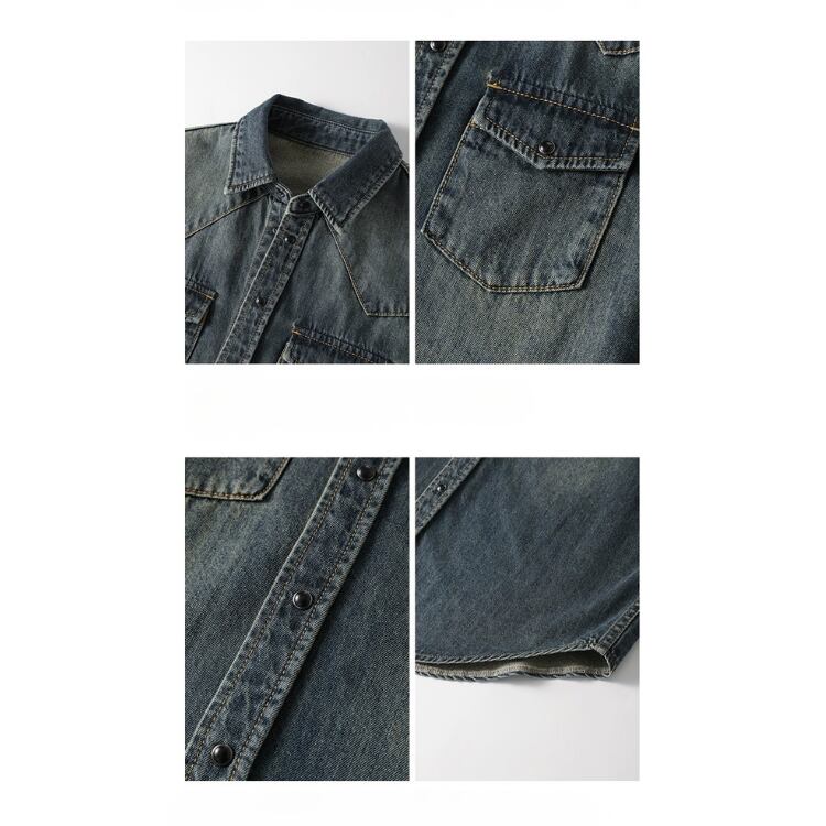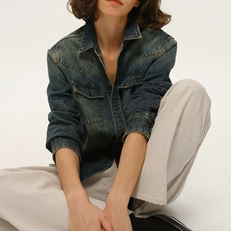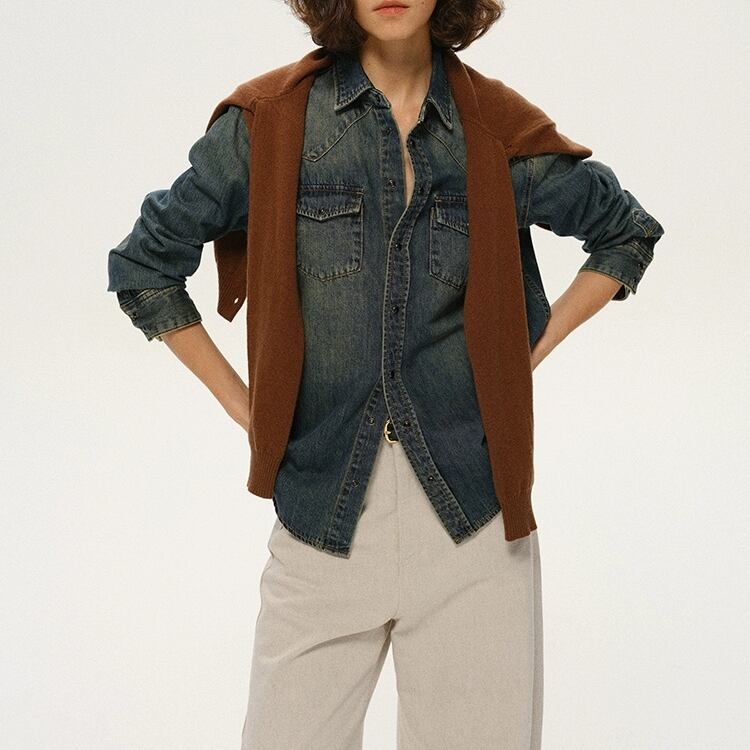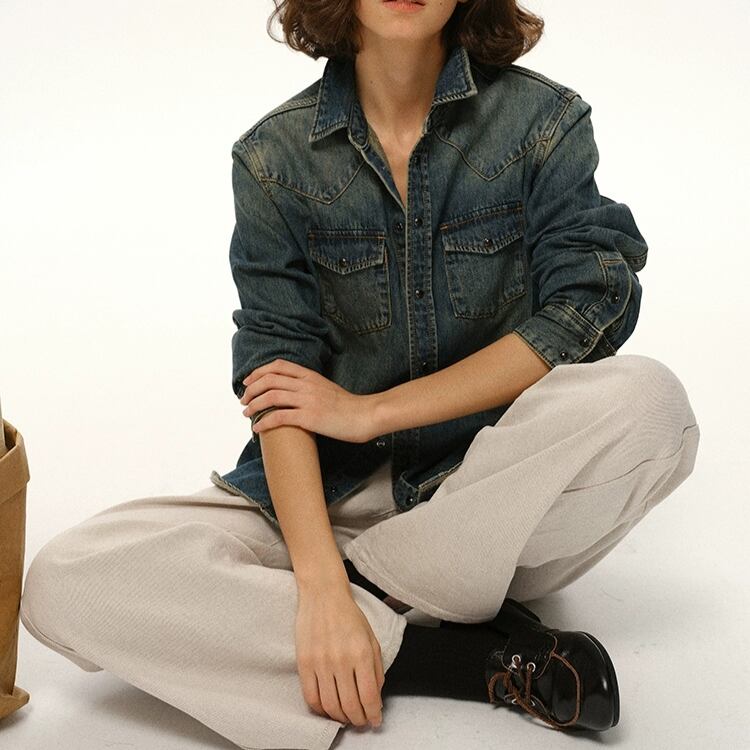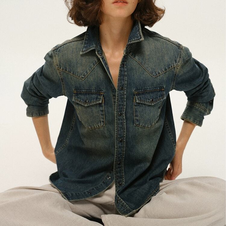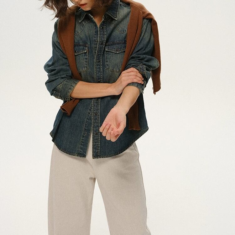 洗いをかけて色落ちさせたデニム素材のシャツです。