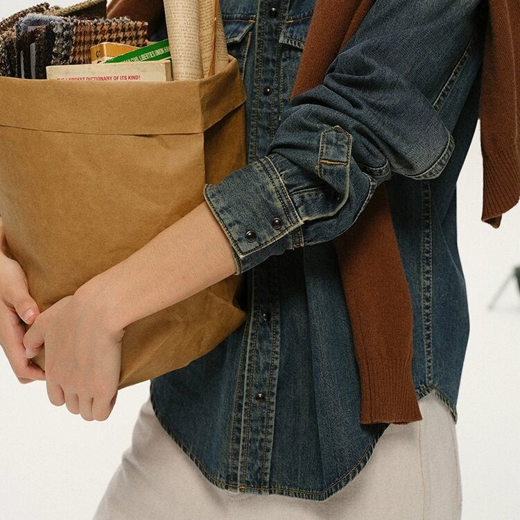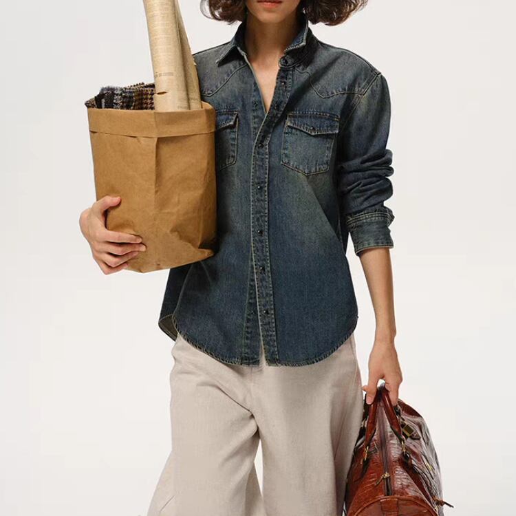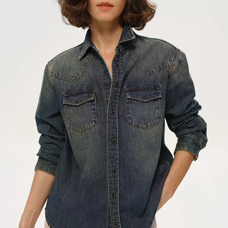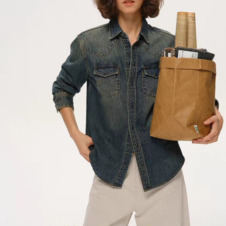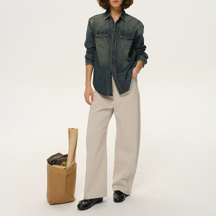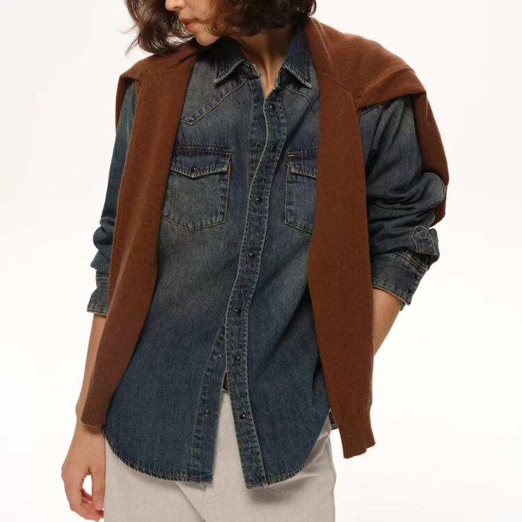 洗いをかけて色落ちさせたデニム素材のシャツです。