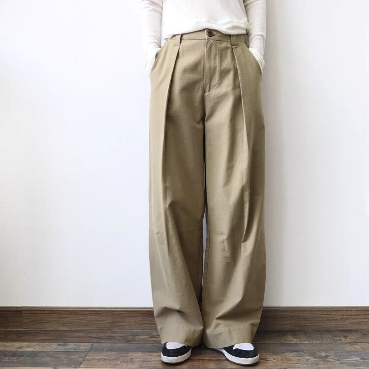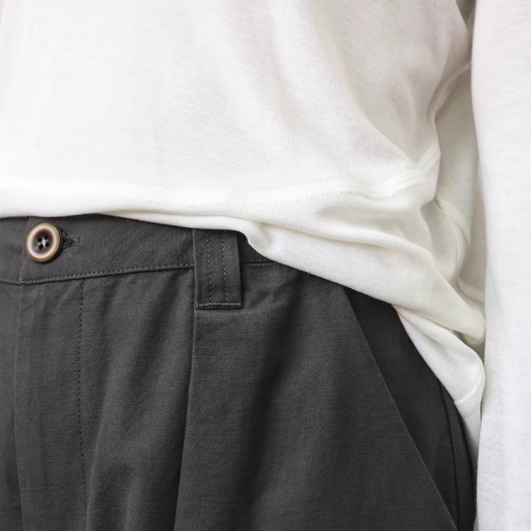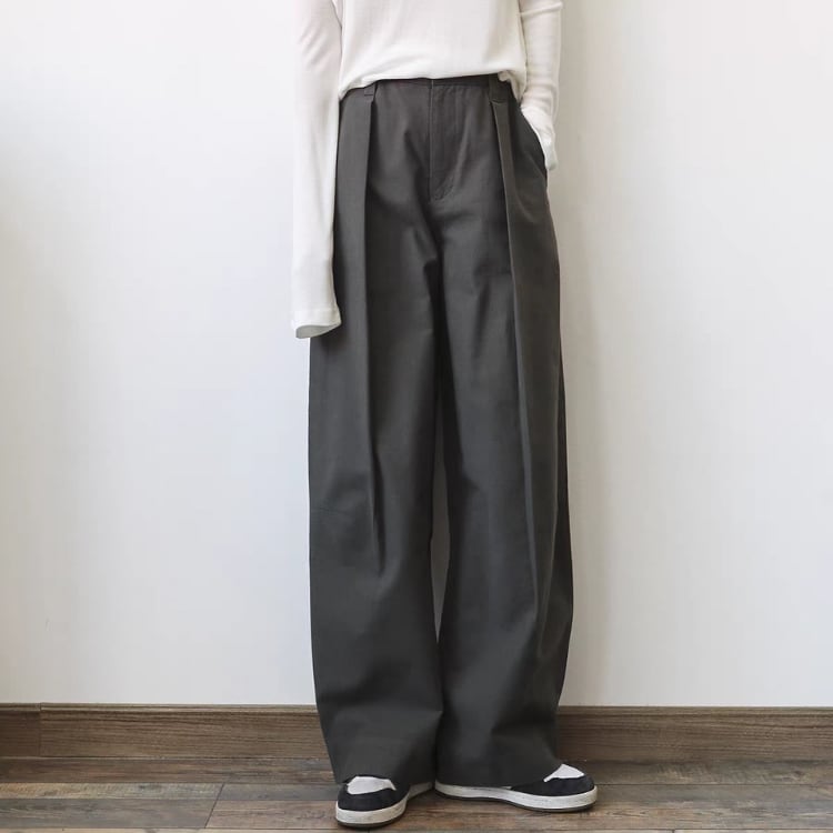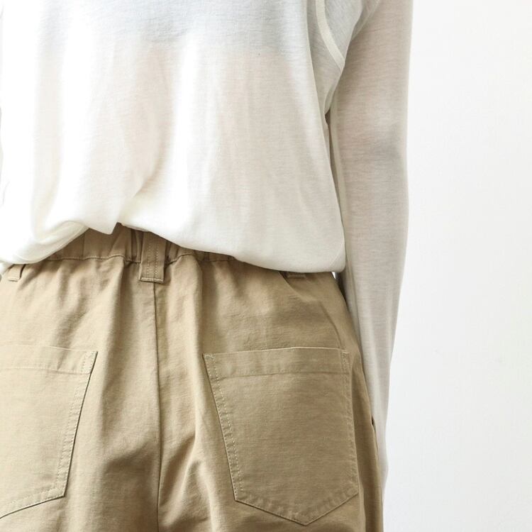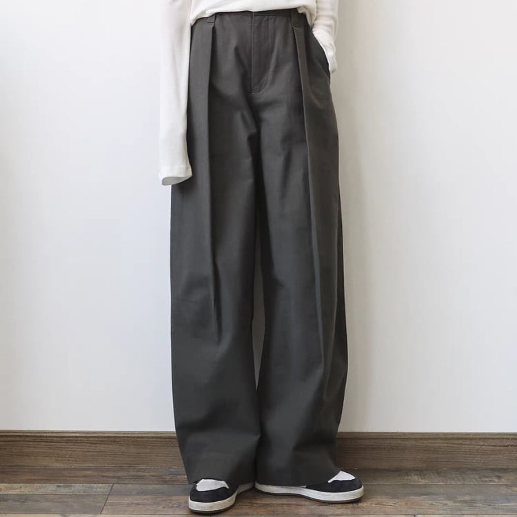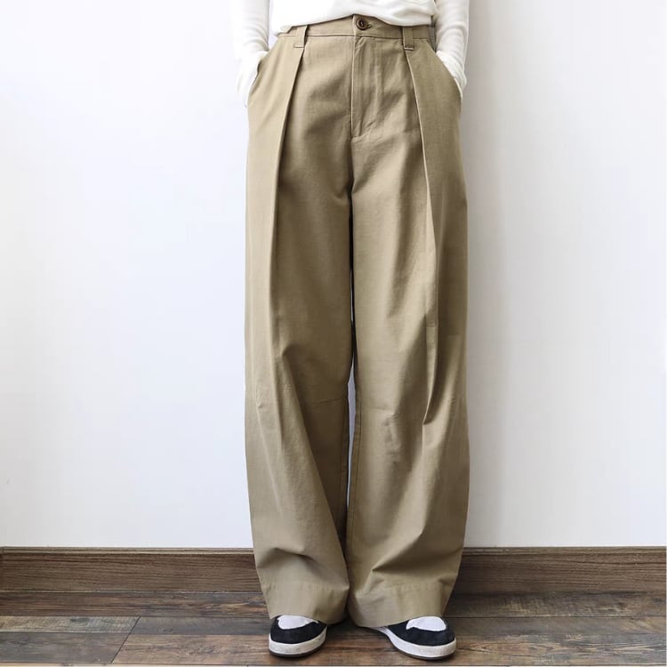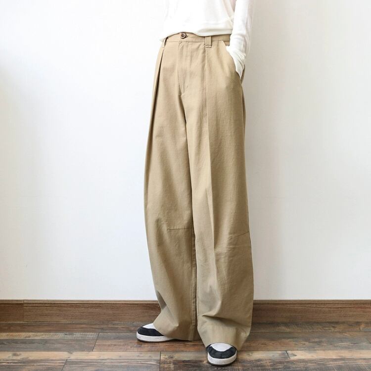張り感のある生地を使用しており、ゆったりとしたシルエットが嬉しいワイドパンツ。