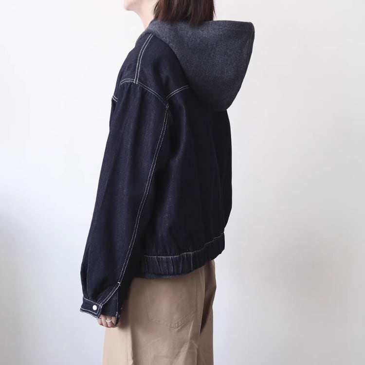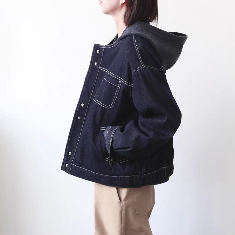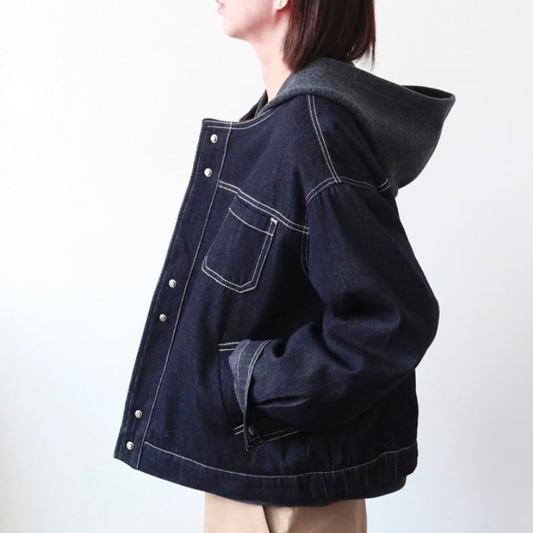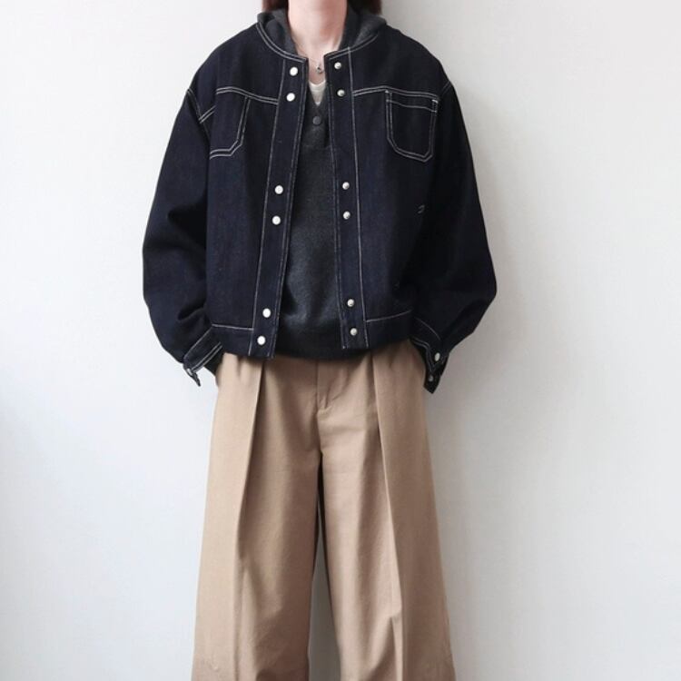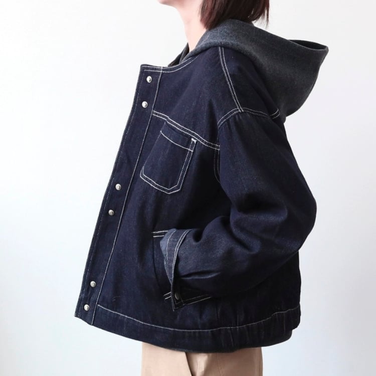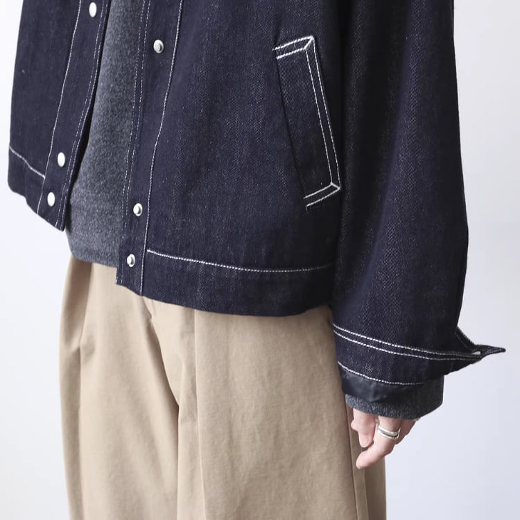 濃いネイビーのデニム生地に白のステッチを施した、シンプルながらもおしゃれに着映えるデニムジャケットです。