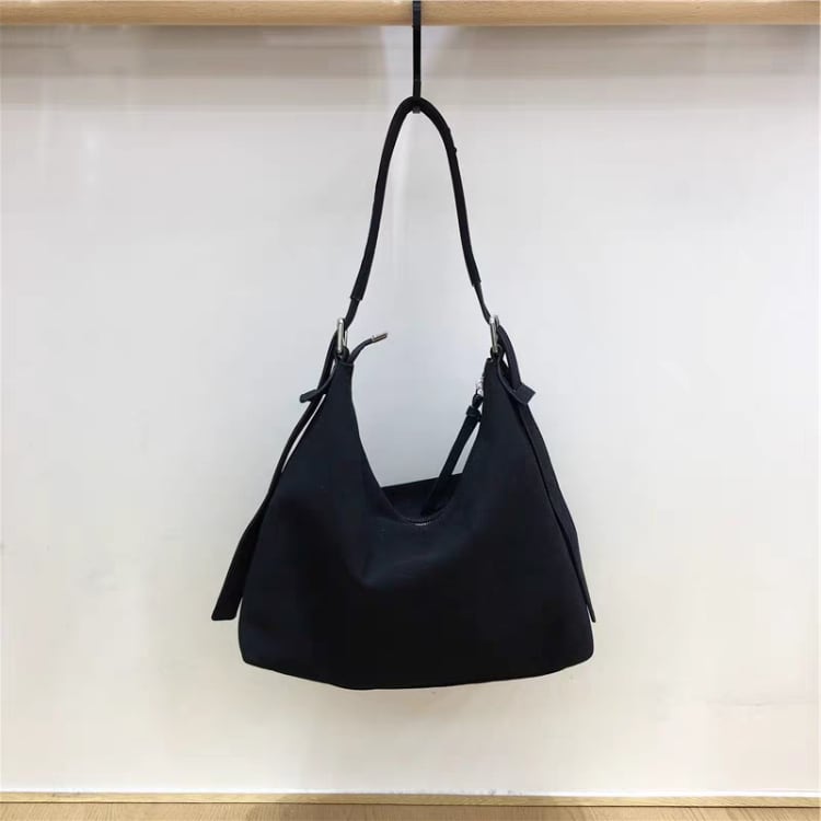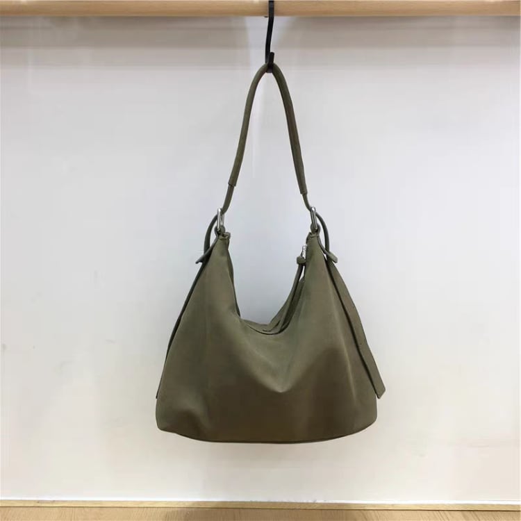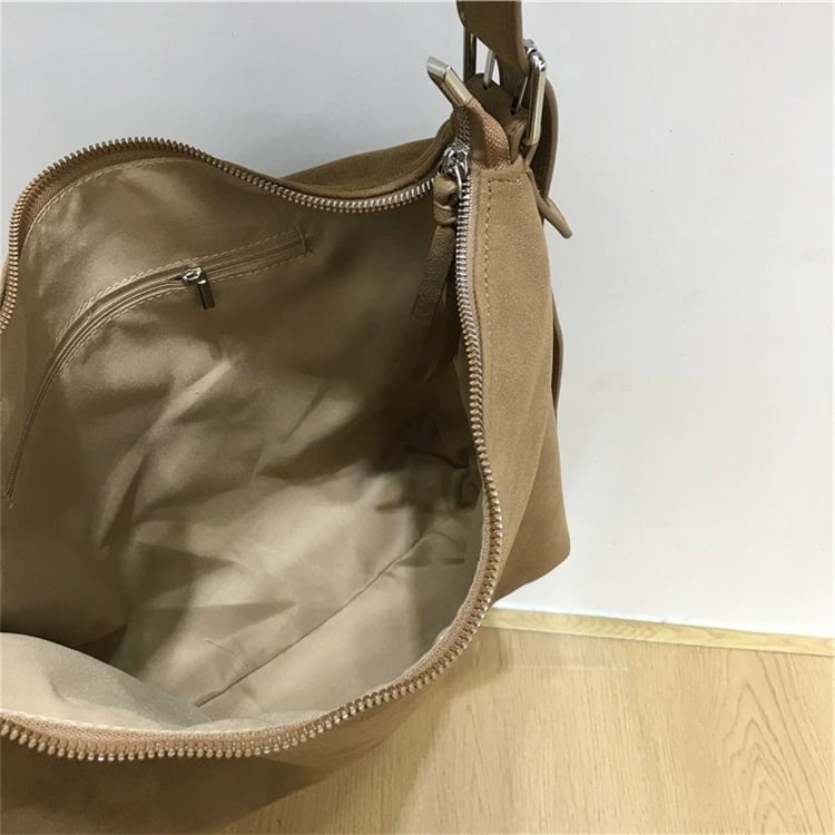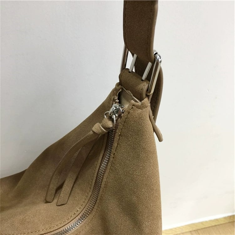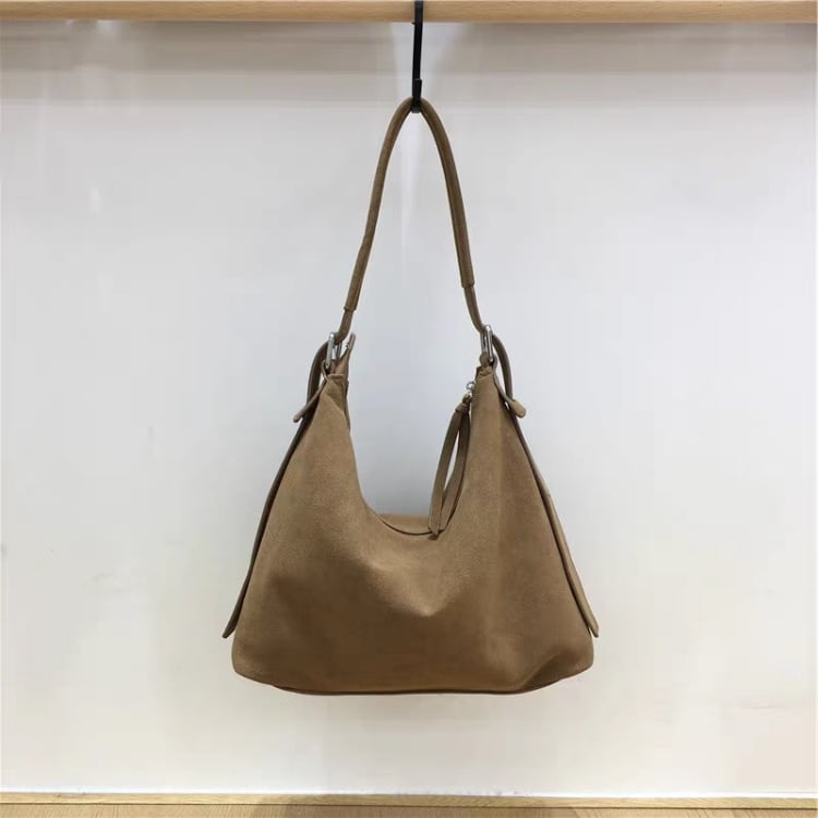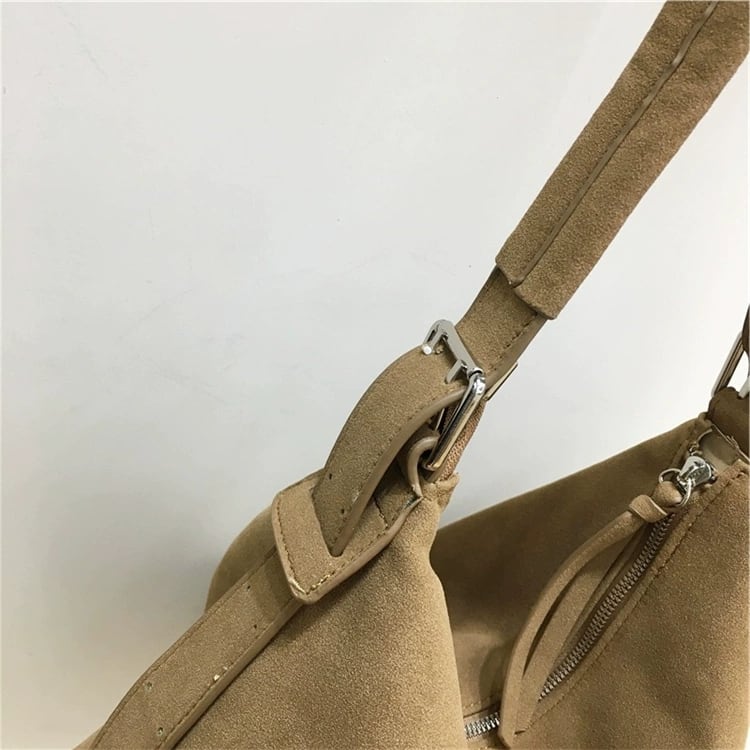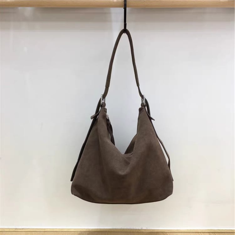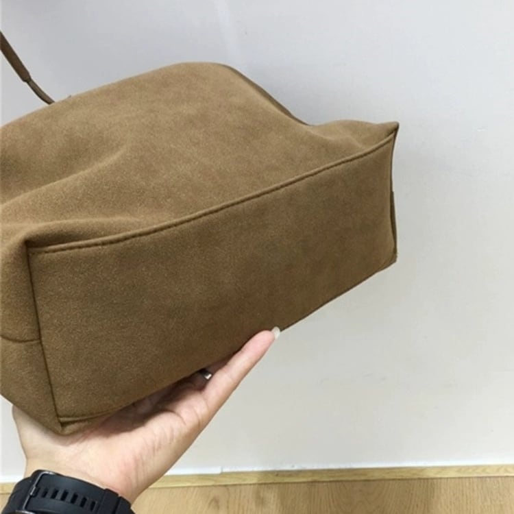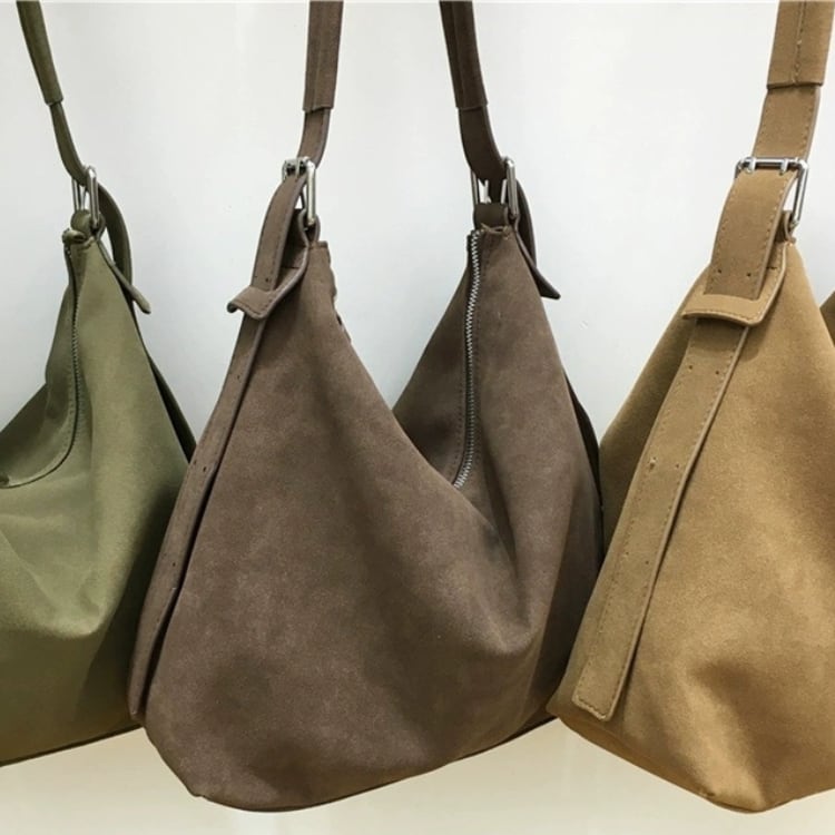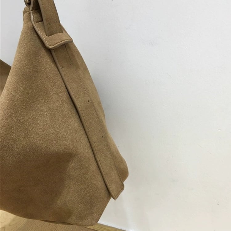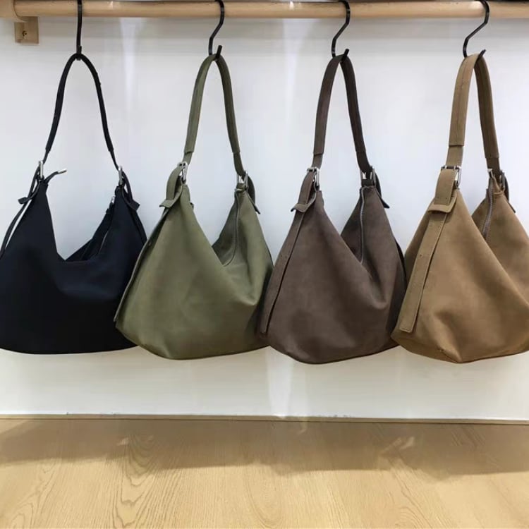 柔らかなフェイクスエードを使った、体の線に優しくなじむショルダーバッグです。